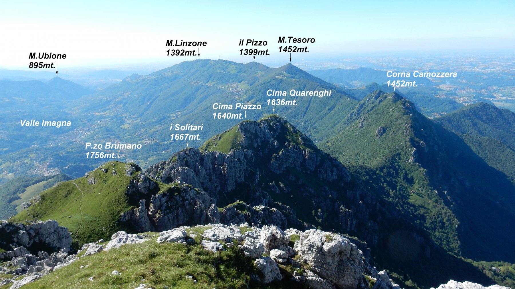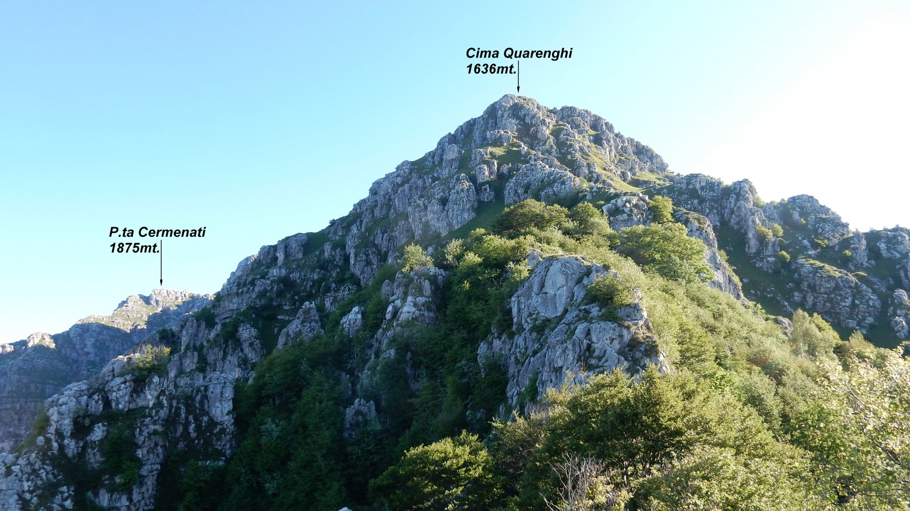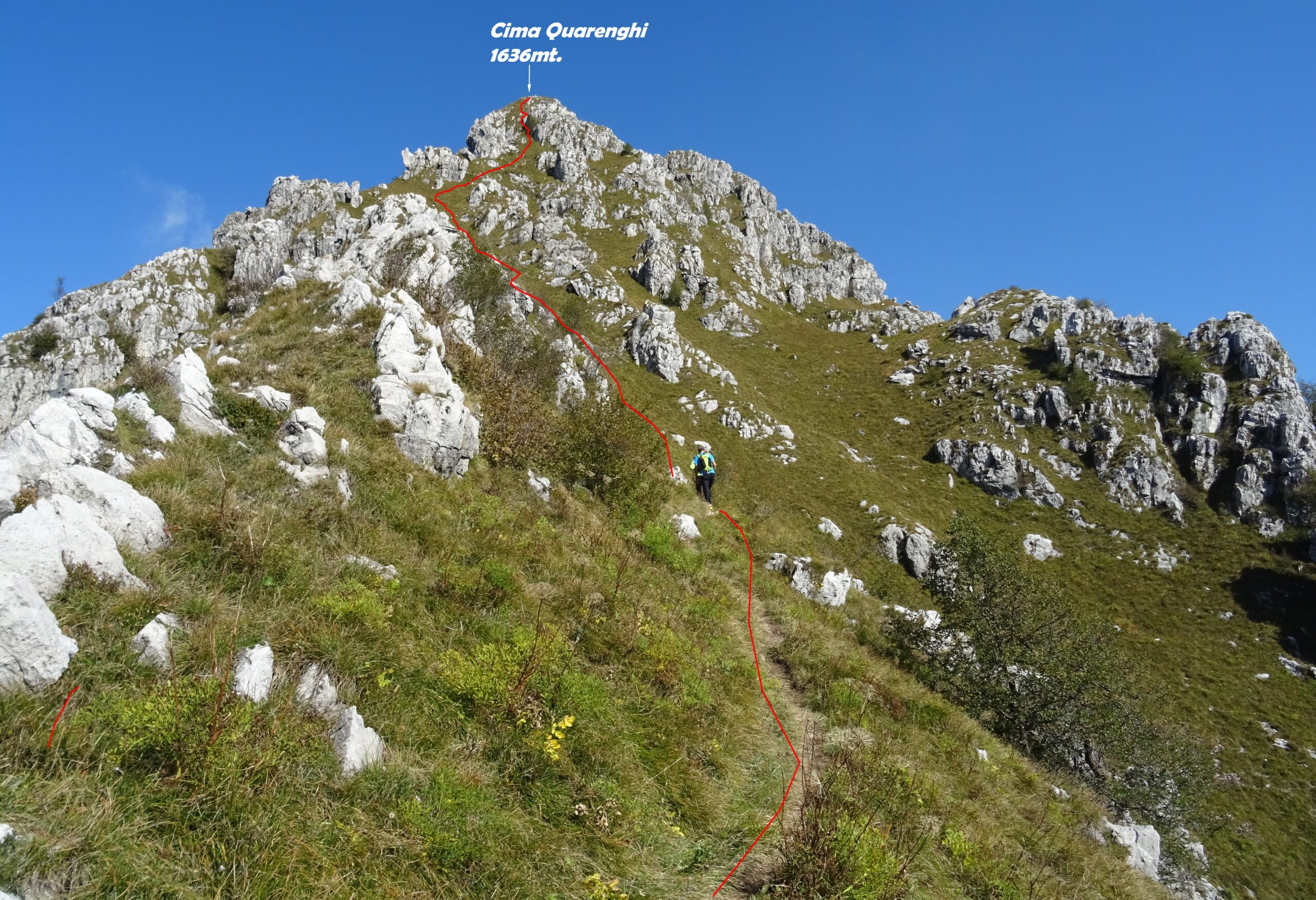 Il primo breve tratto e’ ancora nel bosco, con pendenze dolci, si supera un facile e breve tratto con catene, poi il percorso si fa in campo aperto e si impenna con belle e notevoli pendenze, alternati ad alcuni tratti in traverso, raggiungendo la prima vetta della lunga cresta sud, la Quarenghi 1636 m, con cippo e medaglione in bronzo in ricordo di Giacomo Quarenghi.