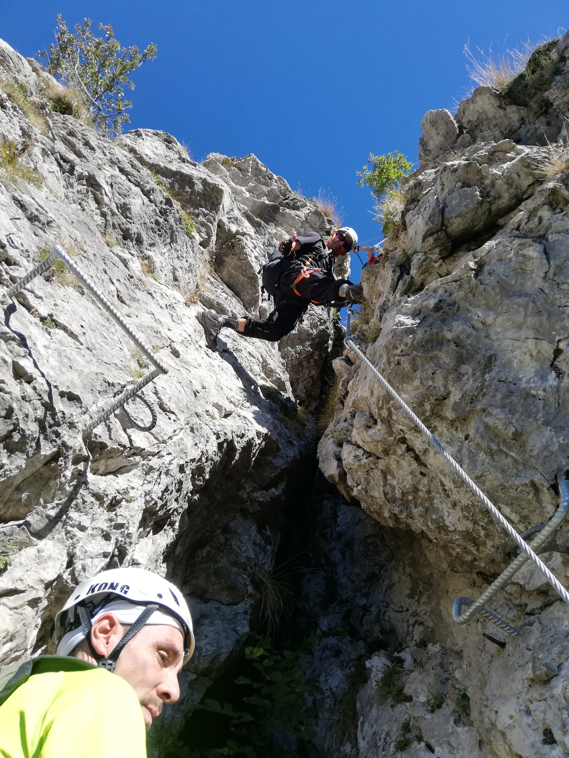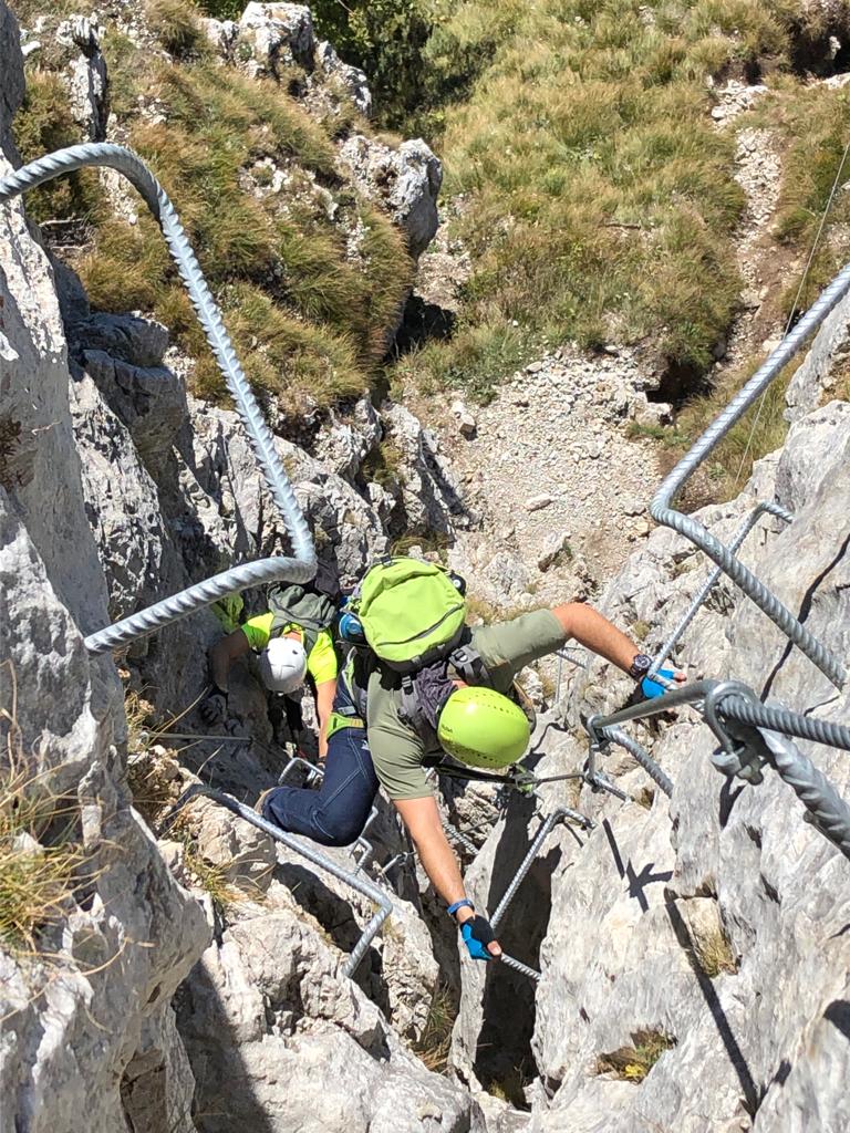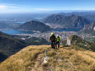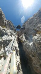 Fatta per la prima volta, concatenata facendo prima la gamma 1. Diversamente dalla prima questa è dura. Sicuramente l’attrezzatura precedente immagino la rendesse ancora più severa, ma anche così non è sicuramente una ferrata per principianti o persone fuori forma. In realtà io sono palesemente fuori forma, mi ha semplicemente ” salvato” il fatto che abitualmente faccio falesia, vie lunghe e alpinismo, e ovviavo con la tecnica alla forza richiesta. Ma comunque la stanchezza mi ha rallentato parecchio, ci abbiamo messo 2.30 ore dall’attacco, ma con un po’ di birra in più si può togliere parecchio tempo. Da non sottovalutare. Comunque la ferrata è bella, in un bel contesto, attrezzata con criterio e assolutamente in modo non troppo abbondante ( chi pensa ci siano troppe cambre provi a farsi un giro in quasi tutte le ferrate zona Torino /Cuneo, poi ne parliamo…). Dalla cima mezz’ora per punta Cermenati, un trilione di persone all’Azzoni, è stato impossibile prendere da bere anche solo da asporto. In discesa le mie ginocchia, o quello che ne rimaneva, ci hanno fatto optare per una risalita fino ai piani D’erna e dopo 2 medie corroboranti una comoda discesa in funivia.