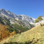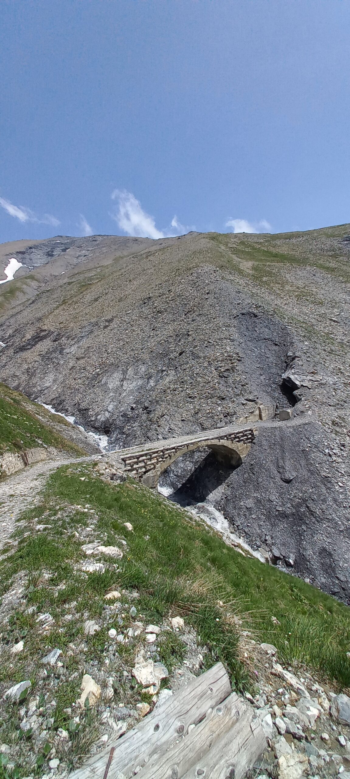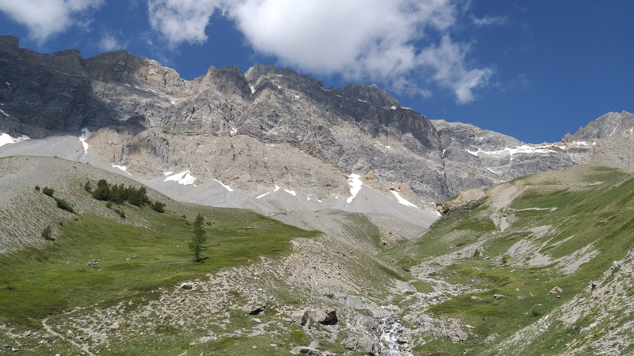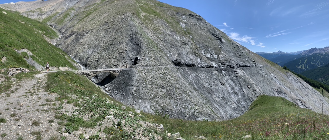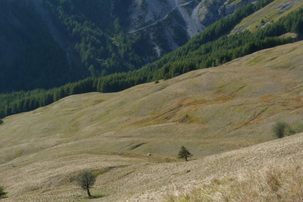 Si prende quota con un paio di tornanti e si intraprende il lungo traverso che, dopo essere usciti fuori della vegetazione conduce al tunnel a circa 2200 m quota. Quindi si passa sotto la caserma del Pian dei Morti (possibile digressione) nel punto in cui si incontra il sentiero che si prenderà in discesa.