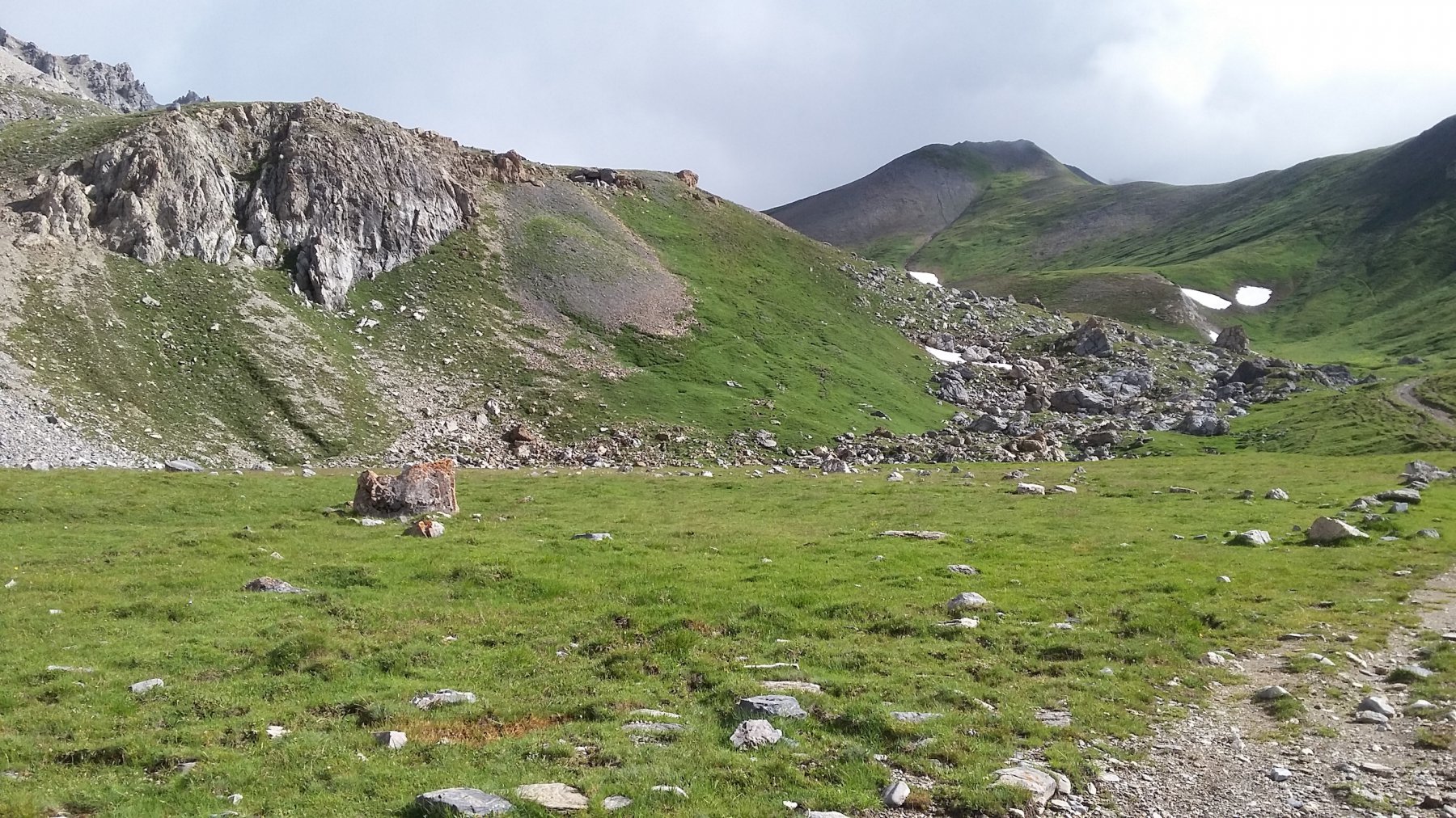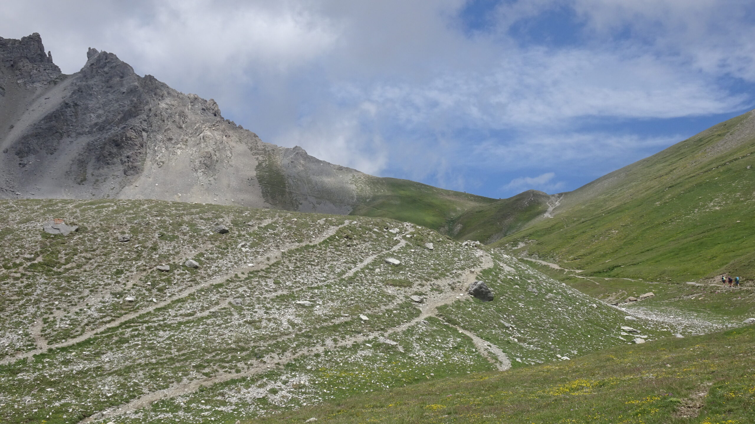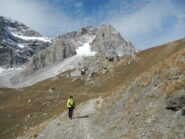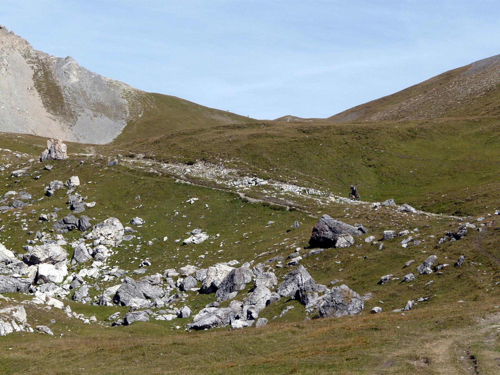 Il sentiero piega quindi a destra (direzione N) e si dirige nella parte superiore della valle della Rho passando a destra della Gran Somma prima e della Gran Bagna poi. In breve si giunge in vista del colle che si raggiunge senza alcuna difficoltà. Da qui in breve è possibile salire alla sommità del modesto Roc de Jany, oppure al Rocher de l’Homme.