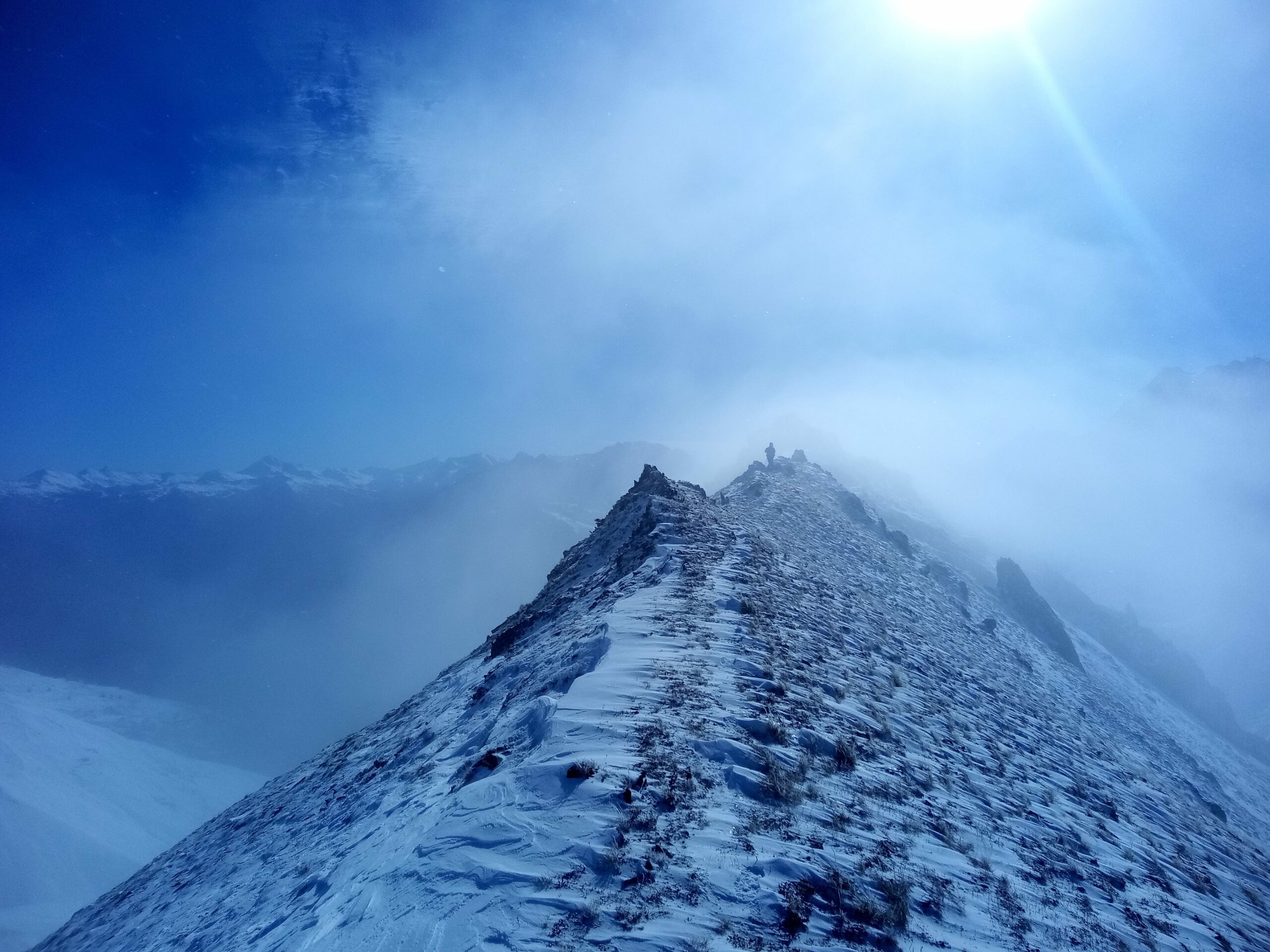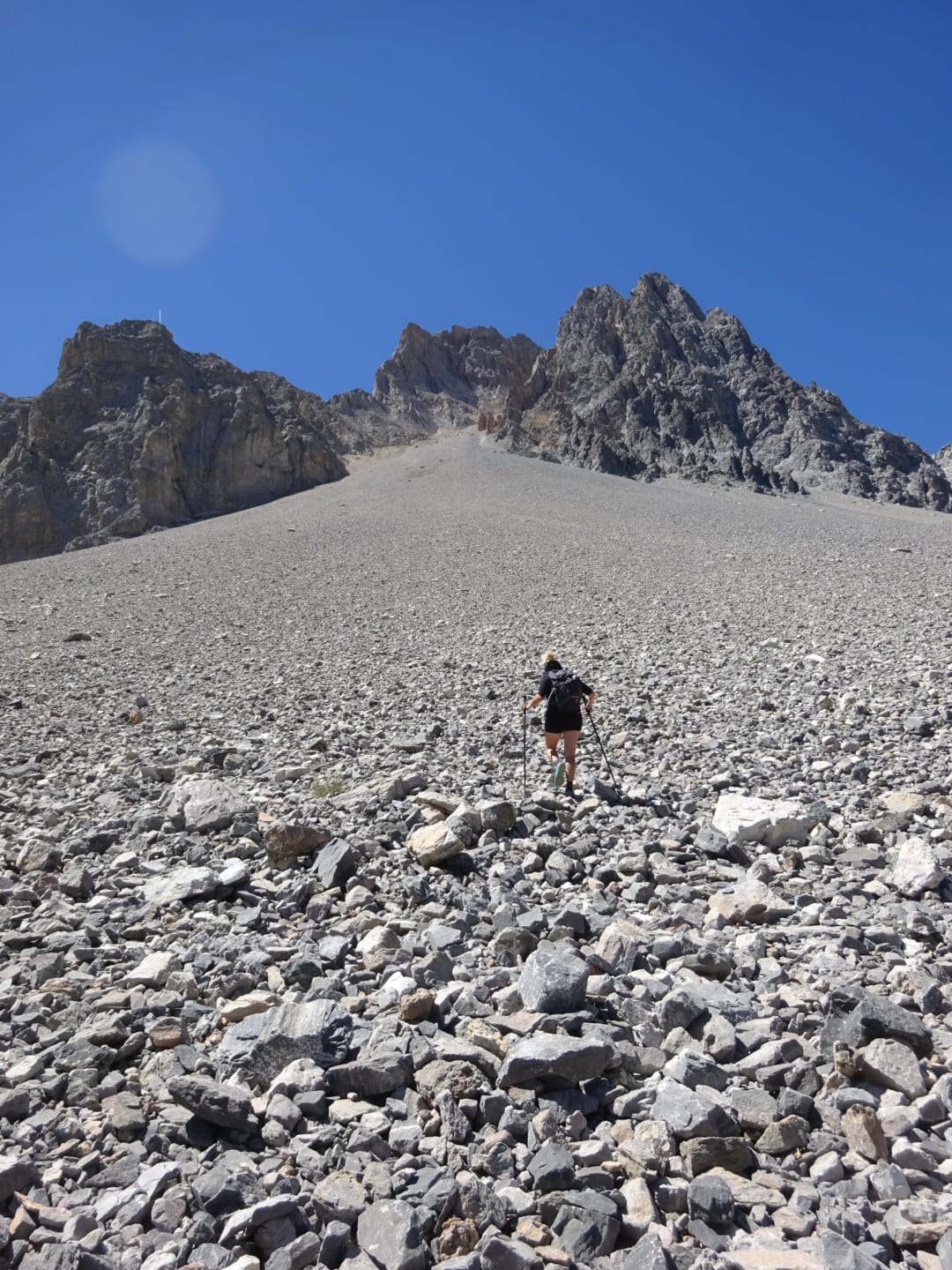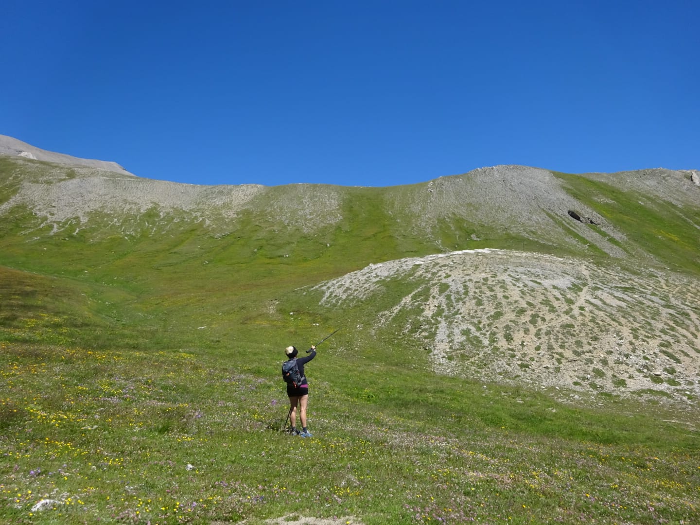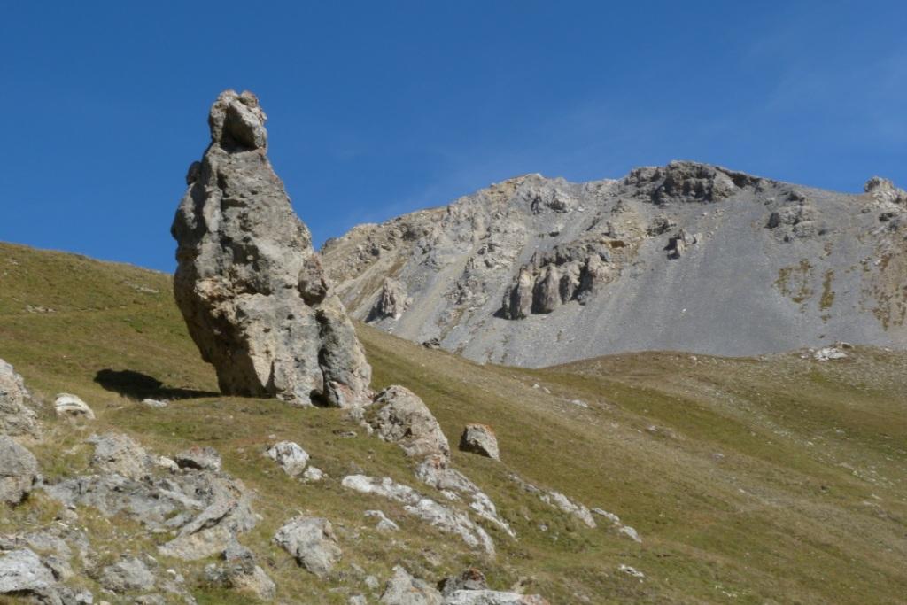 Il sentiero piega quindi a destra (direzione N) e si dirige nella parte superiore della valle della Rho passando a destra della Gran Somma prima e della Gran Bagna poi. In breve si giunge in vista del colle che si raggiunge senza alcuna difficoltà. Da qui in breve è possibile salire alla sommità del modesto Roc de Jany, oppure al Rocher de l’Homme.