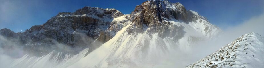 Saliti alla cresta del Roc de l’Homme (nella nebbia) e poi scesi dove si riusciva e risaliti al Colle della Rho quando abbiamo visto che era libero dalle nuvole.