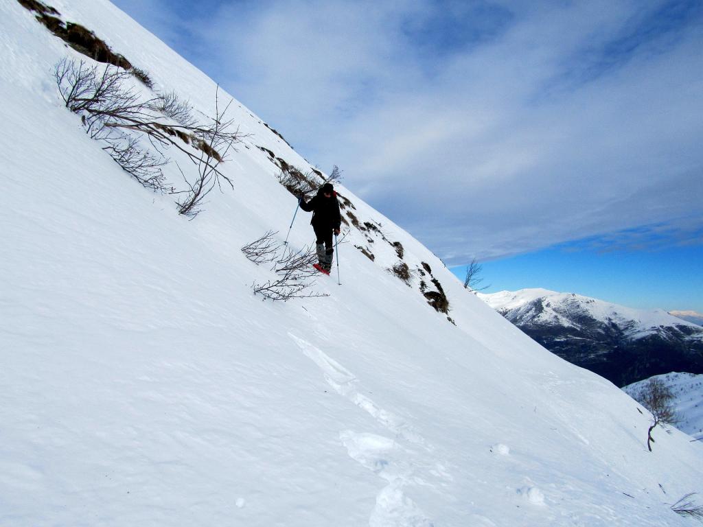 Itinerario: Da Meire, abbiamo seguito la strada fino all’alpe Tartarei; c’è da dire che in alcuni punti è stata sommersa e risagomata dalla neve spalmata dal vento e bisogna prestare attenzione.