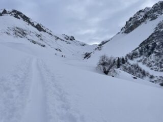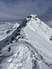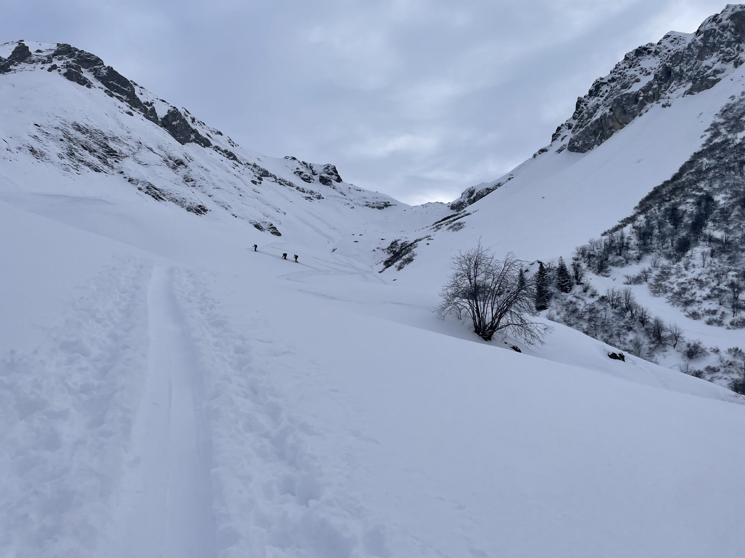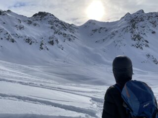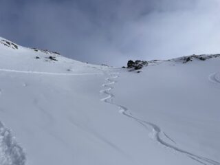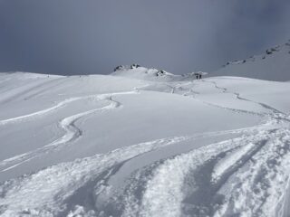 Molta gente in zona come ovvio vista la neve, il basso rischio e le previsioni favorevoli. La quantità enorme di itinerari comunque consente di disperdersi abbondantemente. Ci sono tanti parcheggi ma meglio arrivare per tempo perché si riempiono in fretta. Traccione presente dal giorno prima. Saliti al Riedchopf dal colle a piedi (a seconda dei gusti si saliva con o senza ramponi, nulla di complicato). Discesa per 250mt su bel pendio già bello tritato e poi risalita al Rotspitz. Discesa cercando zone ancora vergini su powder canadese. Non ricordo francamente quando è stata l’ultima volta che ho sciato in un metro di neve così leggera. 5 stelle sono poche.