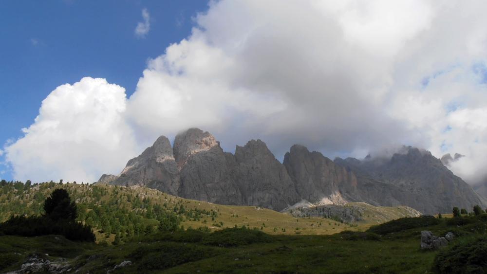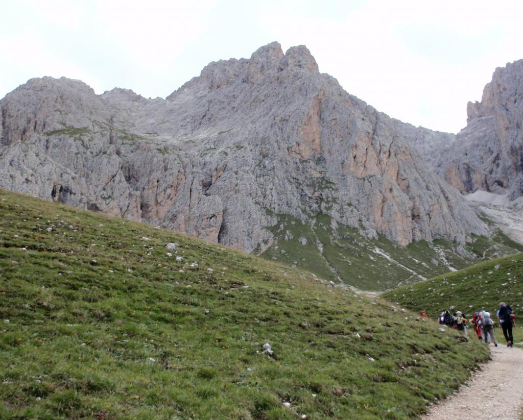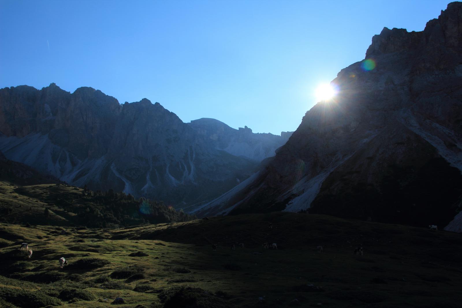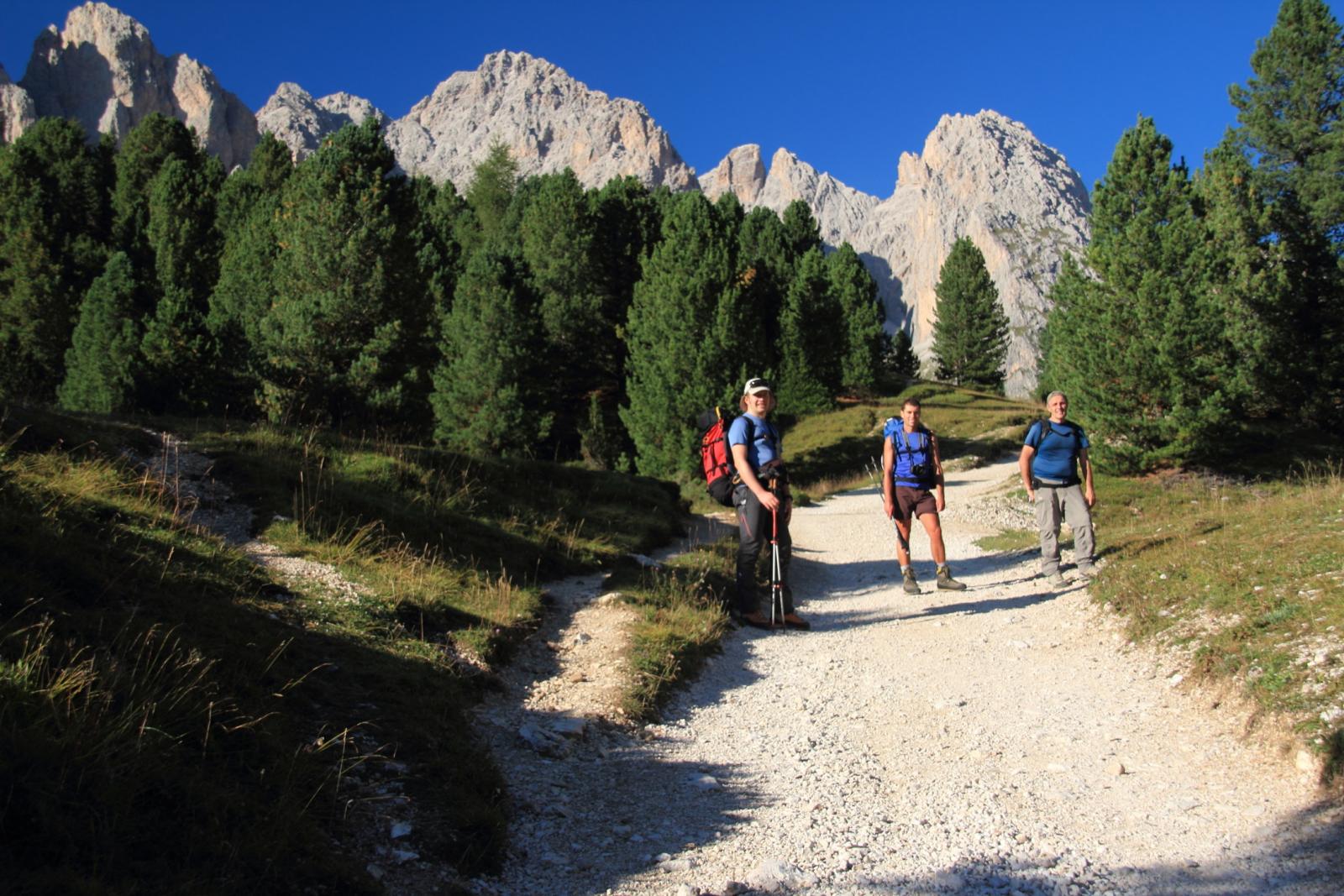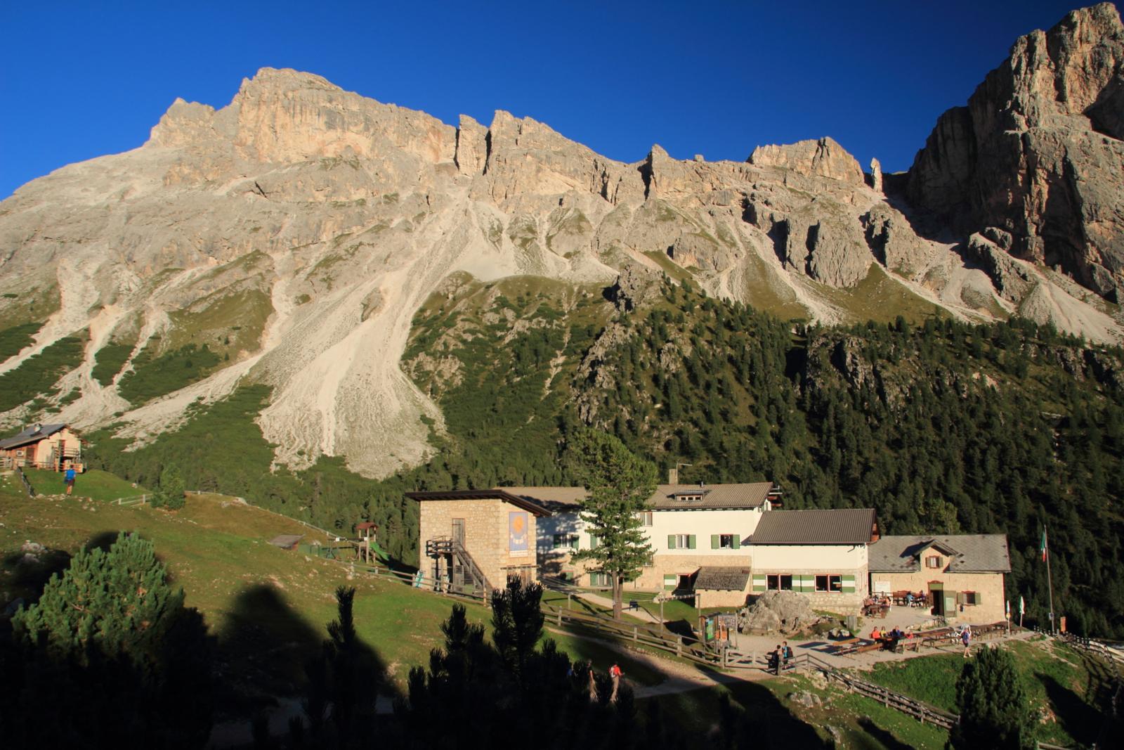 Si continua lungo la strada sterrata fino ad un altro bivio (poco prima di entrare in un bosco di pini mughi), si abbandona la strada e si volge a sinistra (cartello indicatore) seguendo il sentiero che consente di superare il bosco e si immette nuovamente su una stradina sterrata, si oltrepassano alcune malghe e poi la strada supera un ampio pendio prativo e volgendo a sinistra raggiunge infine il Rifugio Firenze m. 2037 (ore 1,00/1,15 da S. Cristina).