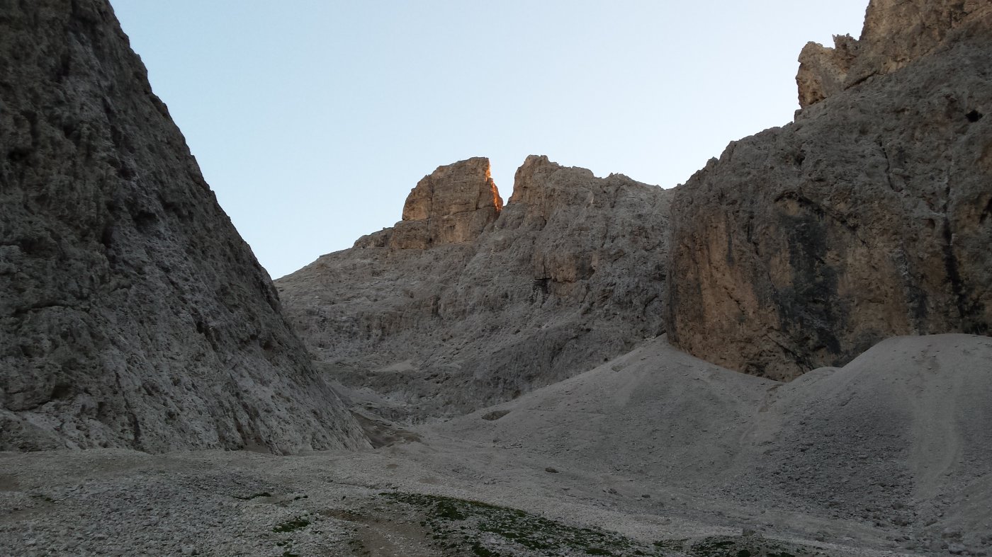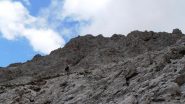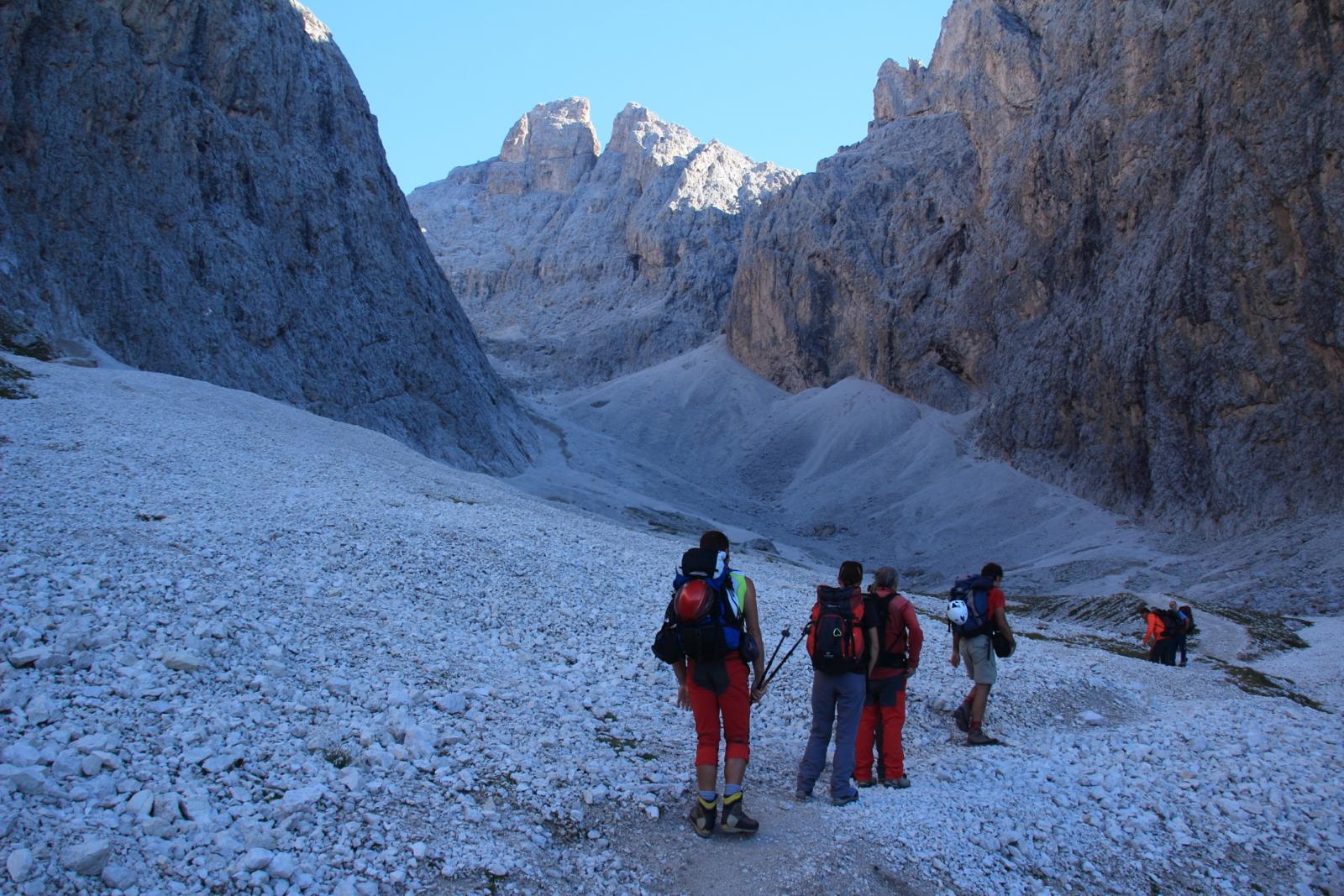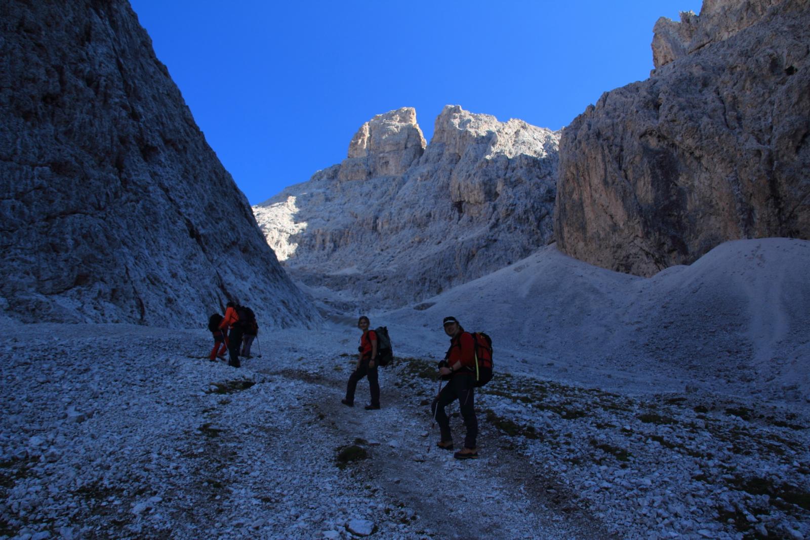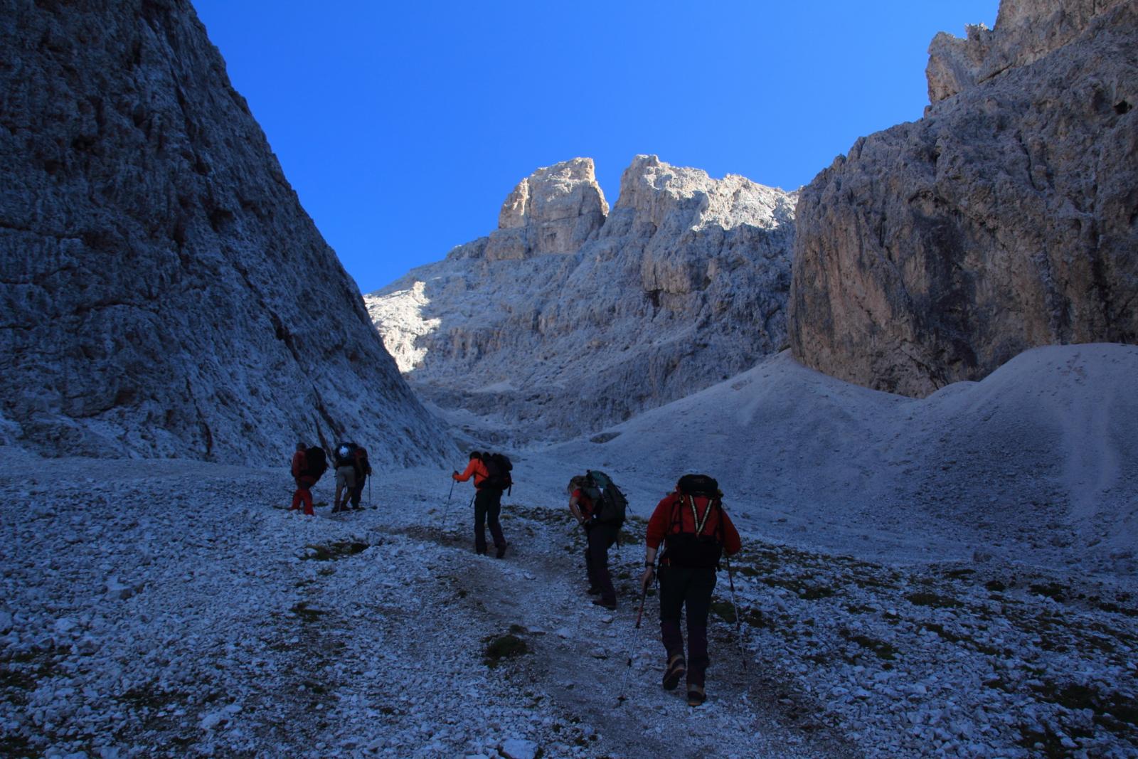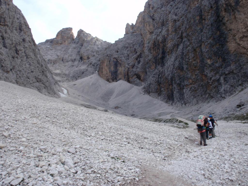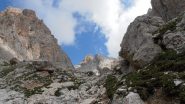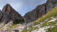 Si risale quindi l’ampio ghiaione, percorso da una traccia di sentiero segnalato, tenendosi sul lato sinistro del vallone, fino a raggiungere con evidente percorso la Forcella Salieres m. 2696 (trascurando poco prima una deviazione a destra che porta al Colletto noto come La Porta). Dalla Forcella si sale verso sinistra su ripido sentierino che porta all’inizio della via ferrata. Seguendo i cavi metallici si risale un risalto roccioso e ripide ghiaie, fino a raggiungere una piccola forcella. Poi si sale direttamente una paretina (cavo metallico, gradini e pioli infissi nella roccia), alla quale segue un canale roccioso alto circa 150 metri di roccia solida (cavi metallici continui).
