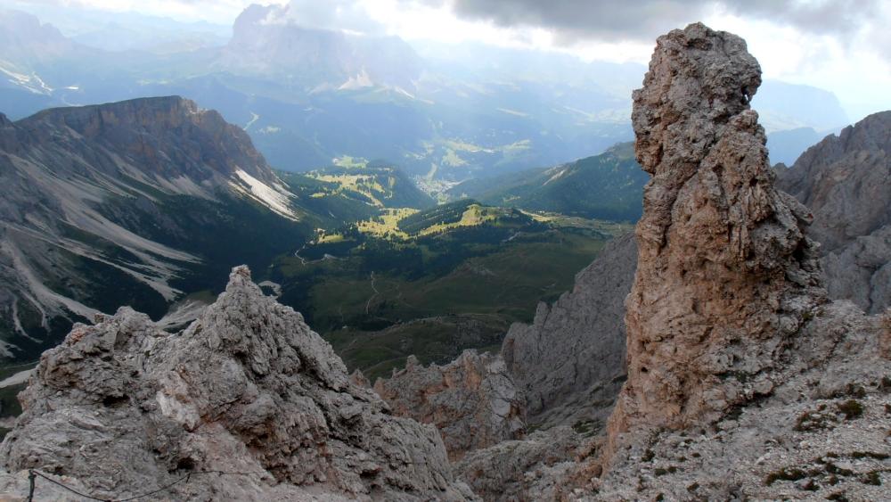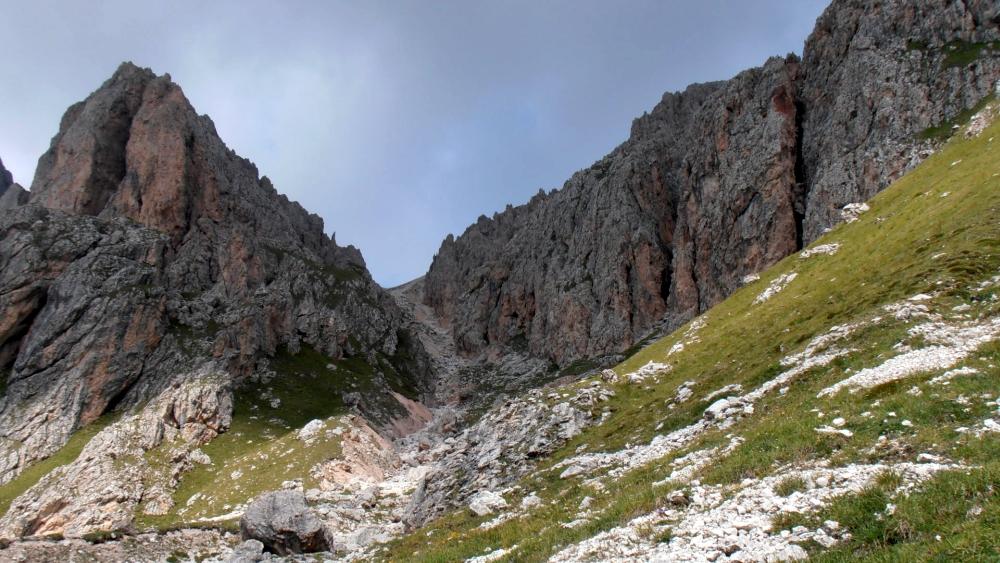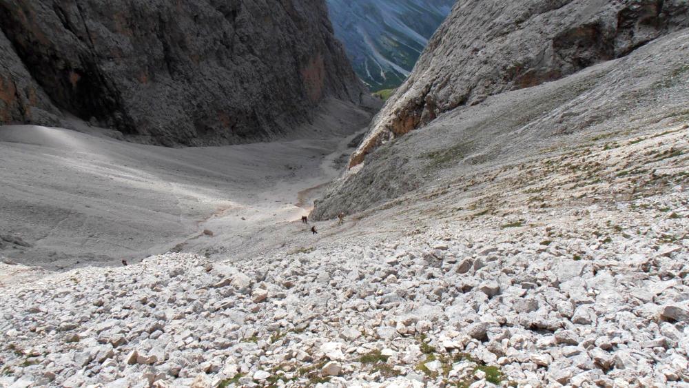 Più in basso si ritrovano passaggi attrezzati ed alcuni caratteristici ponticelli costituiti da assi di legno. Un tratto di pietrame ripido porta all’uscita della gola attrezzata, dove sbuca anche il canale di ghiaie che scende dalla Forcella de Mesdì. Non rimane che seguire il sentiero che raggiunge agevolemente il fondo del canale e nuovamente la conca pianeggiante del Plan Ciantier. Da qui si rientra facilmente al Rifugio Firenze e al Col Raiser.
