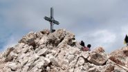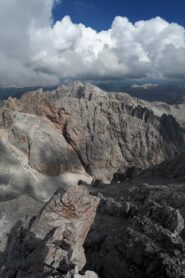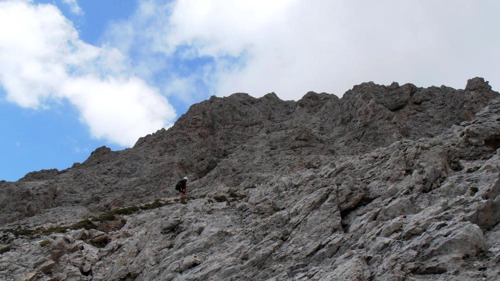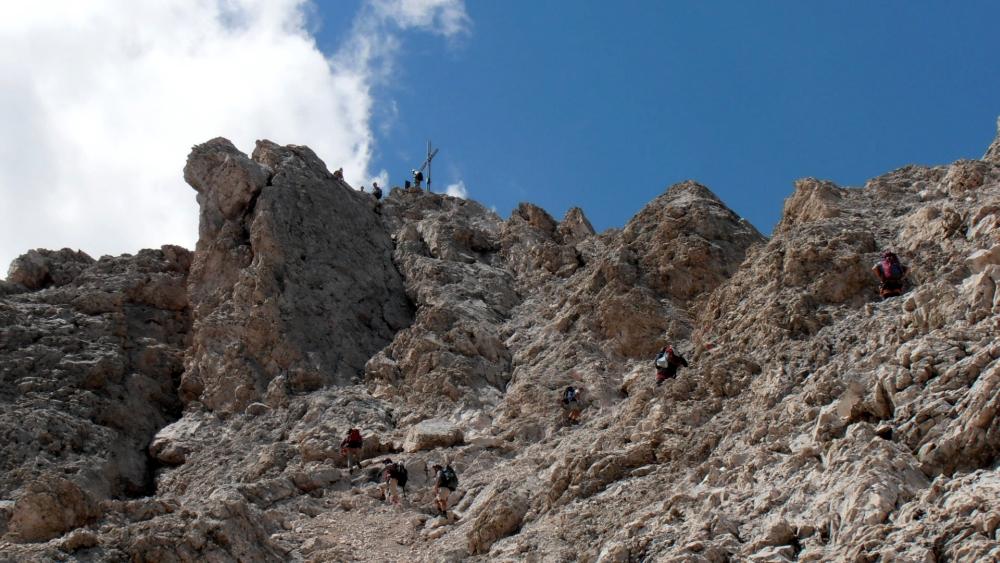 Usciti dal canale ha inizio la cresta Est, che si risale (tracce di sentiero e saltini rocciosi) in vista del risalto roccioso finale sotto la vetta, che si supera con l’ausilio delle corde fisse, poi si segue un tratto più aereo della crestina che porta ad un pendio detritico esposto e da salire con attenzione, fino a sbucare davanti alla grande croce metallica della cima. (ore 3,30 dal Rifugio Firenze alla cima).