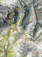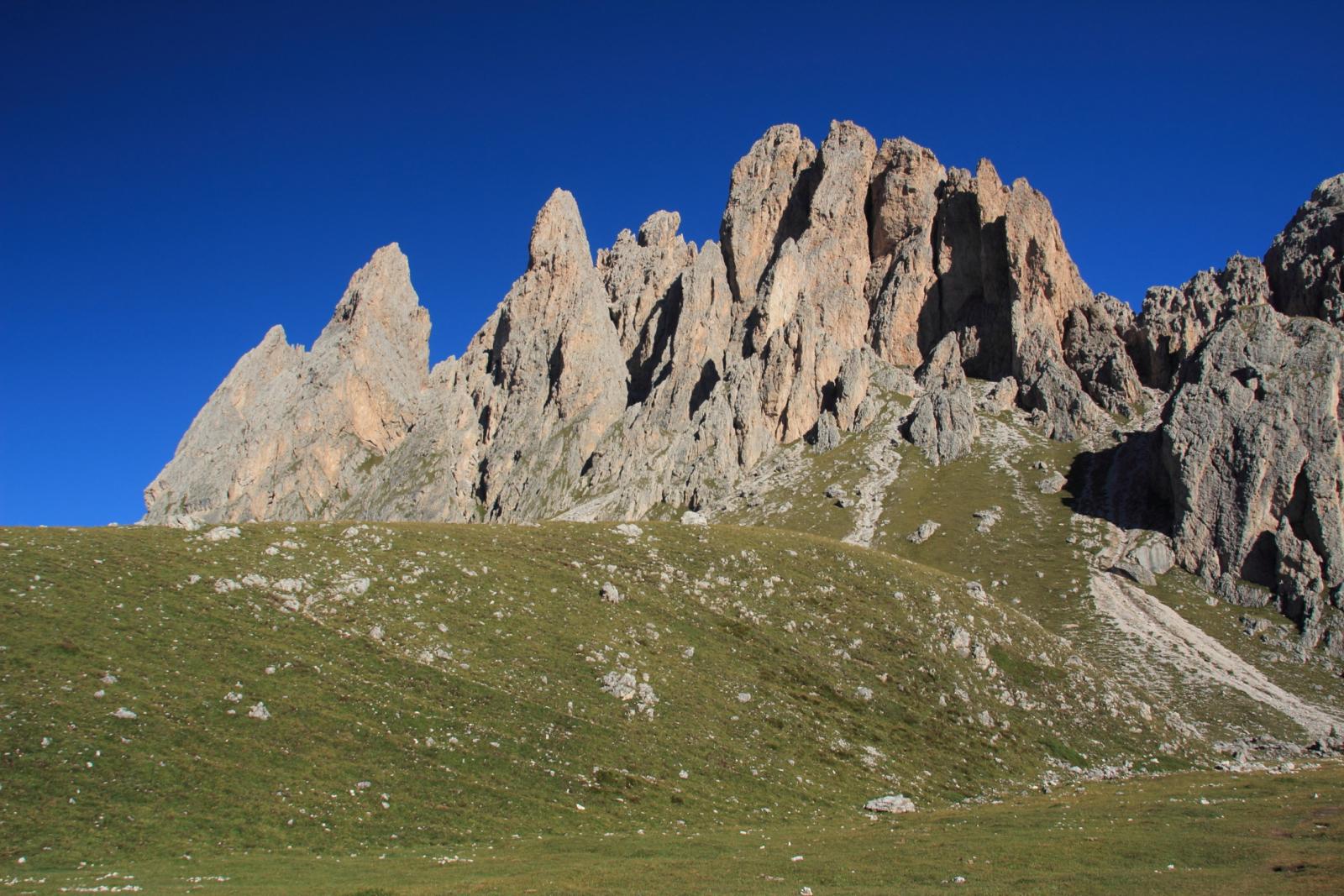 Variante per la discesa : Dal bivio sul pianoro detritico inclinato, invece di seguire il sentiero che scende a sinistra, si prosegue sul sentierino che sale a mezzacosta, a lunghi tratti in piano (bolli rossi e ometti) attraversando guglie, torrioncini e costolononi rocciosi. Si supera un primo attrezzato in discesa, poi segue un altro tratto pianeggiante dove il sentierino prosegue senza difficoltà particolari, poi si attraversa una paretina (cavo metallico), si scende ad un intaglio e si risale una bastionata rocciosa con un tratto attrezzato (un passo impegnativo nei primi metri) poi si traversa ancora in piano.