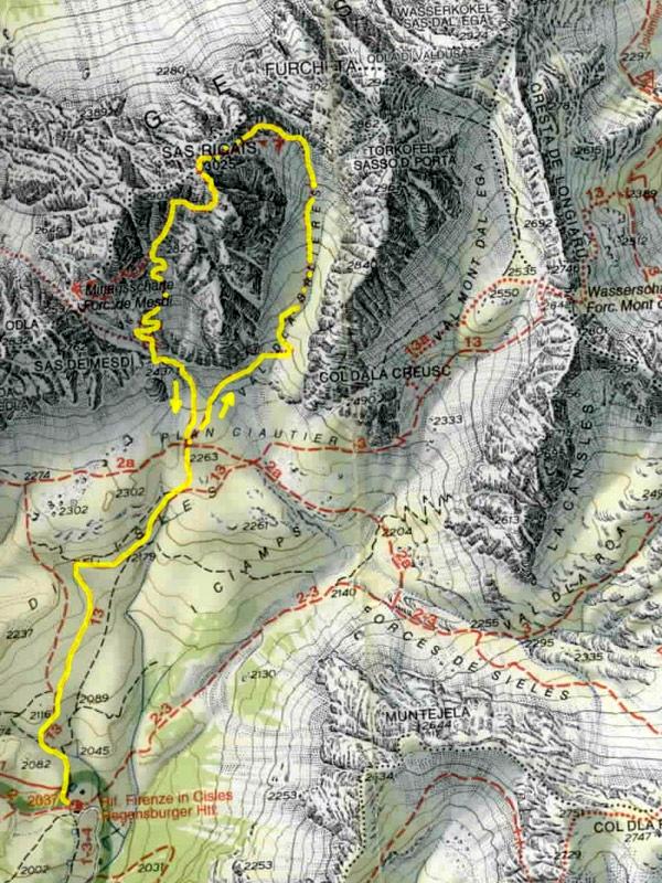 Dal Rifugio si segue il sentiero con segnavia 13 che sale verso Nord (a sinistra)rimontando i pendii erbosi dell’Alpe di Cisles in direzione della conca del Plan Ciantier m. 2290, posto ai piedi del versante Sud del Sass Rigais. Si traversa l’ampio pianoro raggiungendo un ripiano detritico dove si incrocia un bivio, qui si trascura il sentiero che prosegue a destra verso la Forcella del Munt de l’Ega e ci si inoltra a sinistra, aggirando le rocce che sbarrano la parte iniziale della Val Salieres, con una serie di serpentine, raggiungendo la parte alta del vallone.