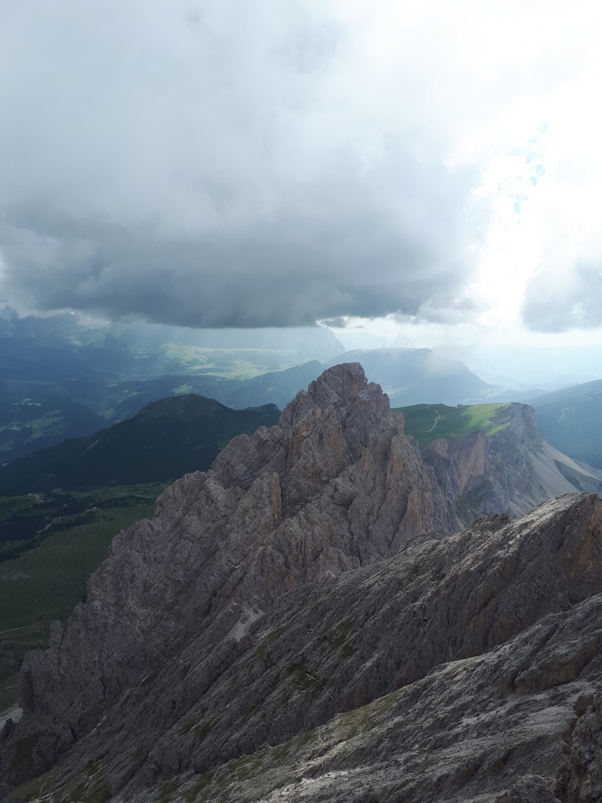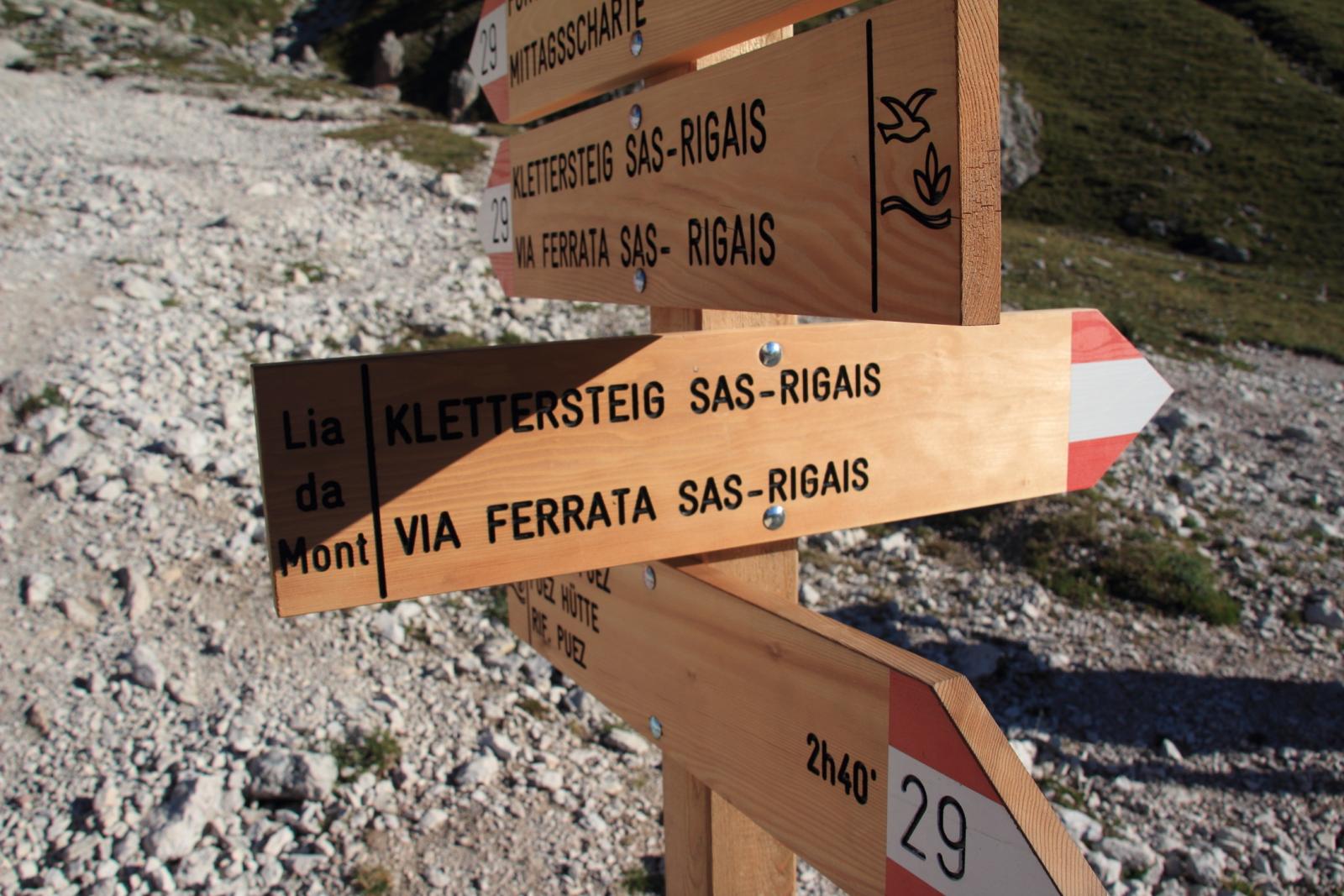Solitamente la traversata del Sass Rigais viene effettuata come descritta in questa relazione, salendo dalla Val Salieres e dalla ferrata Est e scendendo dal versante Sud (itinerario più facile ed agevole), ma si può decidere liberamente come programmare la propria salita (in entrambi gli itinerari si incontrano passi di II/II+ ma sempre attrezzati con il cavo metallico).
