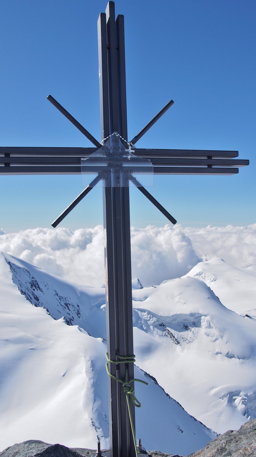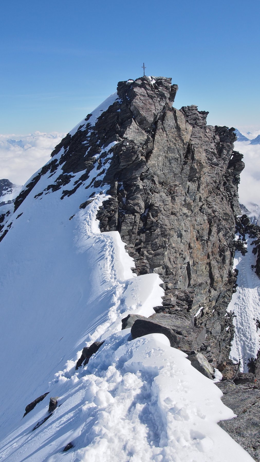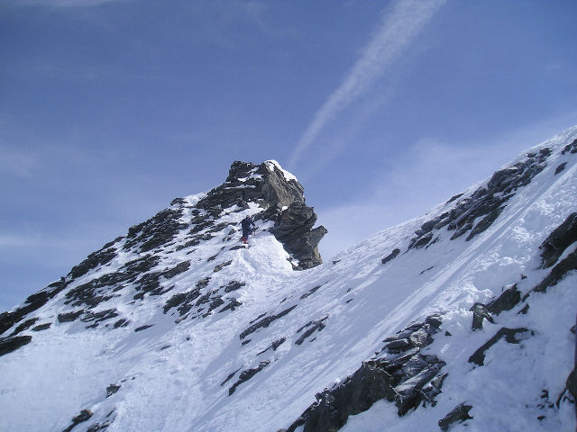 Con percorso evidente si punta alla Sattel dove si lasciano gli sci a 4000 m. Per la punta salire una canale di neve a 45° poi spostarsi a sinistra sulla cresta che si costeggia tenendosi sulla sinistra con percorso di misto, qualche cordino sul posto meglio aggiungere qualche fettuccia ed assicurare nei punti più delicati. Contare non meno di 2 ore andata e ritorno.