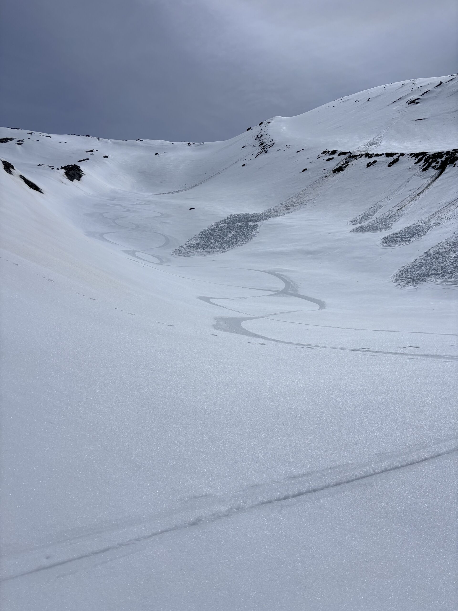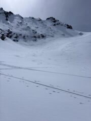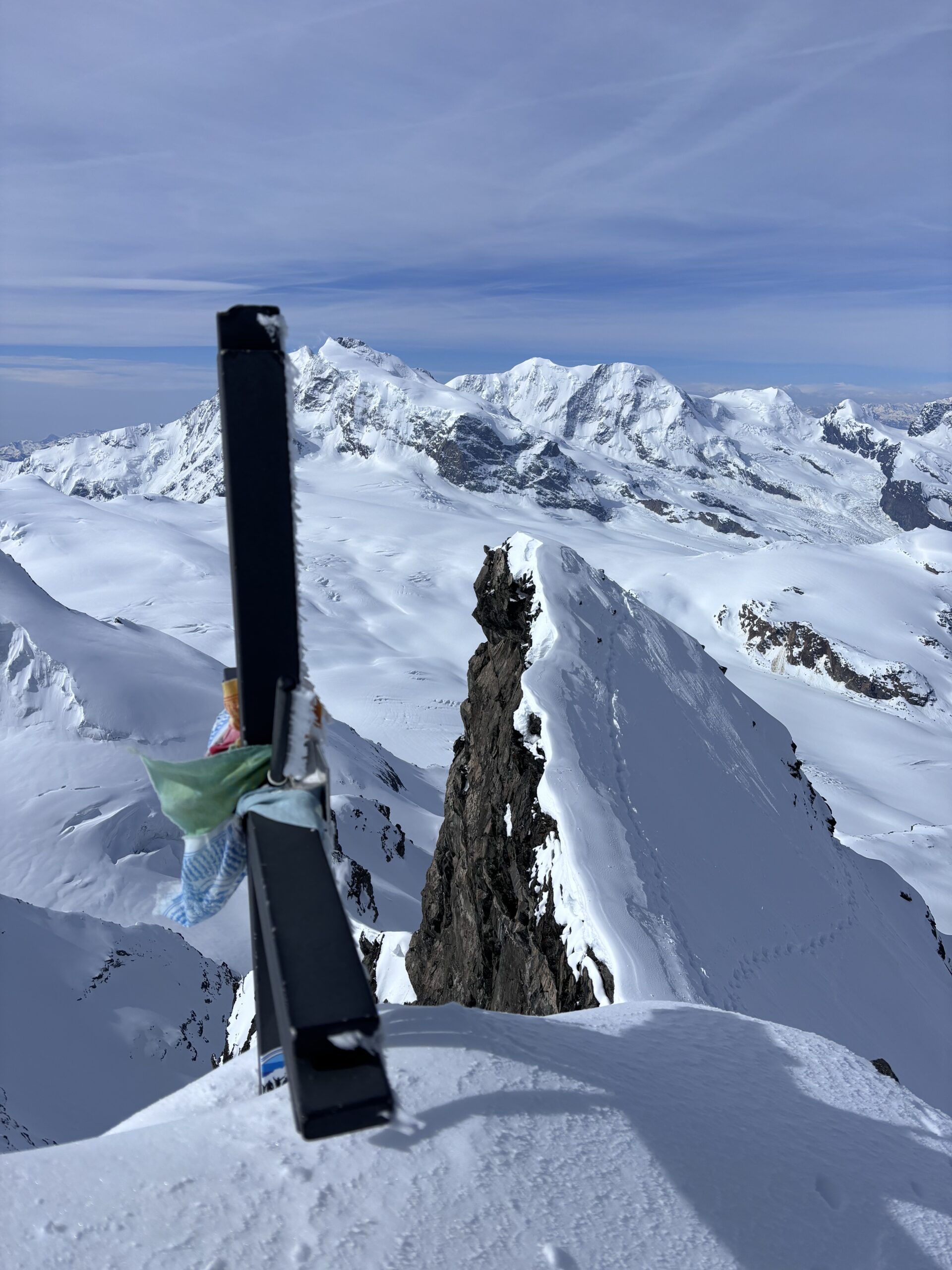 Dormito nell’invernale, lusso! 10 posti, stufa a legna, presenti pentole e stoviglie, possibilità di fare acqua a 100m, a disposizione acqua in bottiglia e birra da acquistare! Sci a 10 min dal rifugio, ghiacciaio bello chiuso, tanta neve nella parte alta, cordini sommersi, fatta 1 doppia con corda da 30m. Neve spettacolare, tagliato poi tutto a sx in traverso con gava e buta per lingue si arriva al pianoro e in mezz’ora di portage a Taschalp. Oggi in cresta freddo e vento.