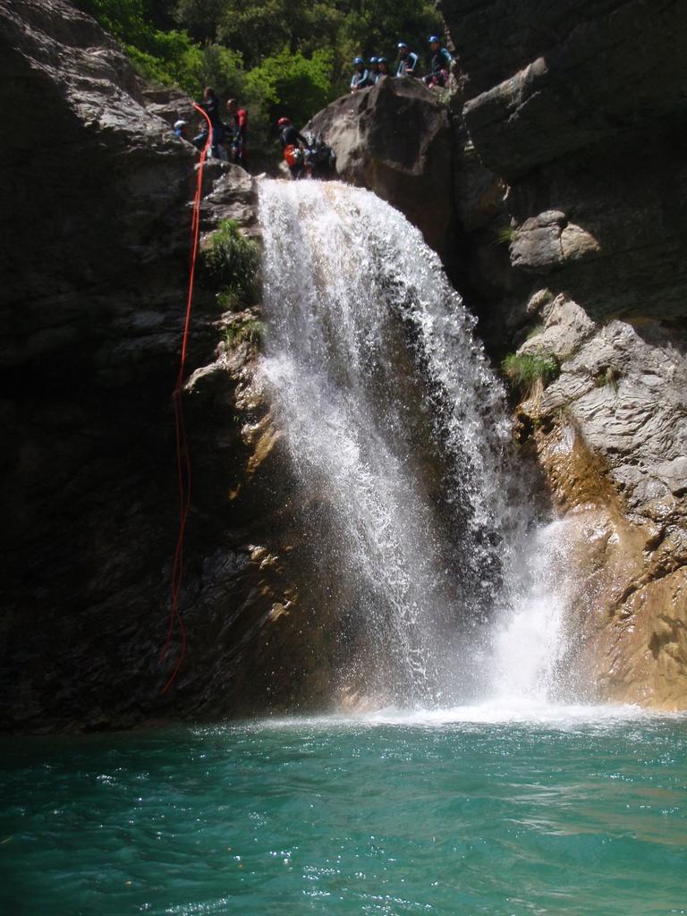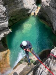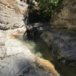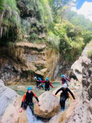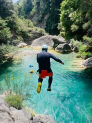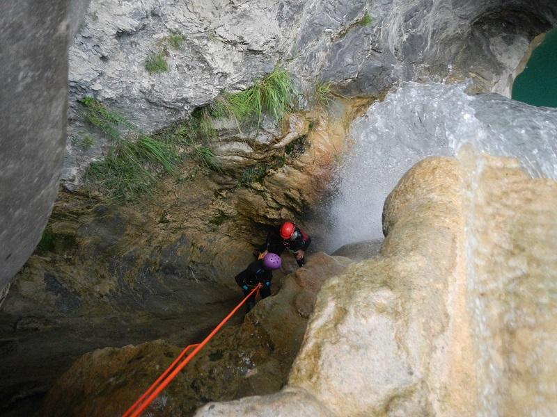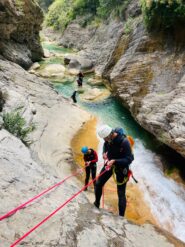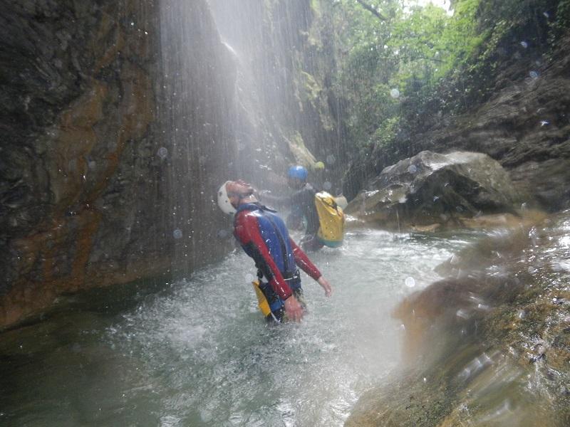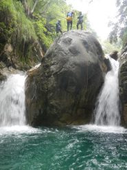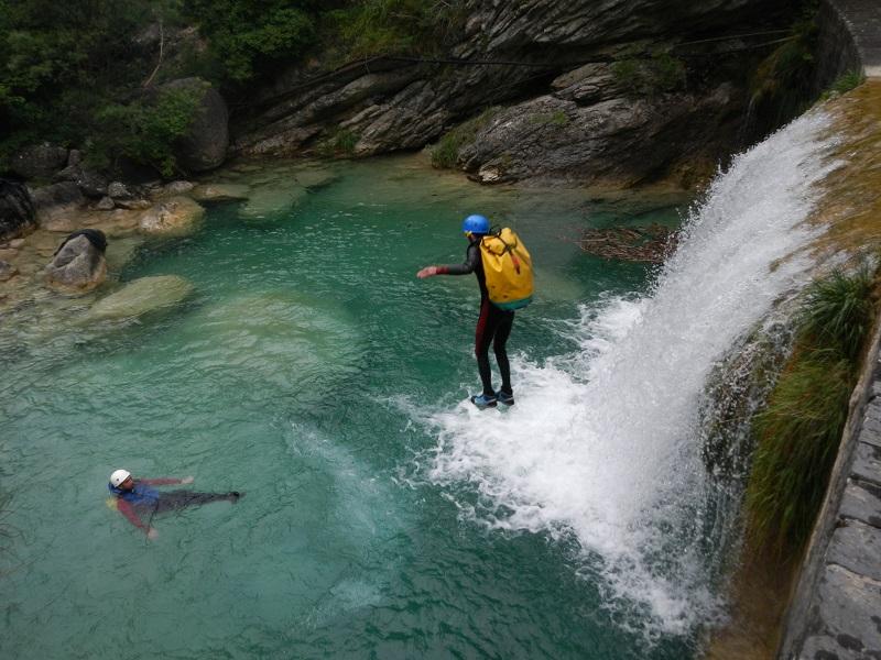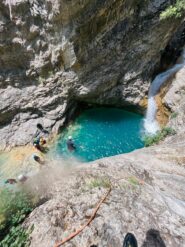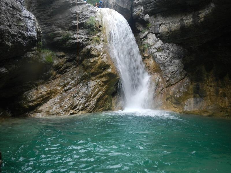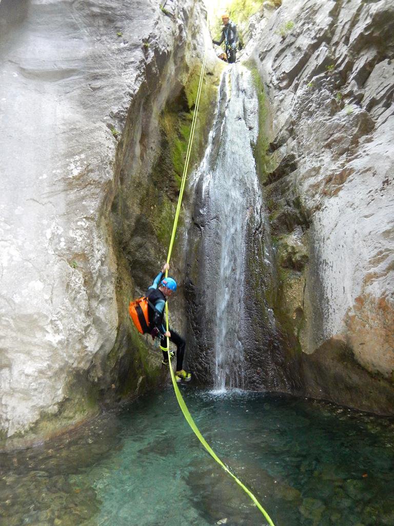 L’intinerario si svolge con una serie di calate e tuffi molto belli in acqua sempre verde. Si arriva in fine dopo 15 min di marcia sul greto ad un ultimo salto presso uno sbarramento artificiale.