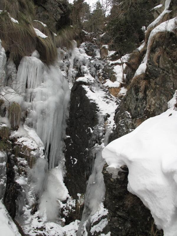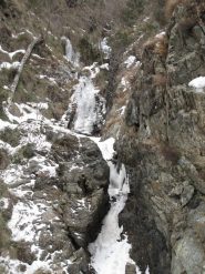 Sopra la stradina la gorgia continua con altre brevi cascate (una piuttosto delicata su ghiaccio sottile e un po’ in obliquo), poi, a quota 370 circa, il rio diventa meno ripido e ingombro di vegetazione. Si esce a destra e, per tracce di animali fra gli arbusti, si va a raggiungere il sentiero con il triangolo rosso che riporta a Campo.