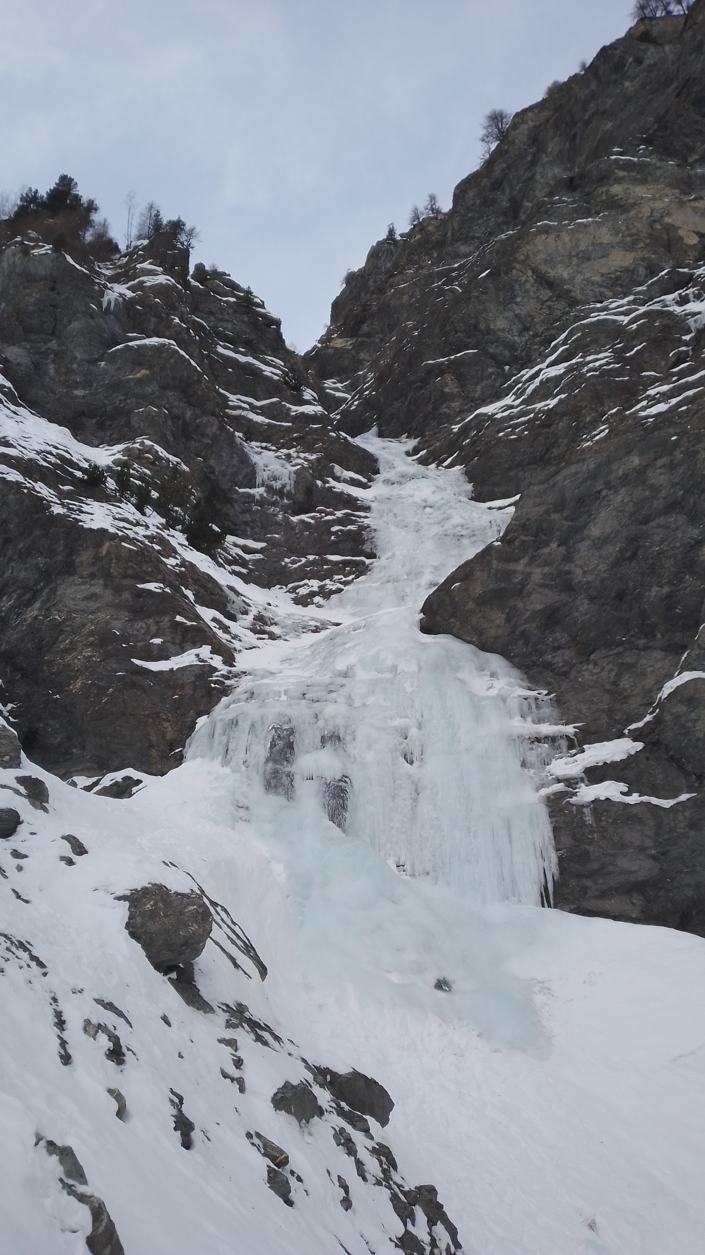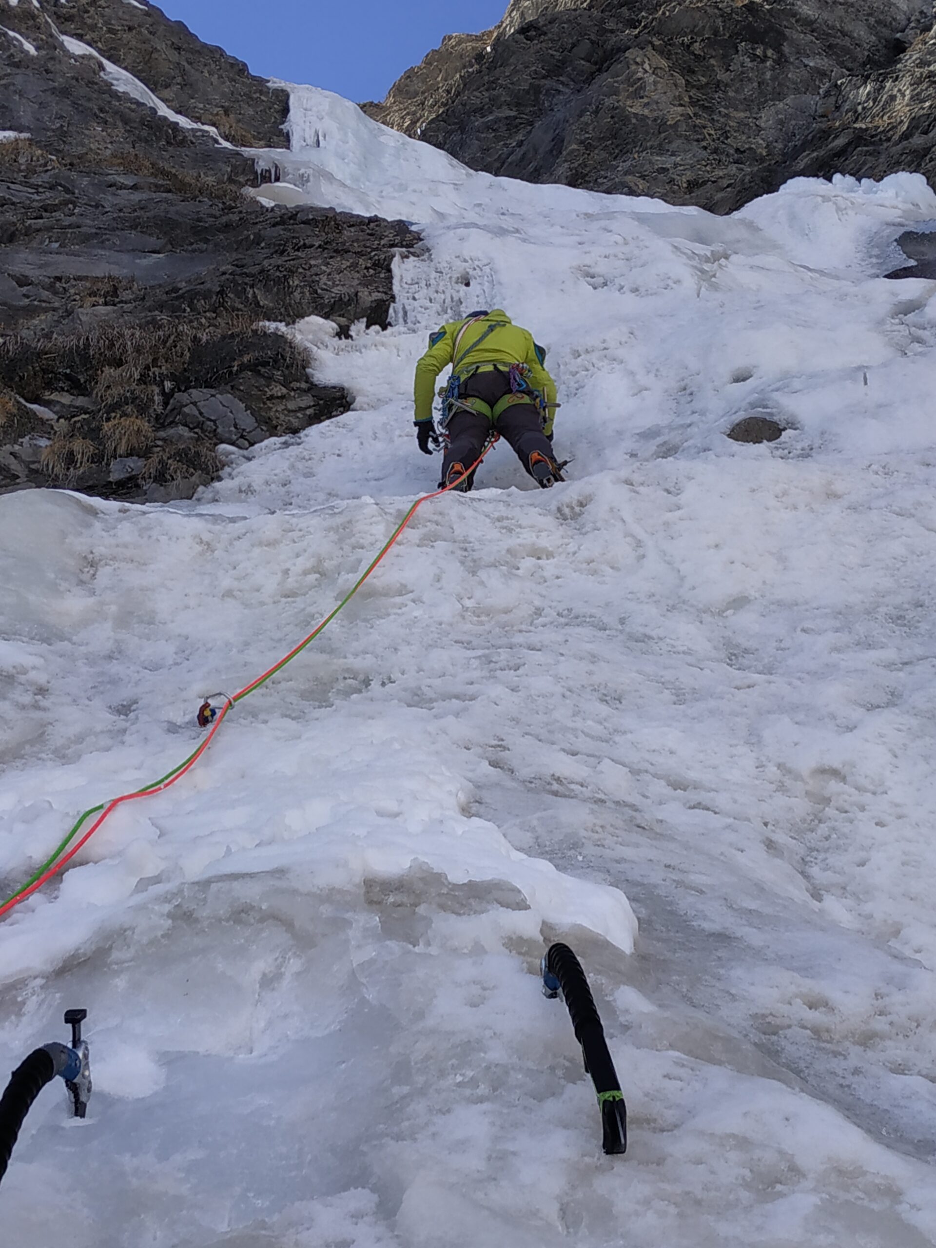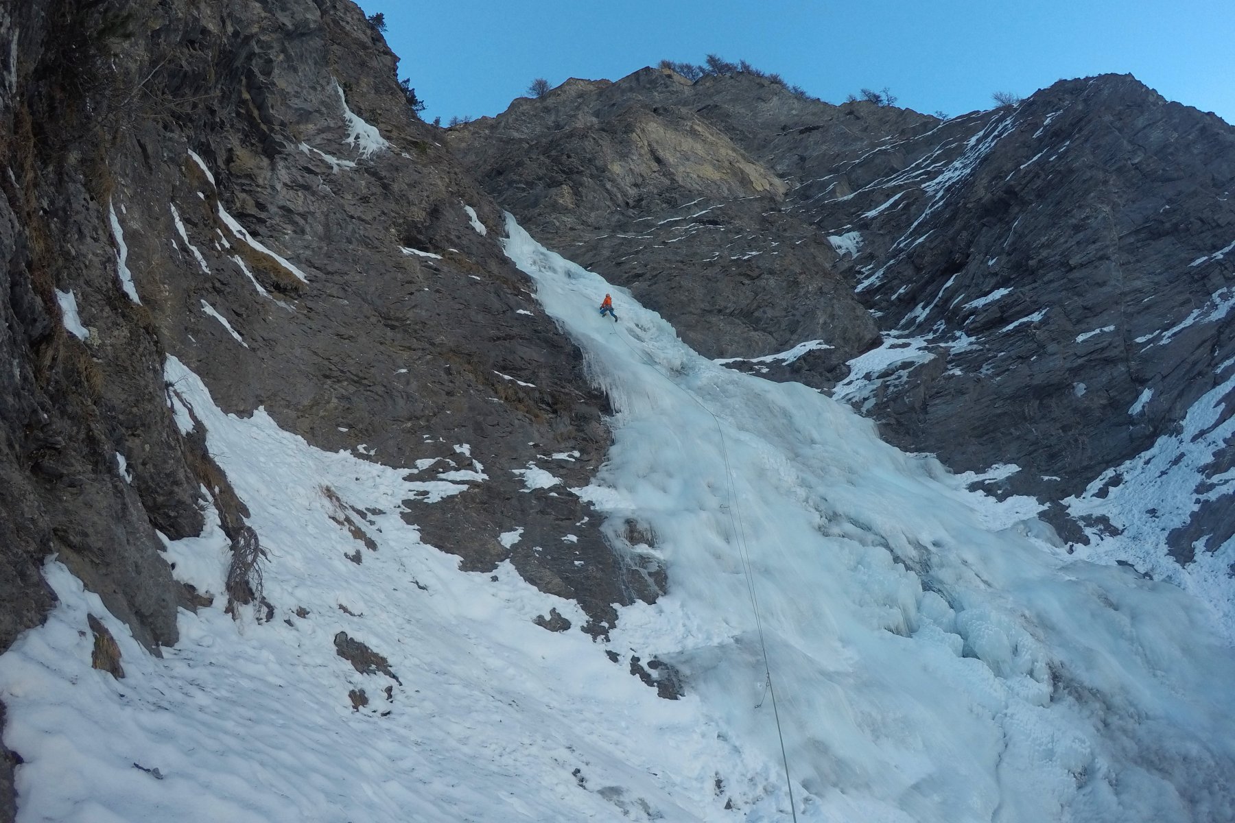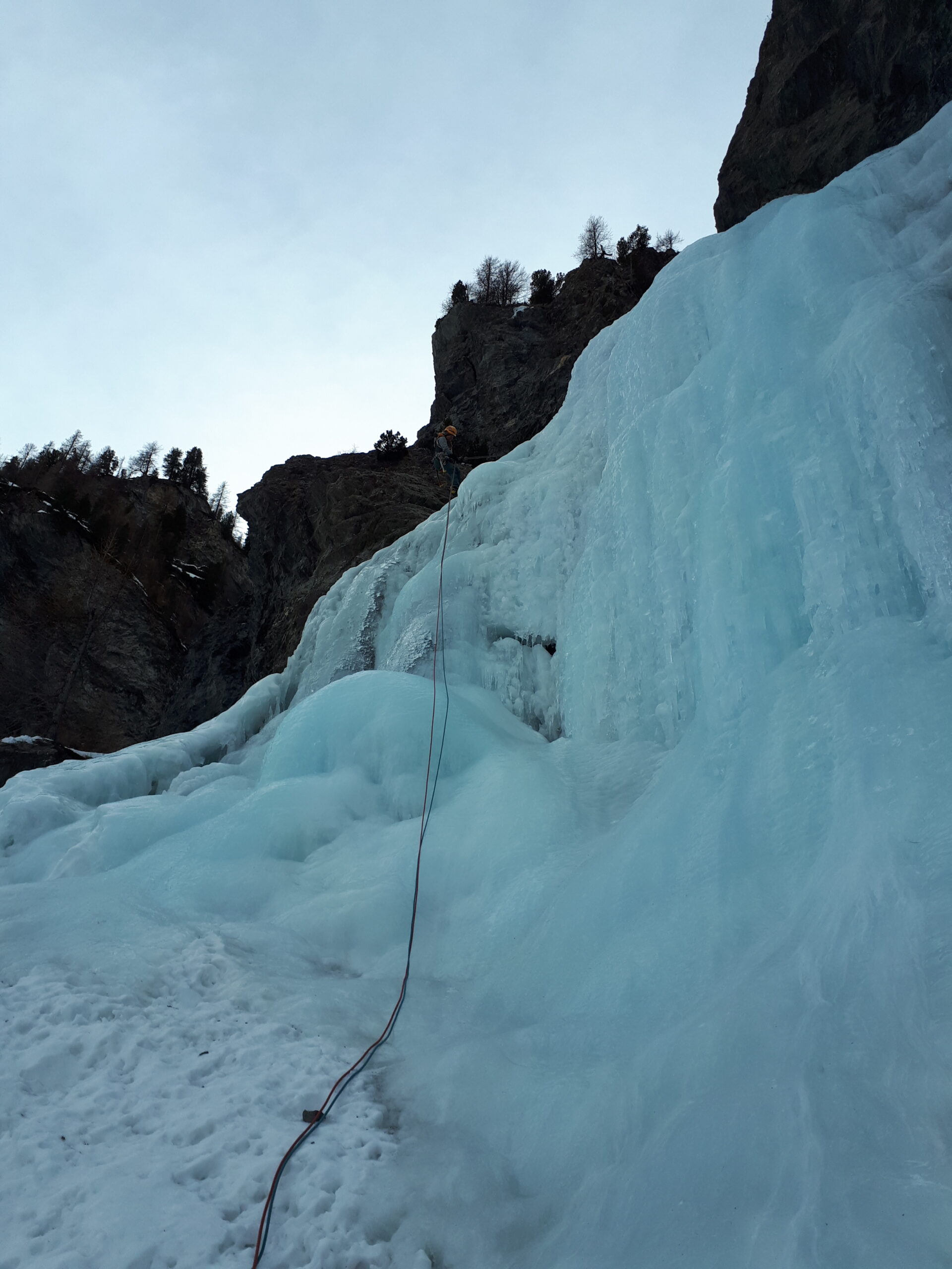 Il primo salto è più breve e si può salire sulla dx (più ripido, 80°) e più facilmente sulla sx. In caso di abbondante innevamento è molto corto e coperto.