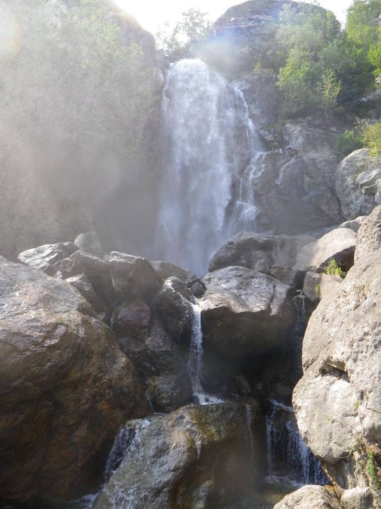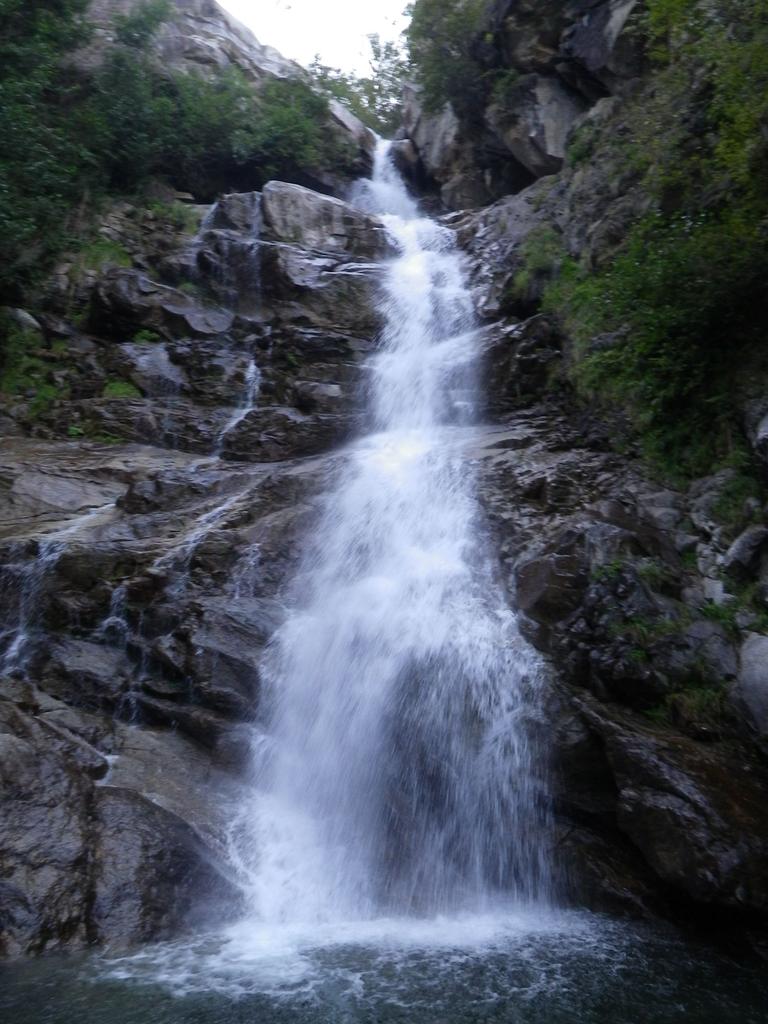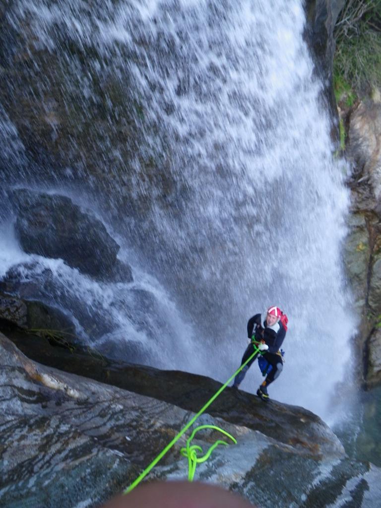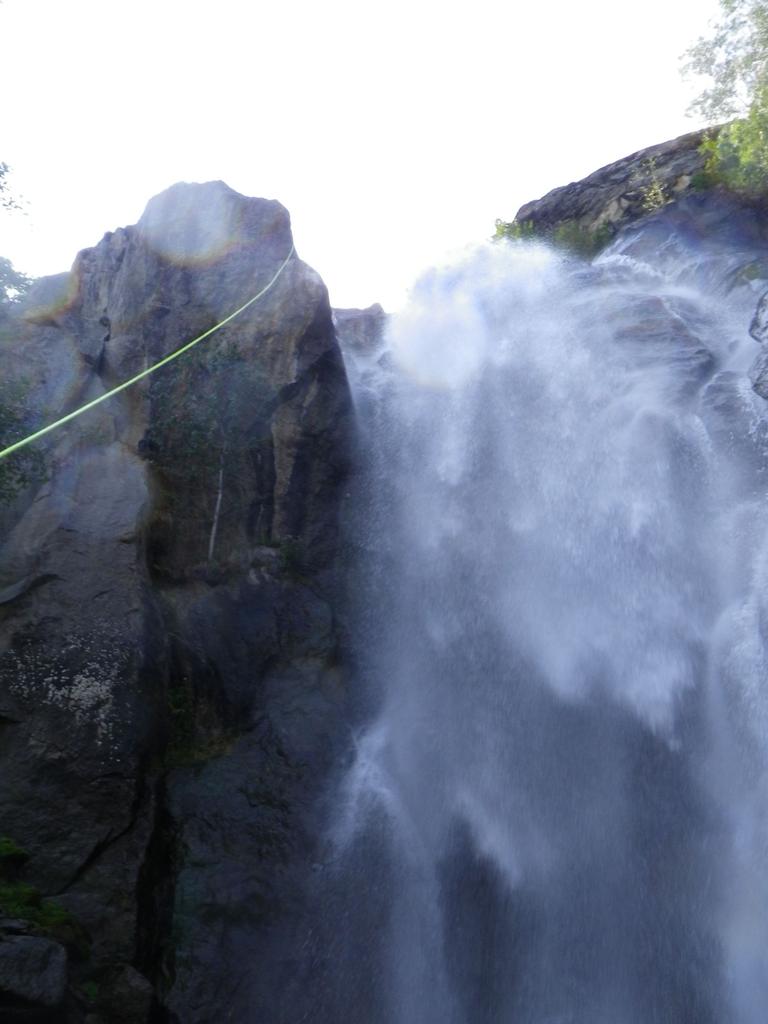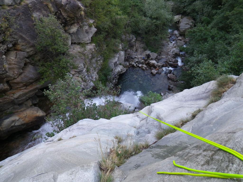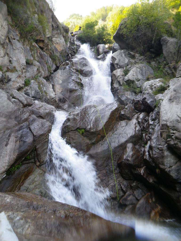 Proseguire per Santa Maria con numerosi tornanti.Si lascia l’auto presso il parcheggio davanti al bar ristorante, ottimo per le merende(consigliato).Di qui inizia un sentiero poco segnato a fianco di un canale per lo scolo delle acque che in breve vi porta alla base della cascata iniziale(10minuti), visibile dalla strada (non ancora armata) Una quindicina di calate di cui tre importanti C30 L’unica visibile dall’autostrada,C35, C45 la più alta armate con fix inox e catena.Numerose disarrampicate difficile a volte trovare la strada giusta in mezzo al caos di massi.Calcolare minimo 4-5 ore per la discesa. Sacca d’armo obbligatoria 2 corde da 50 + quella di soccorso, qualche fettuccia e maillon.Uscita sentiero che segue la captazione che porta ad una vasca (5 minuti)all’auto.