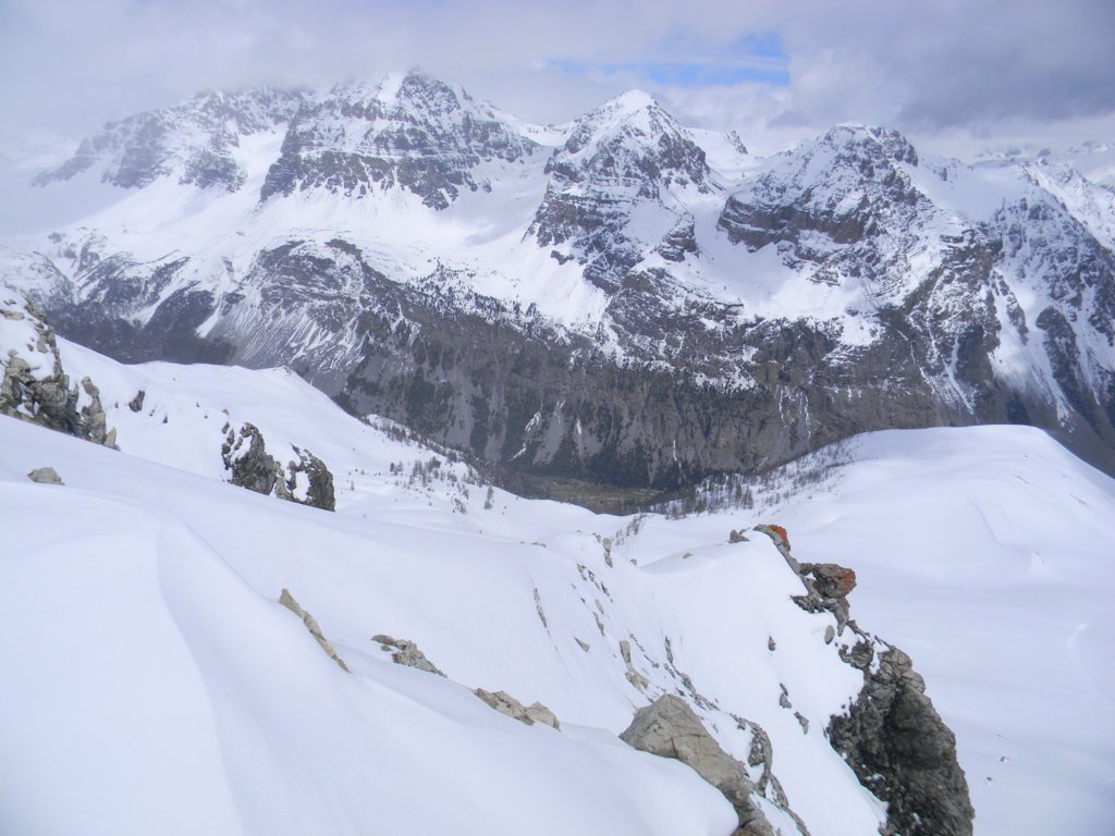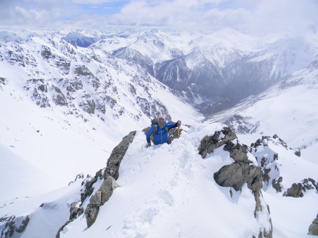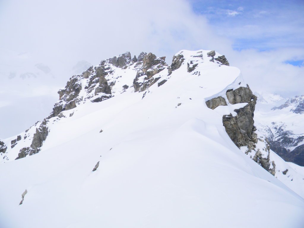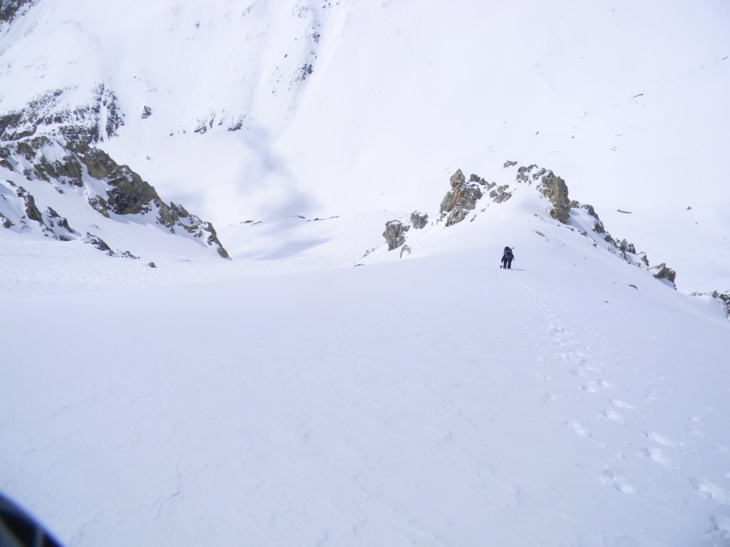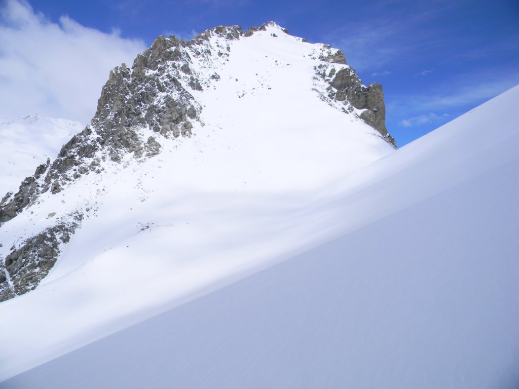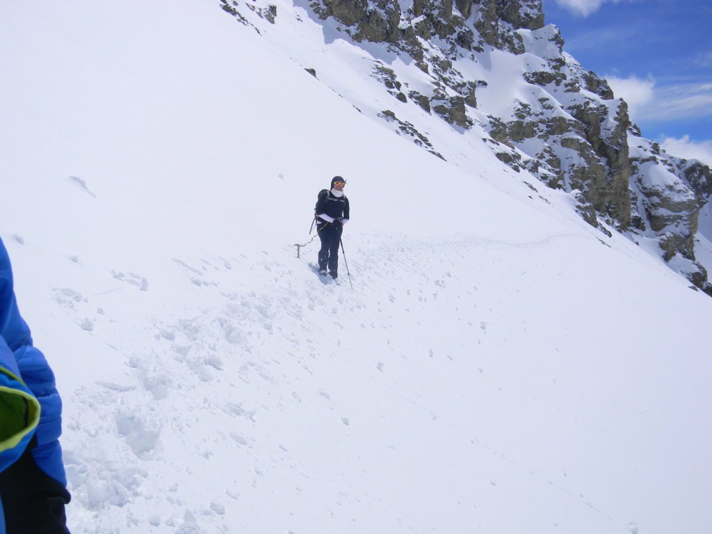 Da qui inizia il primo pendio di 250 m circa a 30°/35°, nettamente a dx (NE), porta al colle de l’Etroit du Vallon 2489 m, si continua sul secondo pendio NO, 200 m circa di 35°/40° a seconda di dove lo si risale; dall’apice di quest’ultimo si volge prima a sx, ove inizia la divertente crestina con esposizione minima, poi a dx, si sale seguendo un percorso a spirale a spirale che conduce brevemente in vetta, molto panoramica.