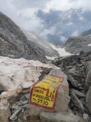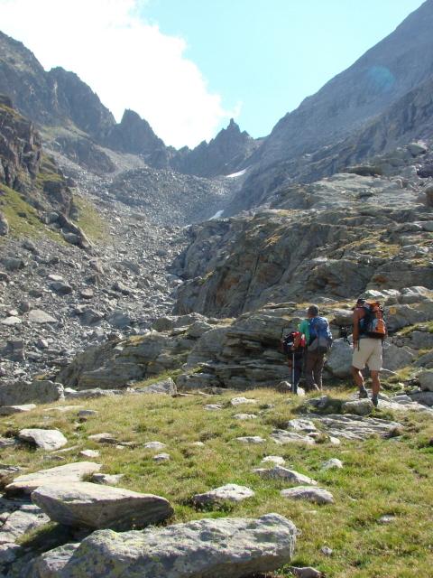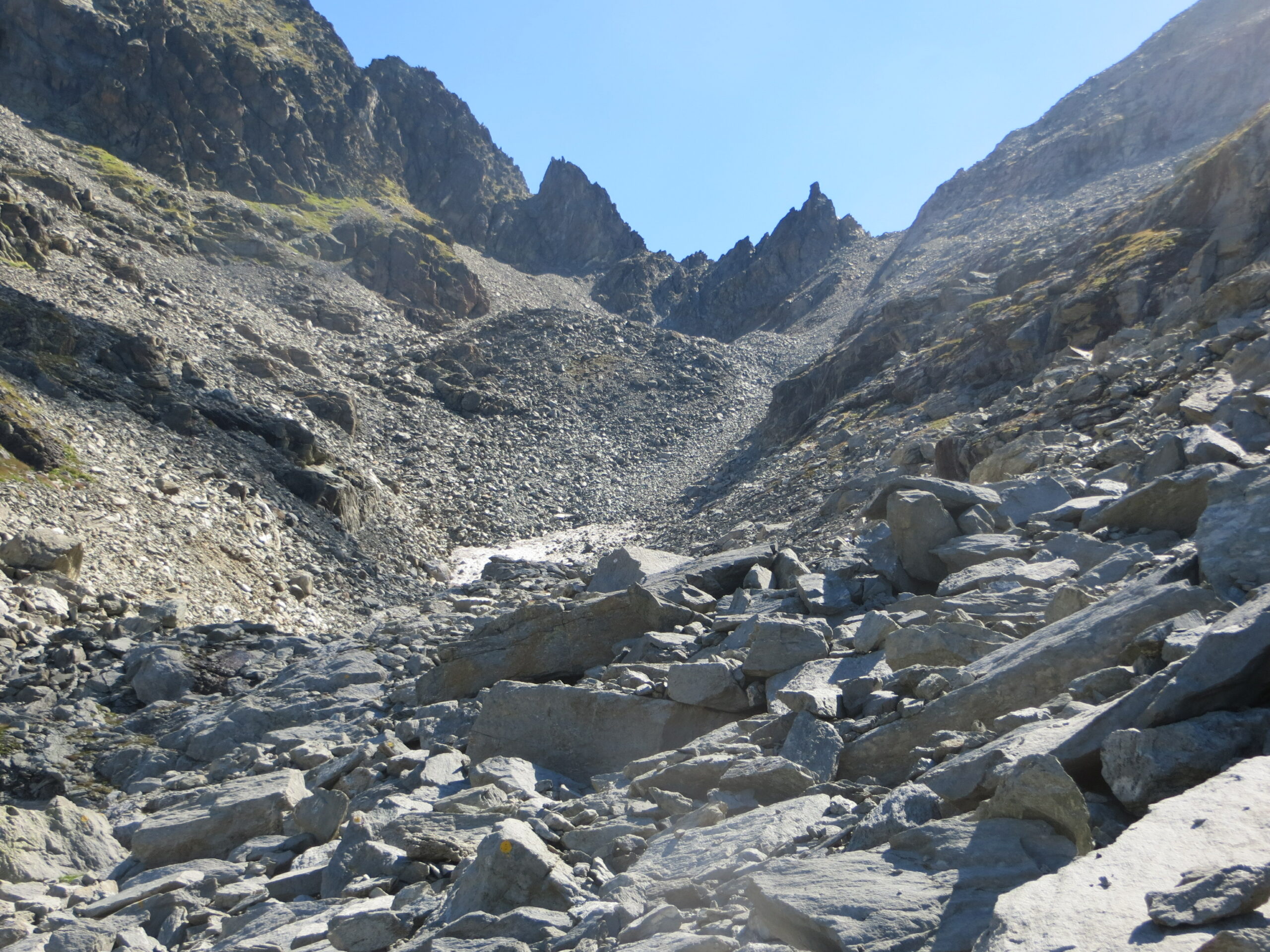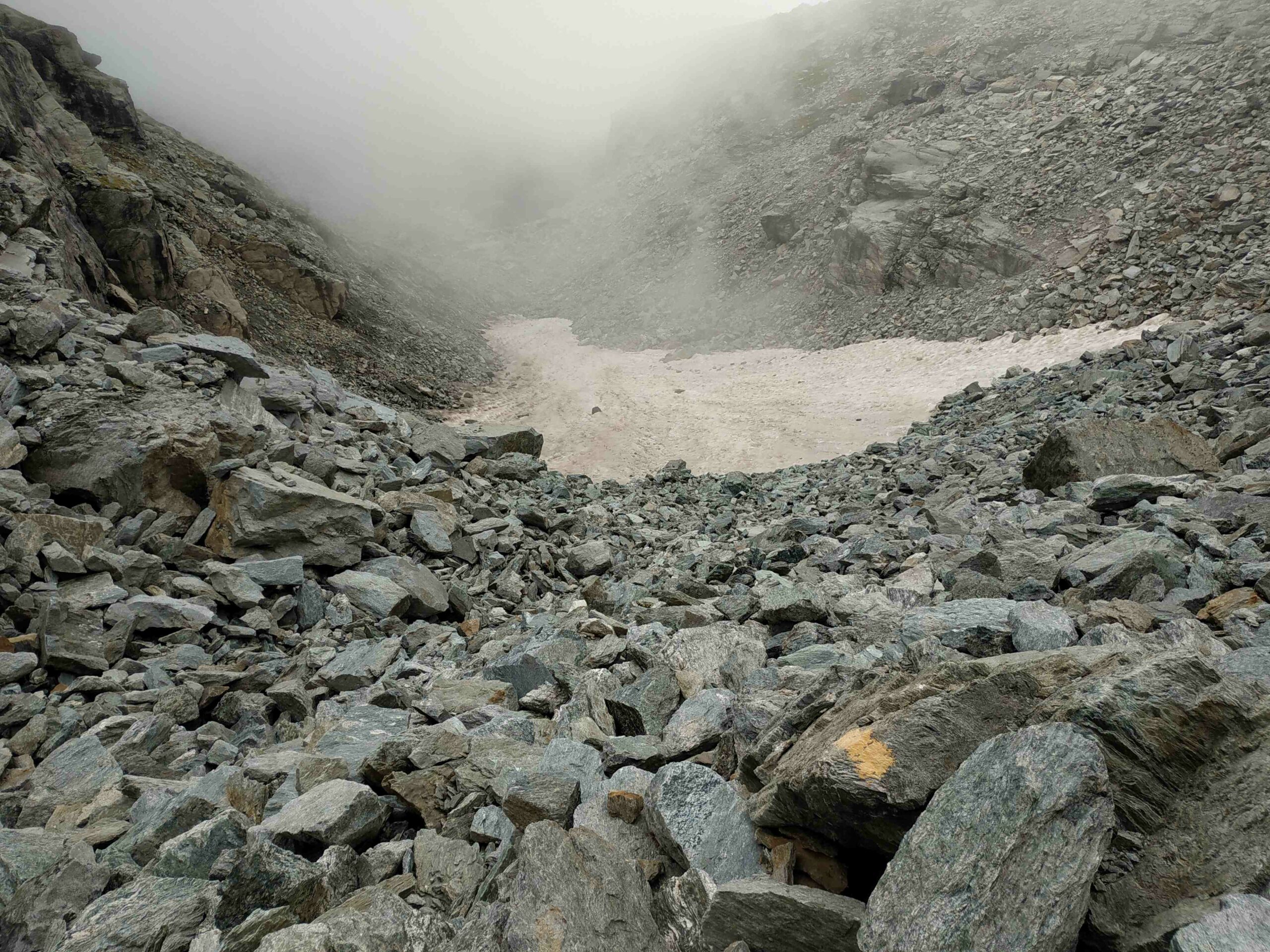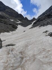 Il sentiero ormai si è ridotto a traccia e continua su pendii erbosi, bancate di roccia e pietraie fino a giungere al nevaio residuo presente sotto al passo. Attraversare il nevaio in piano, andando a sinistra, puntando ad una grossa croce bianca su un masso, e poi seguire i numerosi bolli bianco-rossi sulla petraia. Volendo si può risalire il nevaio fino al suo termine (utili i ramponi), giungendo in seguito sul tratto di detriti instabili che portano al Passo.
