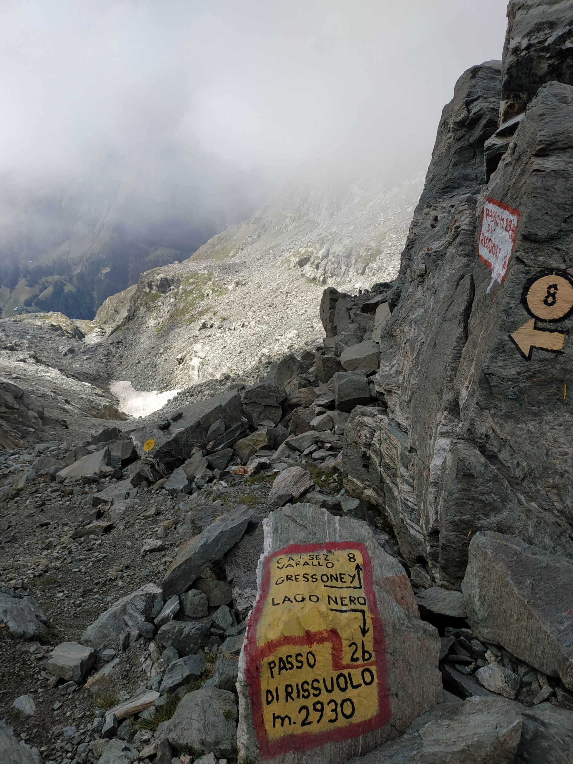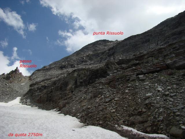 Tenere conto che sotto al Passo di Rissuolo c'è un nevaio sempre presente e che bisogna attraversare per giungere al colle. Potrebbe essere necessario avere picozza e ramponi (a seconda delle condizioni del nevaio). Il nevaio è facilmente aggirabile sulla sinistra su traccia segnata da numerosi bolli .