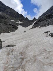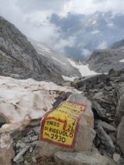 Il sentiero è stato segnalato nuovamente con l’aggiunta di numerosi bolli anche dove la traccia si perde. Ultimi 200 metri su nevaio, utilissimi i ramponcini. Sfasciumi nella parte finale per il passo. Abdicata la cima per l’arrivo di molta nebbia e rocce molto bagnate.
