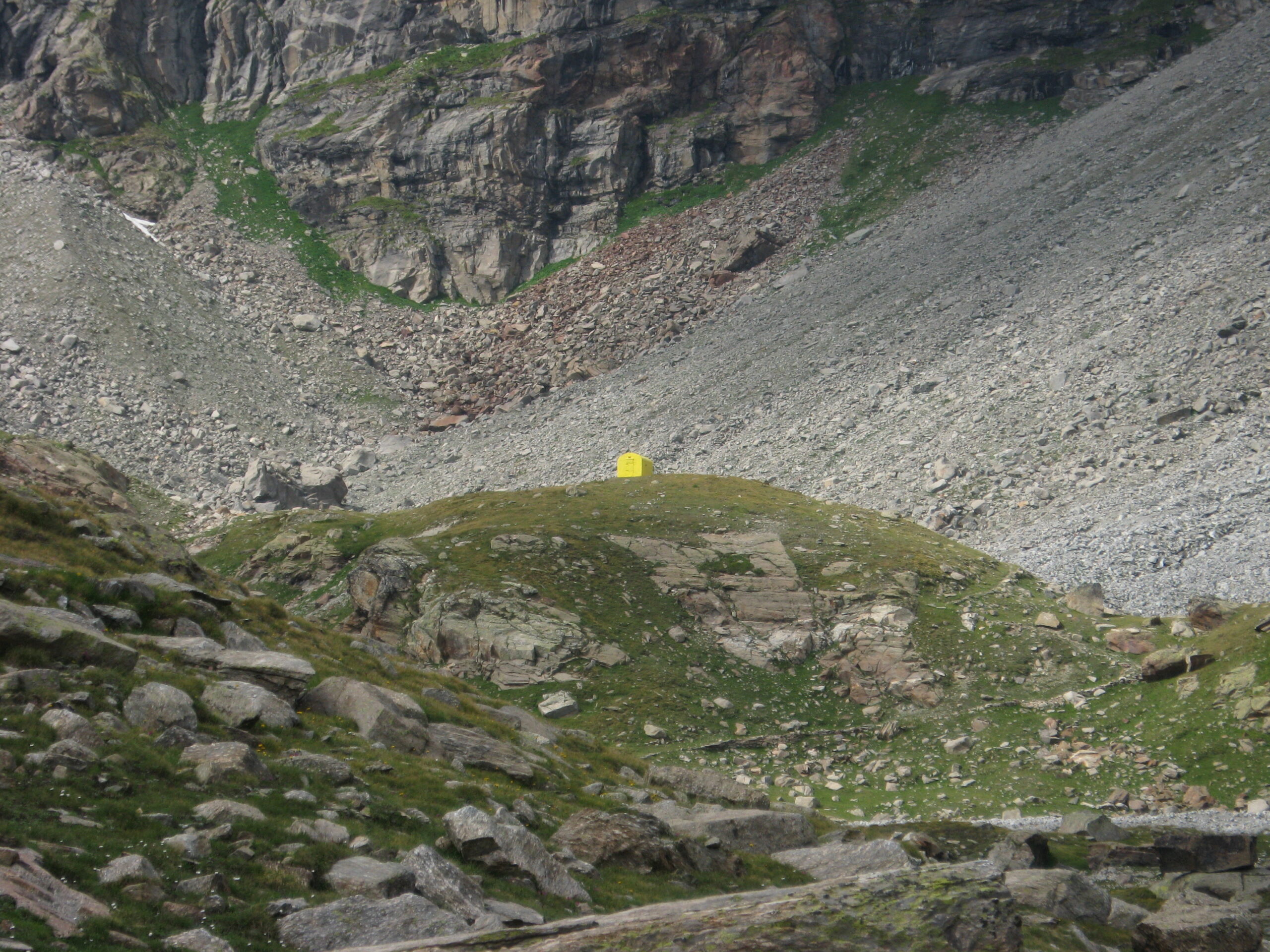 Poco dopo ci si sposta sulla destra del fiume e si prosegue fino ad altri ruderi, quelli d’Alpe la Motta, per poi risalire un pendio morenico fino al piano in fondo al quale sorge il Bivacco (2771 m).