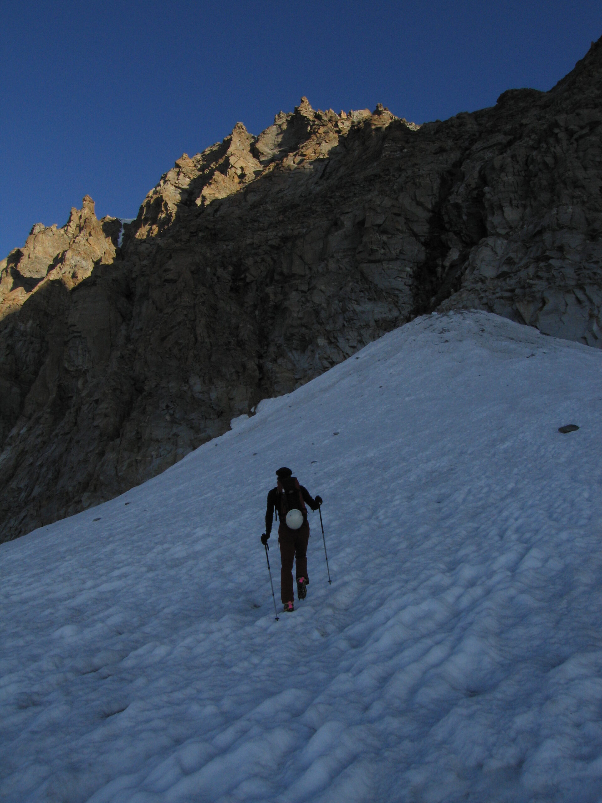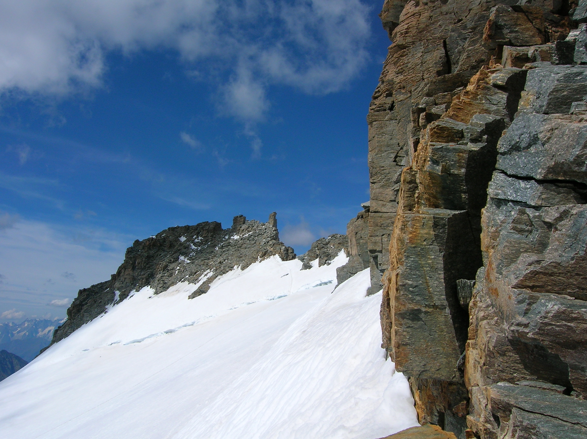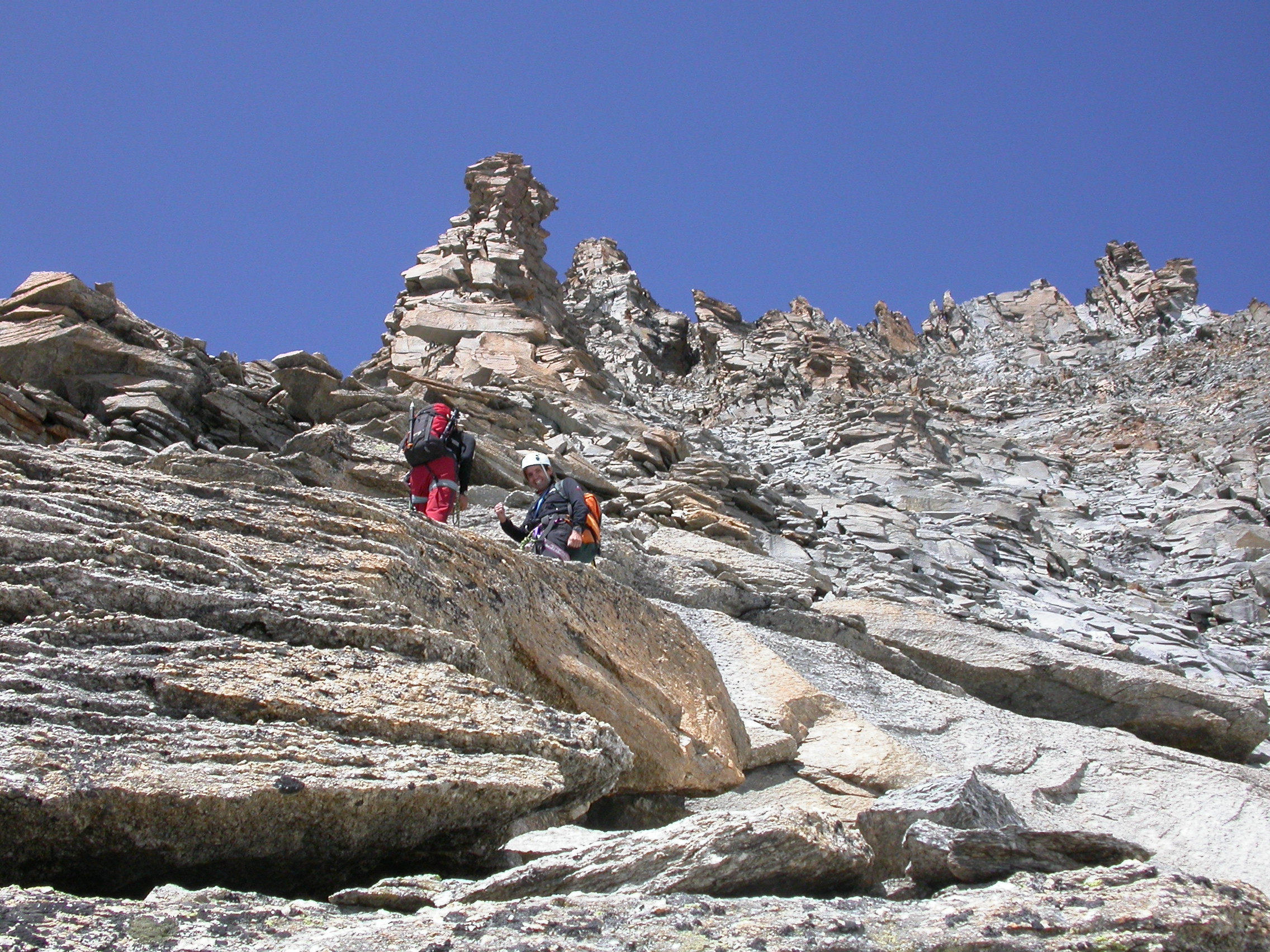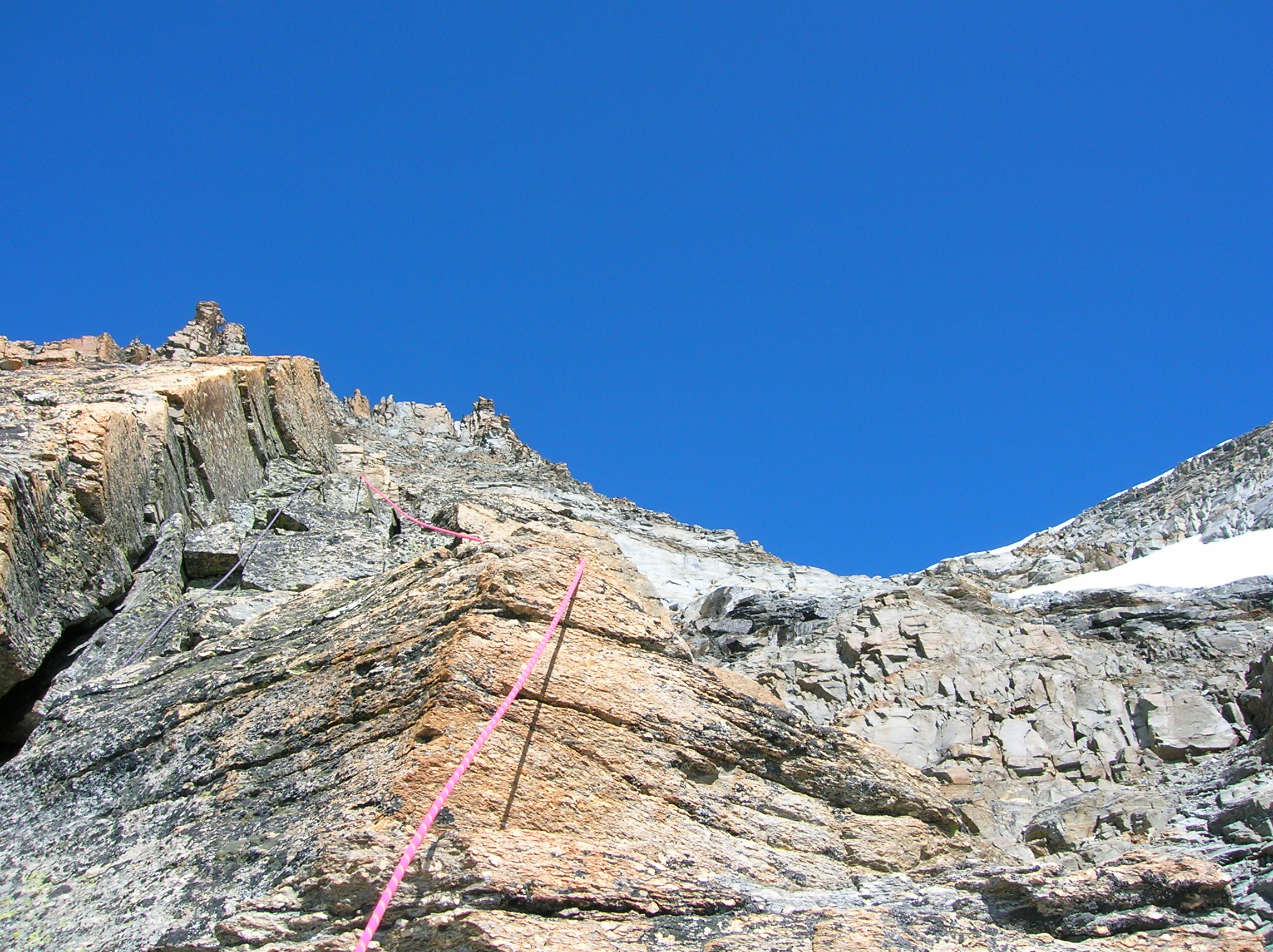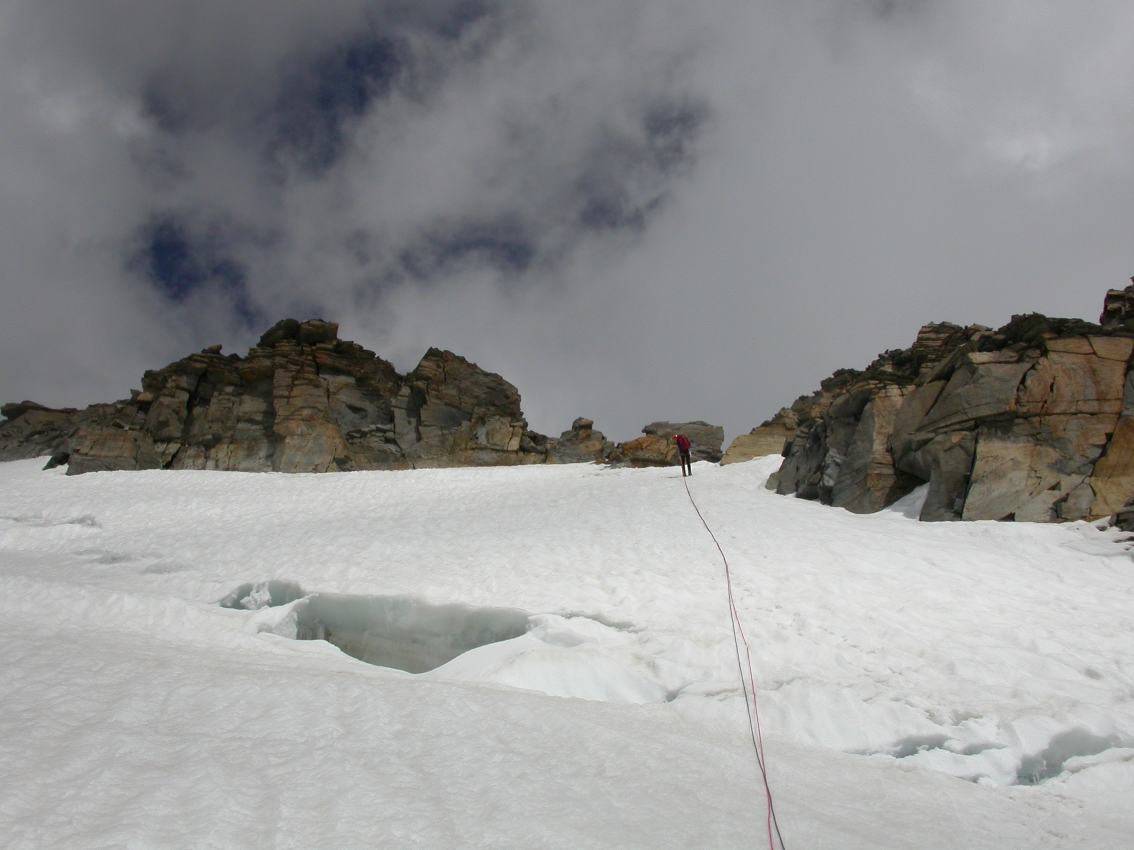 Qui (approssimativamente 3400 m), su rocce levigate, attacca la via (chiodo) e nei prima 30-40 metri si concentrano le principali difficoltà di tutta la salita (alcuni passaggi di IV, un paio di chiodi). Probabilmente esse non furono affrontate dai primi salitori in quanto a fine ‘800 il ghiacciaio arrivava certamente molto più in alto.