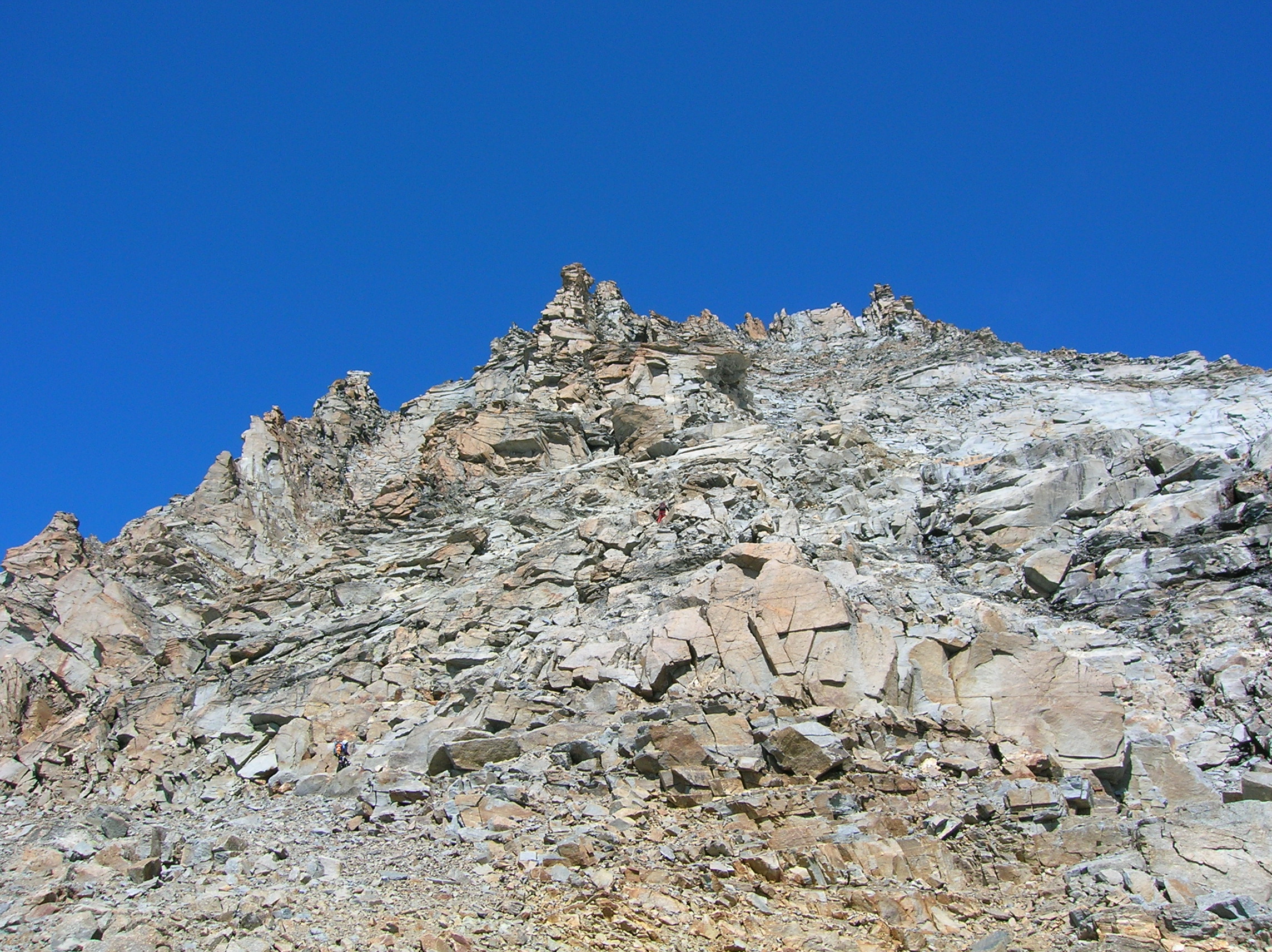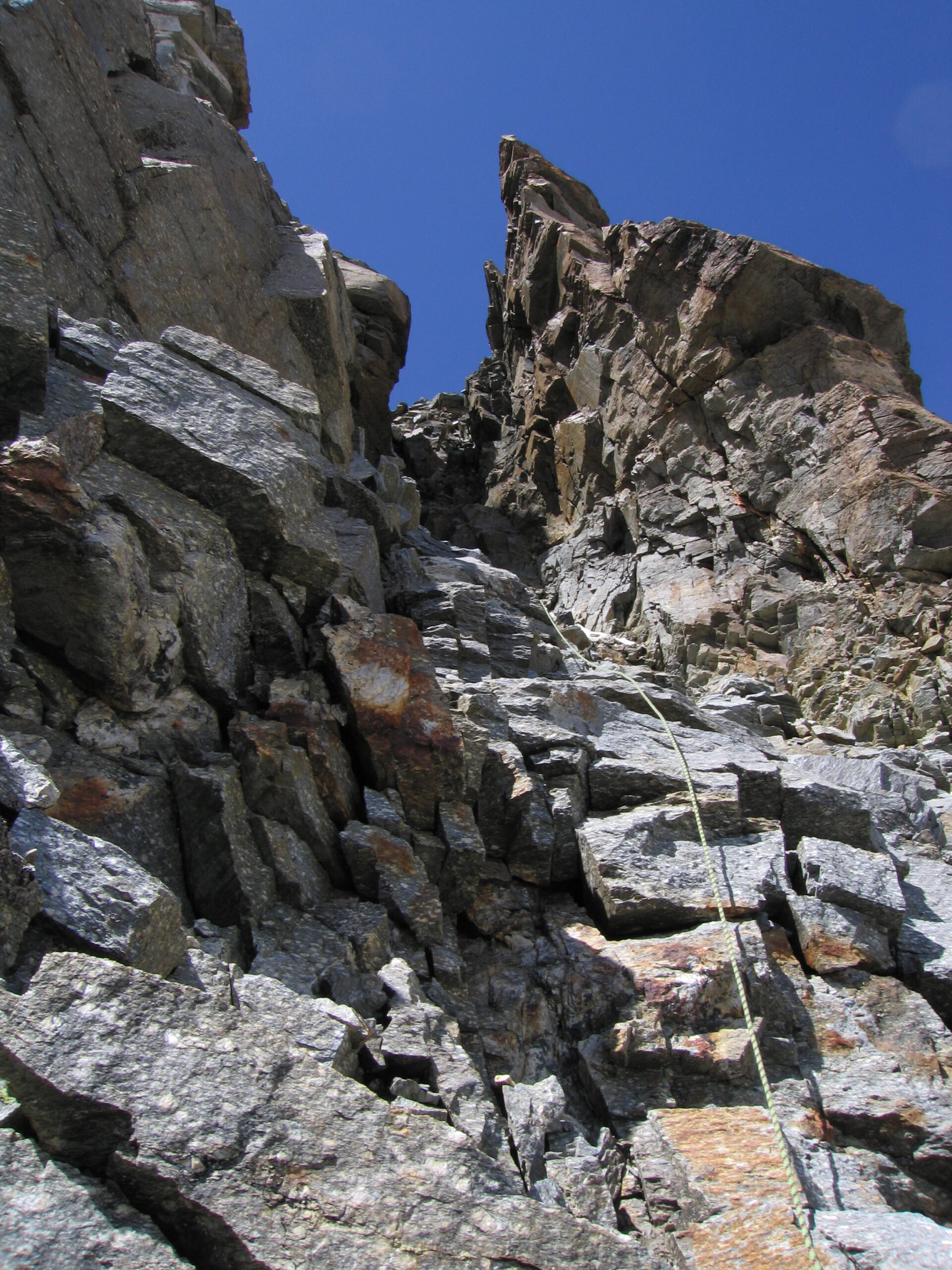 In questo tratto l’itinerario è abbastanza logico, di difficoltà modesta (mediamente II grado con un isolato tratto di IV) e roccia discreta nei punti più impegnativi. Bisogna però prestare la massima attenzione a non finire in zone friabili e a non smuovere la gran quantità di detriti di ogni tipo e dimensione presenti un po’ dappertutto.