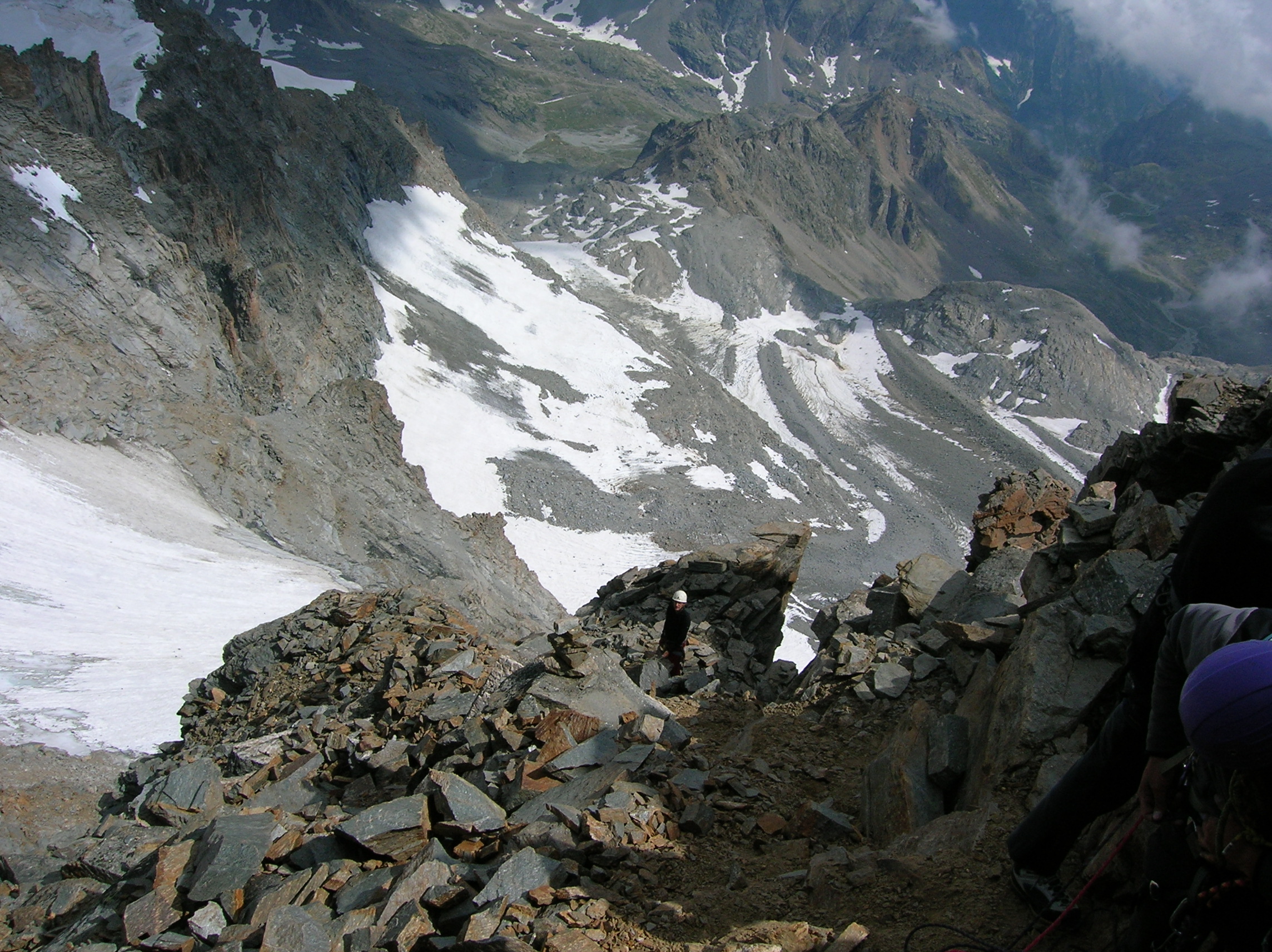 Si giunge quindi senza ulteriori difficoltà allo stretto intaglio a destra della vetta vera e propria del Roc da cui si scende per una cinquantina di metri su pendio nevoso fino a reperire l’enorme traccia di salita della normale al Gran Paradiso che si può raggiungere in una decina di minuti.