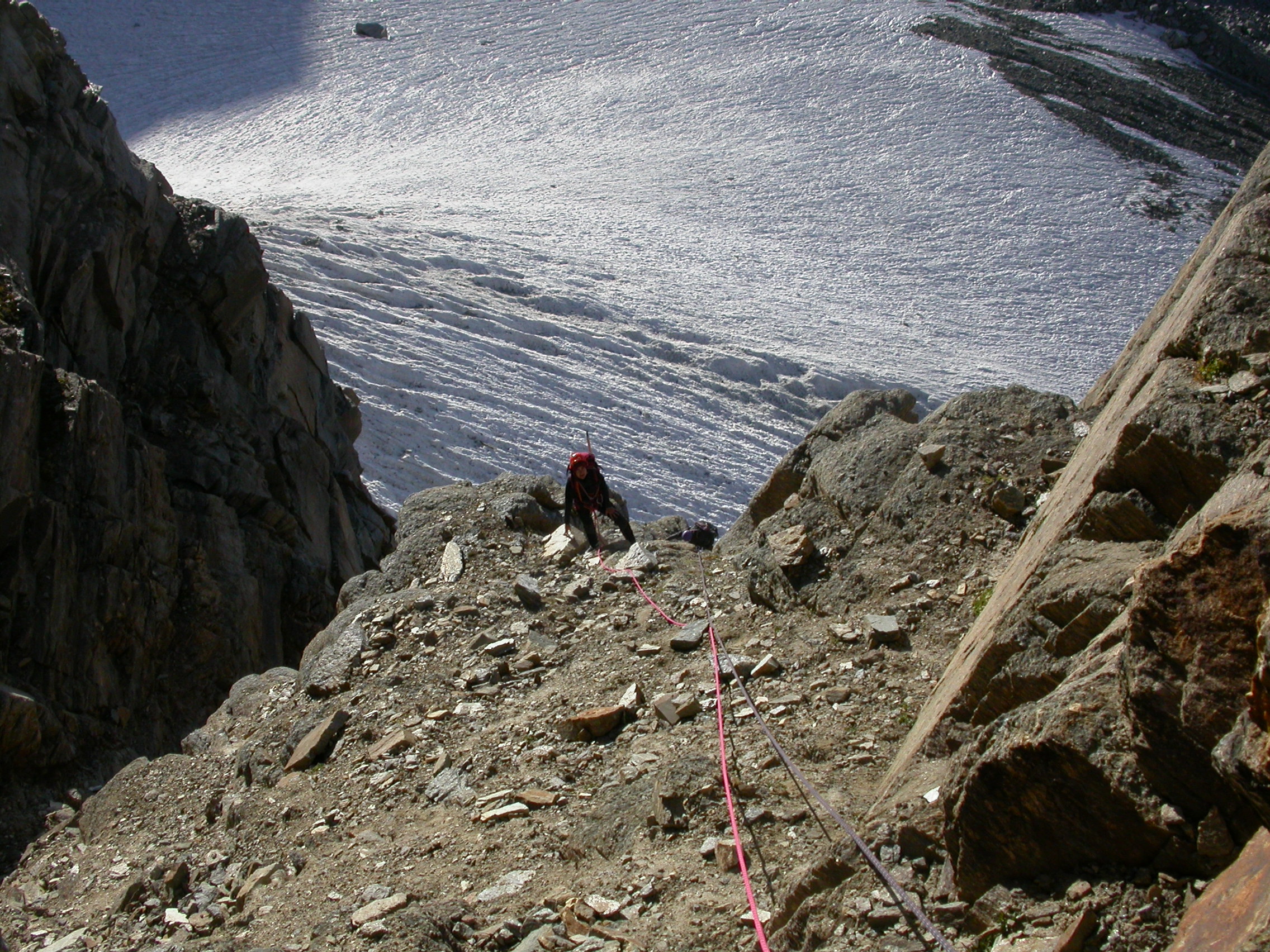 La pendenza ora diminuisce e si continua a fianco del ghiaccio (non visibile) spostandosi progressivamente verso il bordo sinistro della parete su rocce rotte senza difficoltà alpinistiche ma terreno assai instabile.