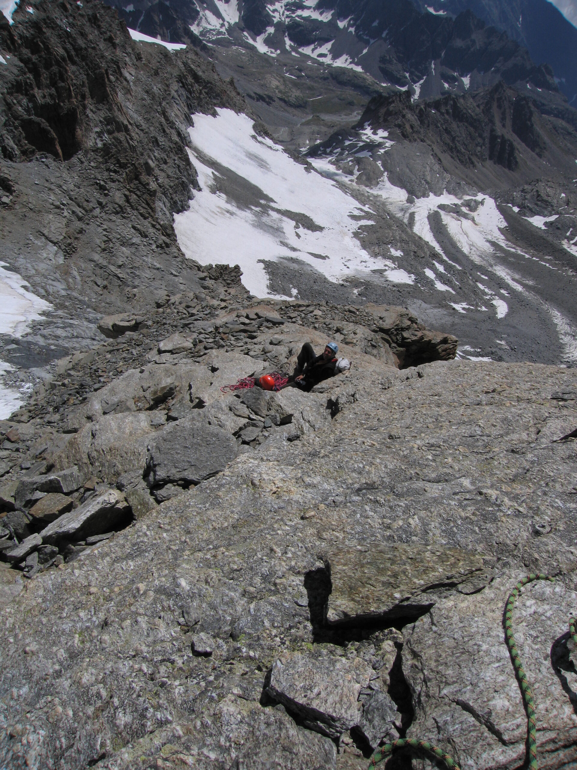 Prestare attenzione alla terminale di questa paretina che è in genere piuttosto aperta per cui può essere consigliabile (e veloce) attrezzare una doppia dall’intaglio. Alternativamente si può attraversare su neve verso destra fino alla finestra del Roc.