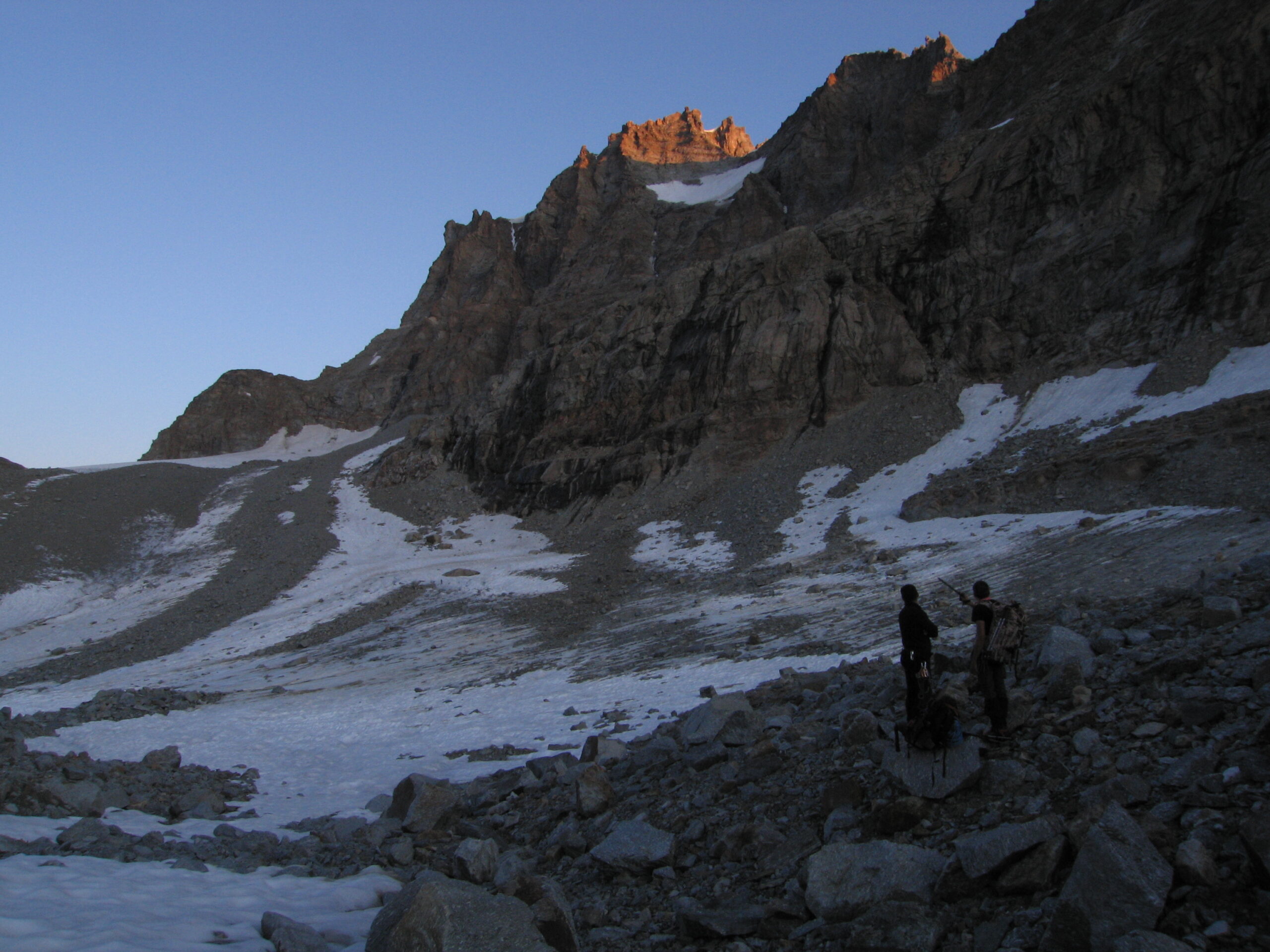 Si continua tenendosi sempre a sinistra del colatoio lungo rocce gradonate per circa altre cinque lunghezze di corda fino ad arrivare poco sotto la base del ghiacciaio dell’Ape.