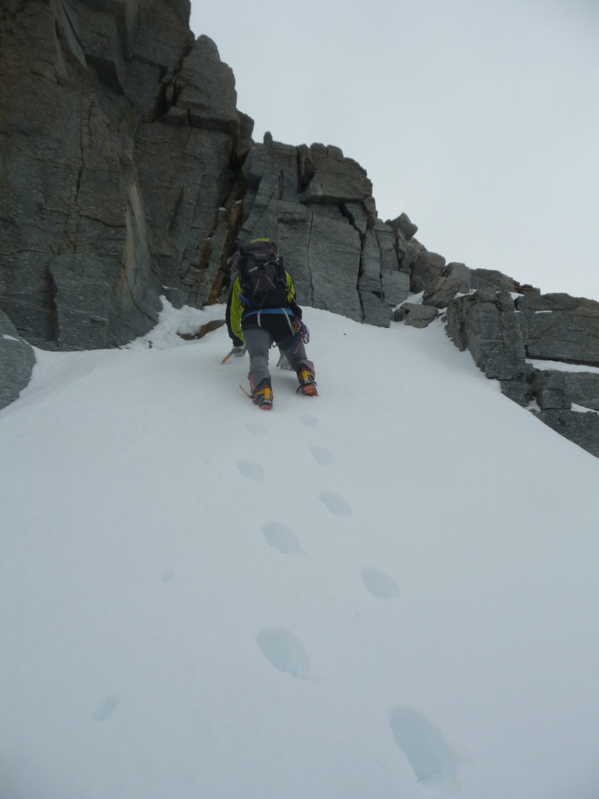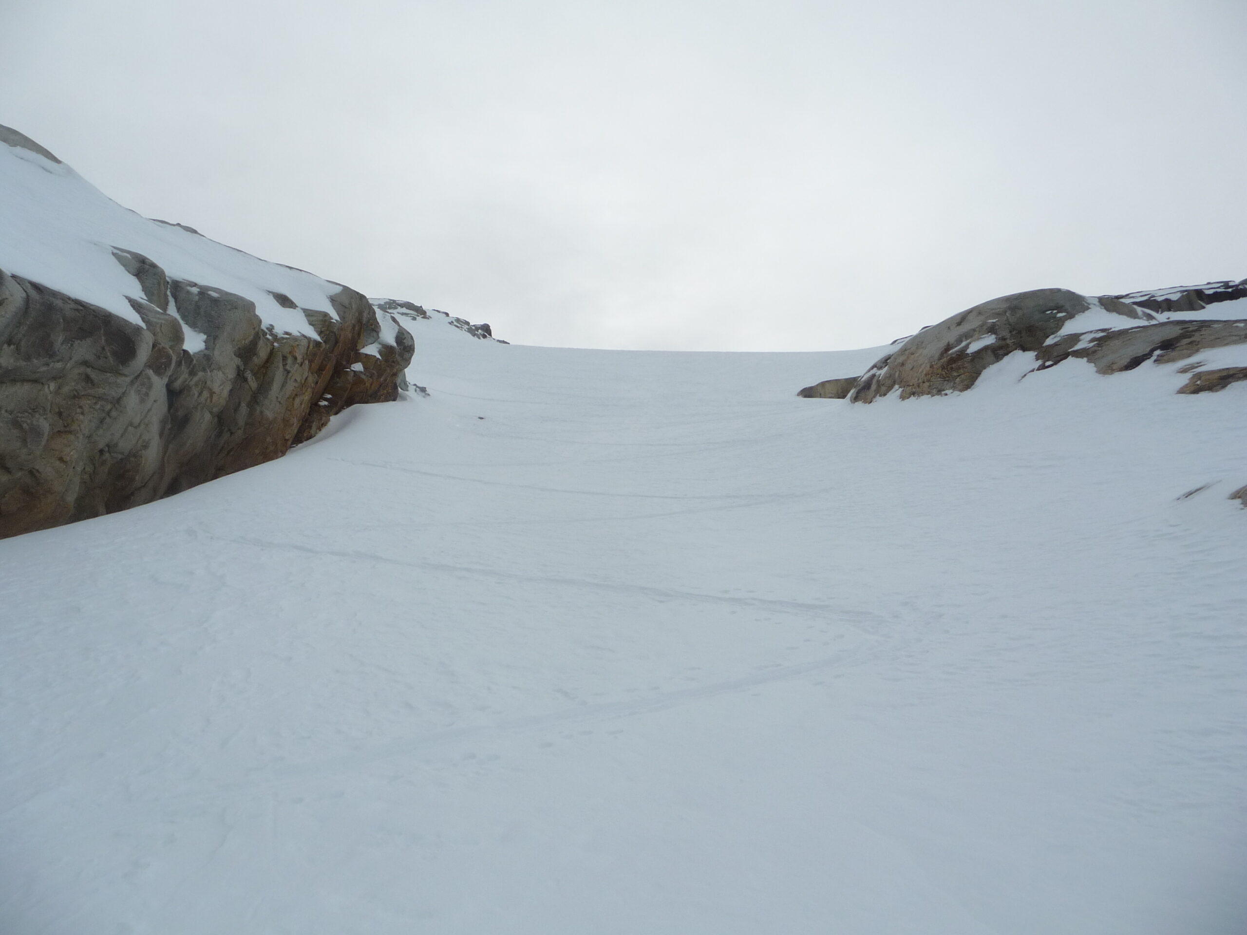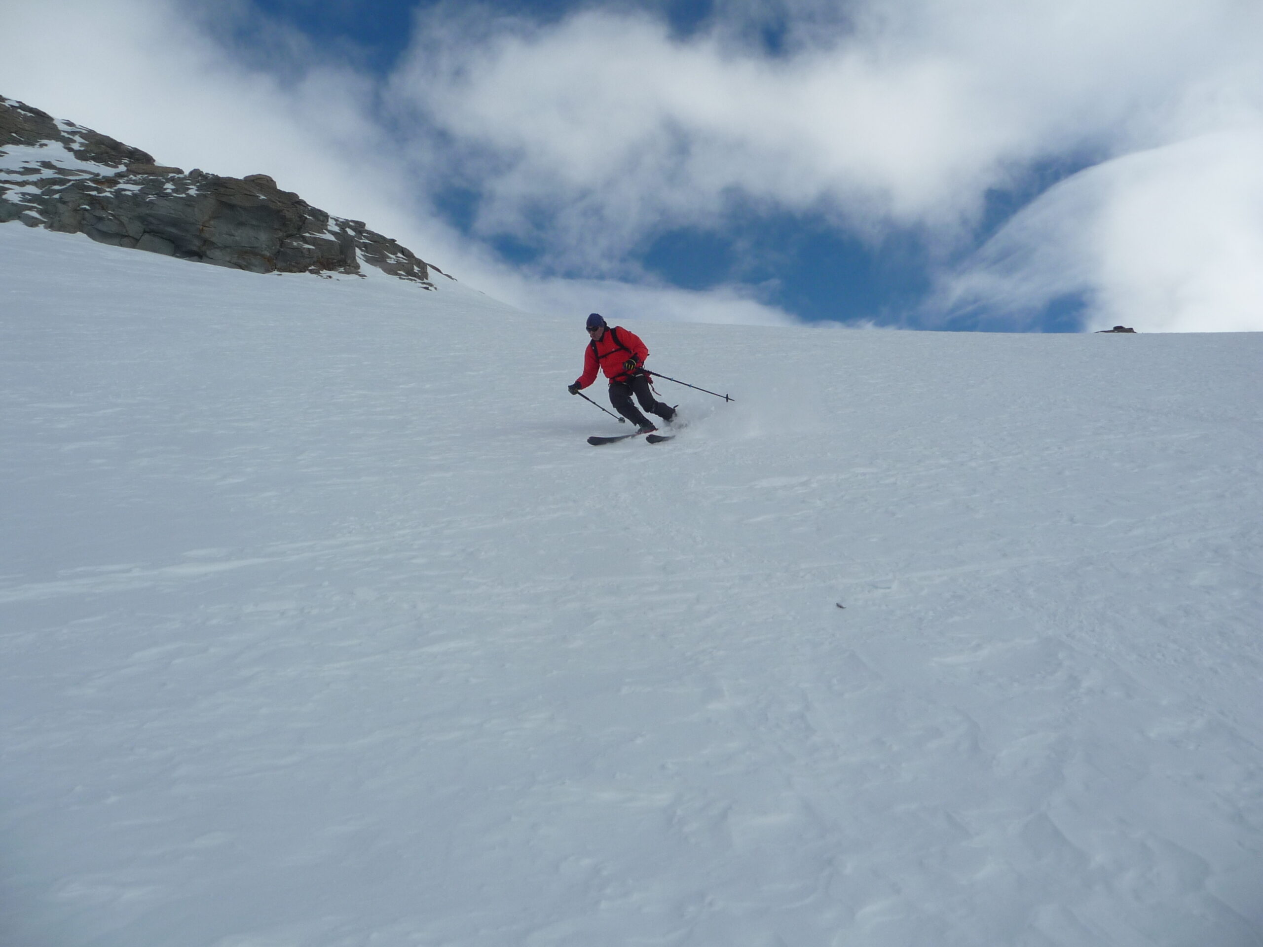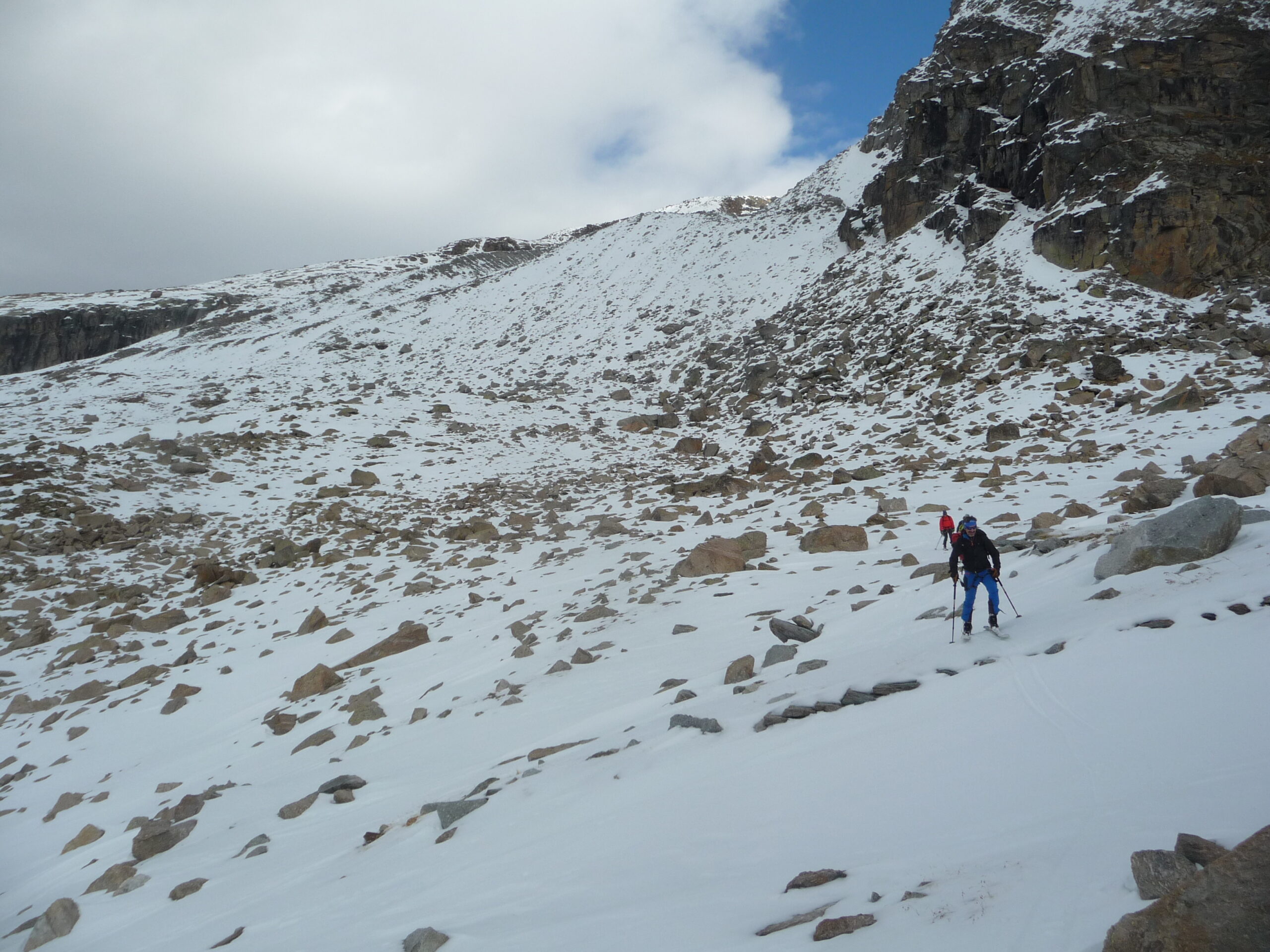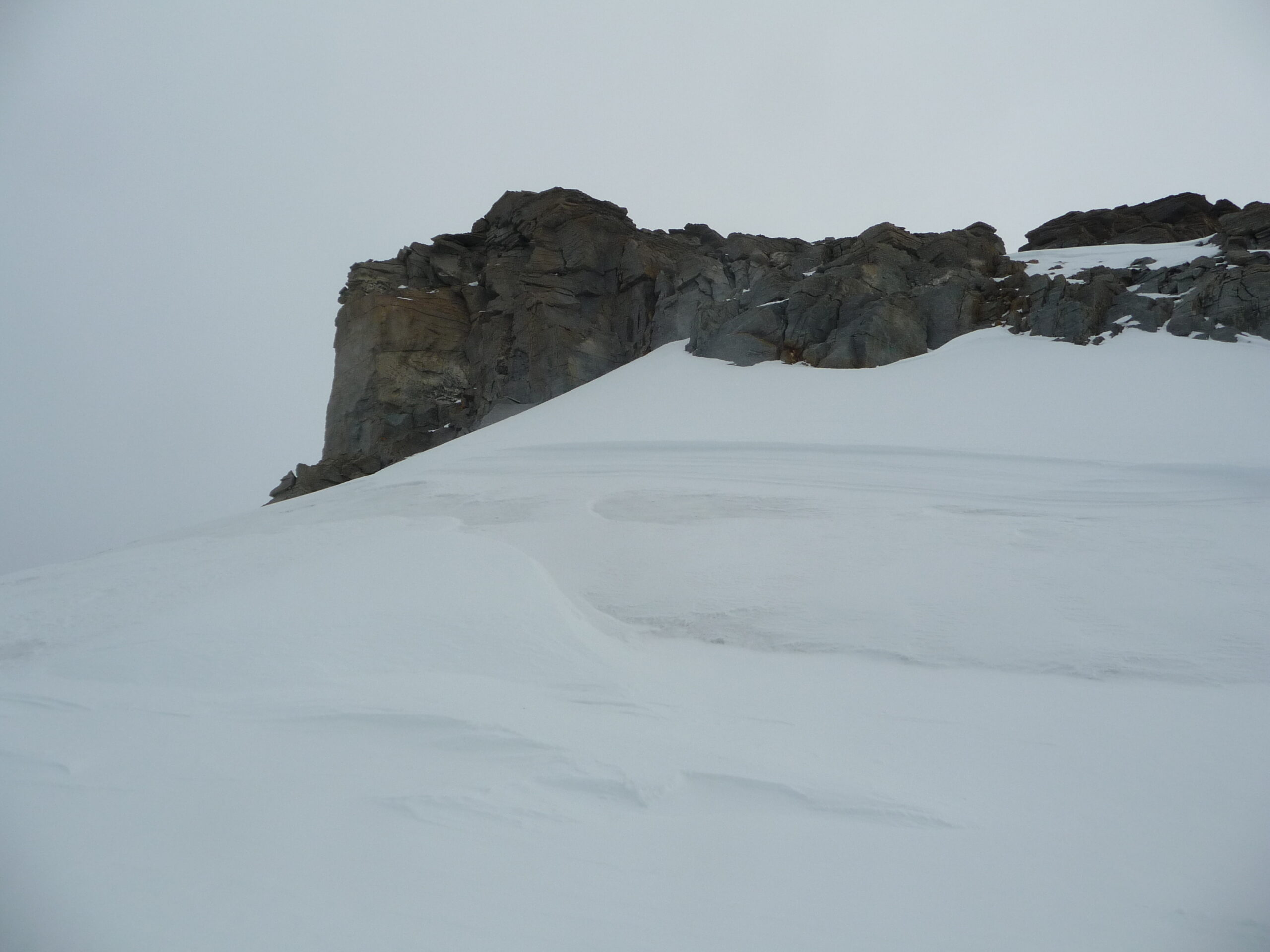 Partiti sci in spalla da Pont e fino al Vittorio Emanuele li sono rimasti. Al rifugio ancora poca neve ma dura e portante che consente di salire e scendere senza particolrai problemi. Dai 3000m circa innevamento abbondante ad eccezione della parte alta spazzata dal vento. Arrivati sotto al Roc ci facciamo tentare da questa vetta che non avevamo mai salito. Lasciati gli sci al colle dopo la terminale si calzano i ramponi e una prima rampa nevosa conduce a facili roccette che portano sull’aerea vetta. Neve nel complesso portante ma oggi le spesse velature hanno reso tutto omogeneo…
