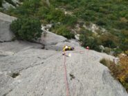 - L2) 6a, 20m. Salire sulla verticale della sosta e poi a sinistra, sempre su fix. Si arriva ad una sosta da rinviare per poi spostarsi a dx in orizzontale per 5 metri fino ad altra sosta su cengia.