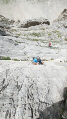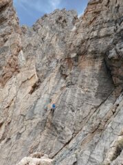 - L8 splendido muro , seguito da sezione strapiombante più difficile, superata la quale si giunge più facilmente alla comoda sosta sul filo di cresta . 40m _ 8 fix e un chiodo _ 7a