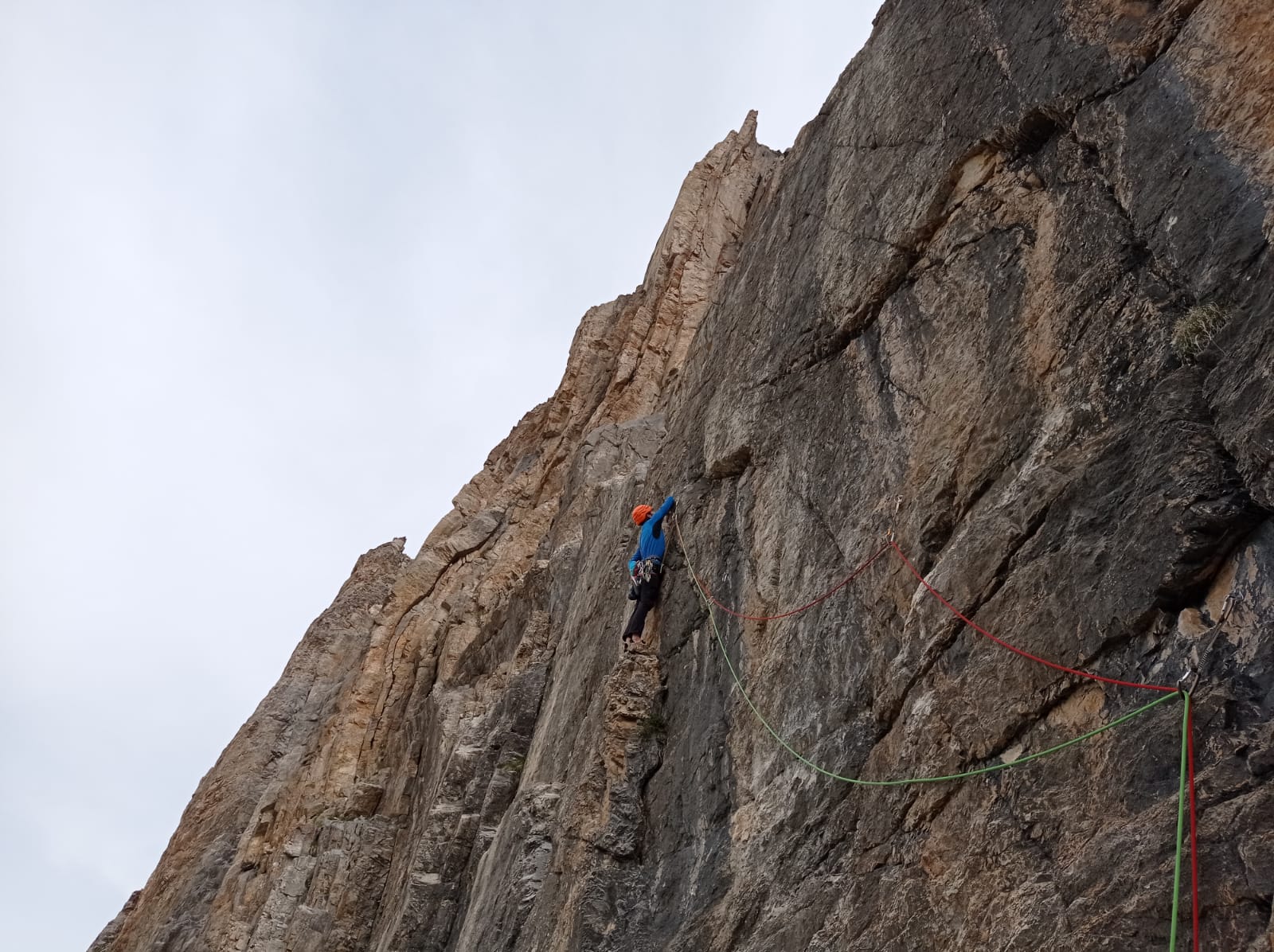 - L2 bel muro con sezione difficile che adduce ad un diedrino , al termine di esso traversare a cengietta a dx , seguita da bellissimo muro grigio, uscire poi verso SX in un piccolo canale su roccia più fregile. Sosta comoda in cima al torrione. 45m _12 fix_ 7a