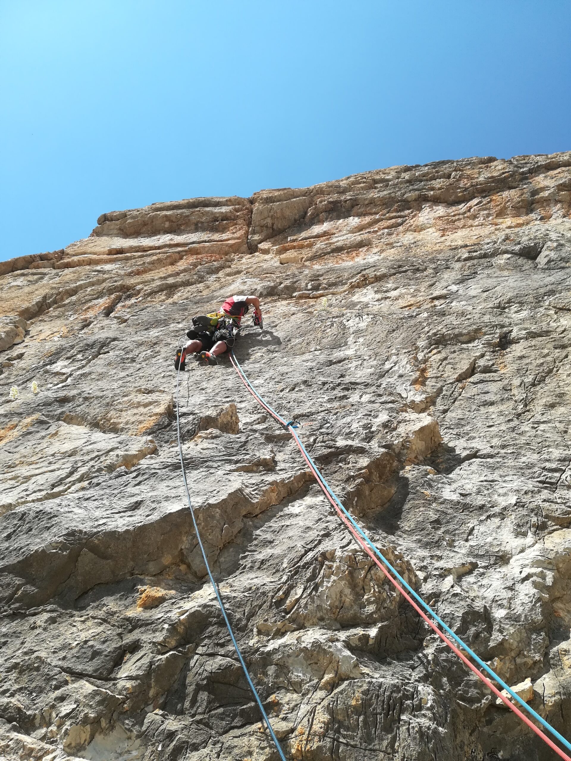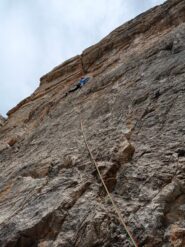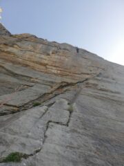 - L4 salire bella sequenza lungo fessure e placche (più difficile se si rimane sempre in placca!), sosta presso breccia gialla al termine del muro. tiro su roccia decisamente abrasiva. 60m_8 fix_6a
