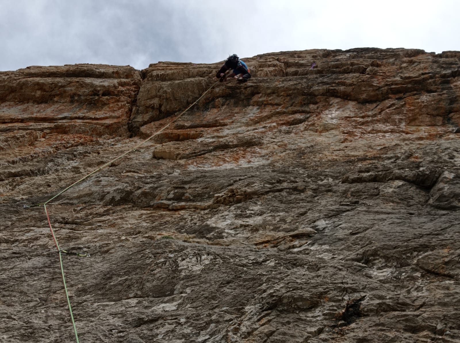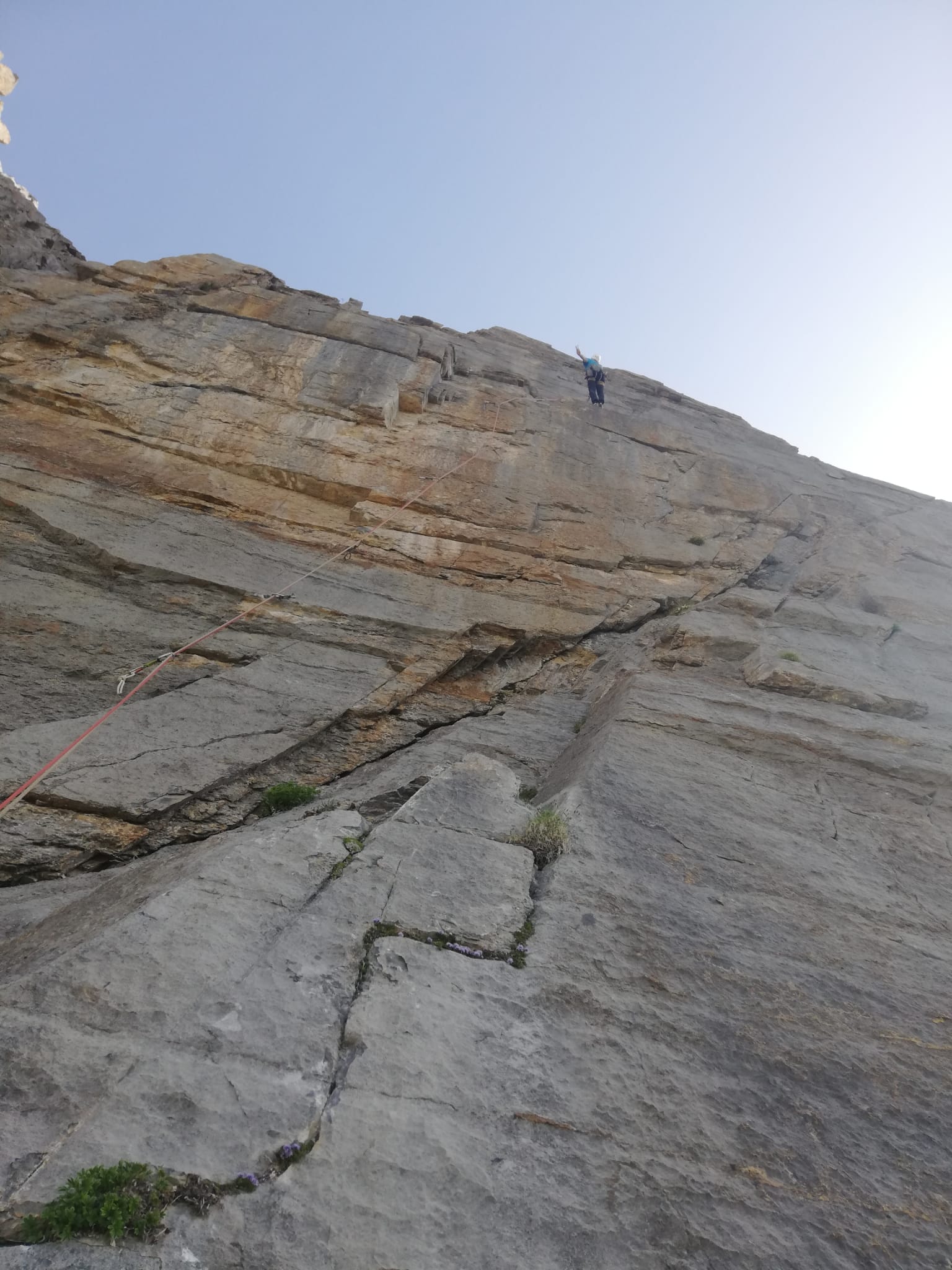 - L6 bello sperone su roccia gialla , piccolo tetto seguito da tratto più facile. Giunti a ultimo fix su roccia gialla , proseguire ancora verso DX senza sbucare oltre il torrione. La sosta si trova sul lato di salita!! 35 m_8 fix_ 6a+