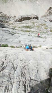 - L1 traverso a sx seguito da muro verticale con colature nere, sosta su comoda cengia erbosa _ 30m_8 fix_ 6b+