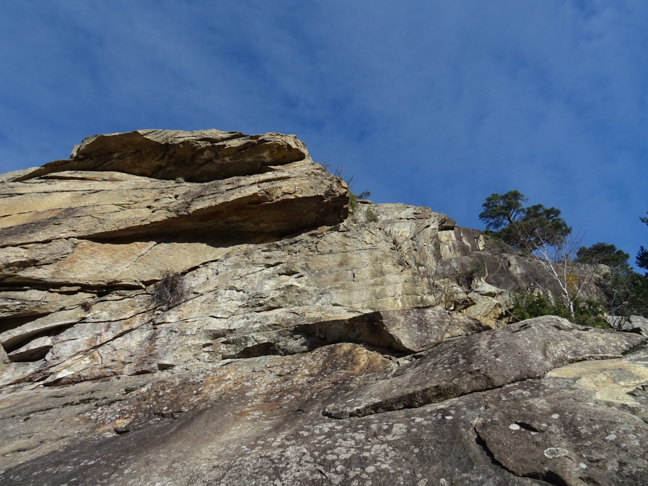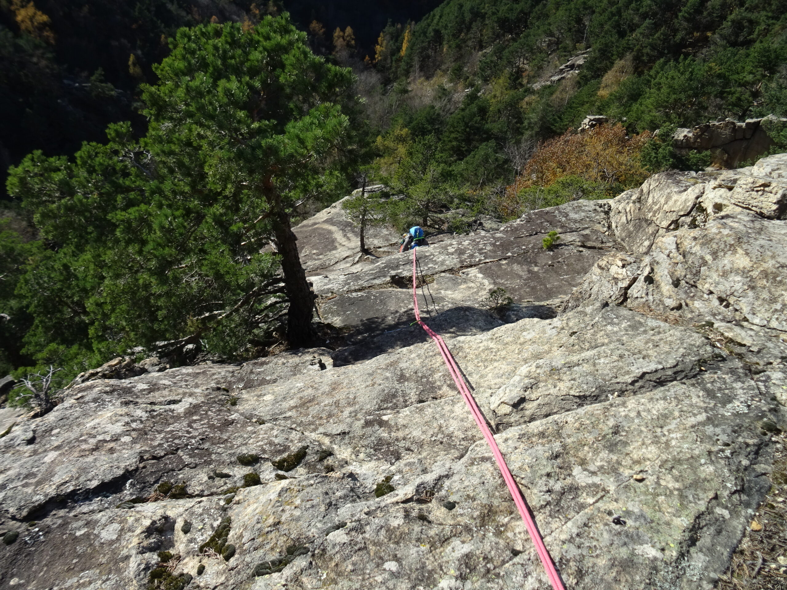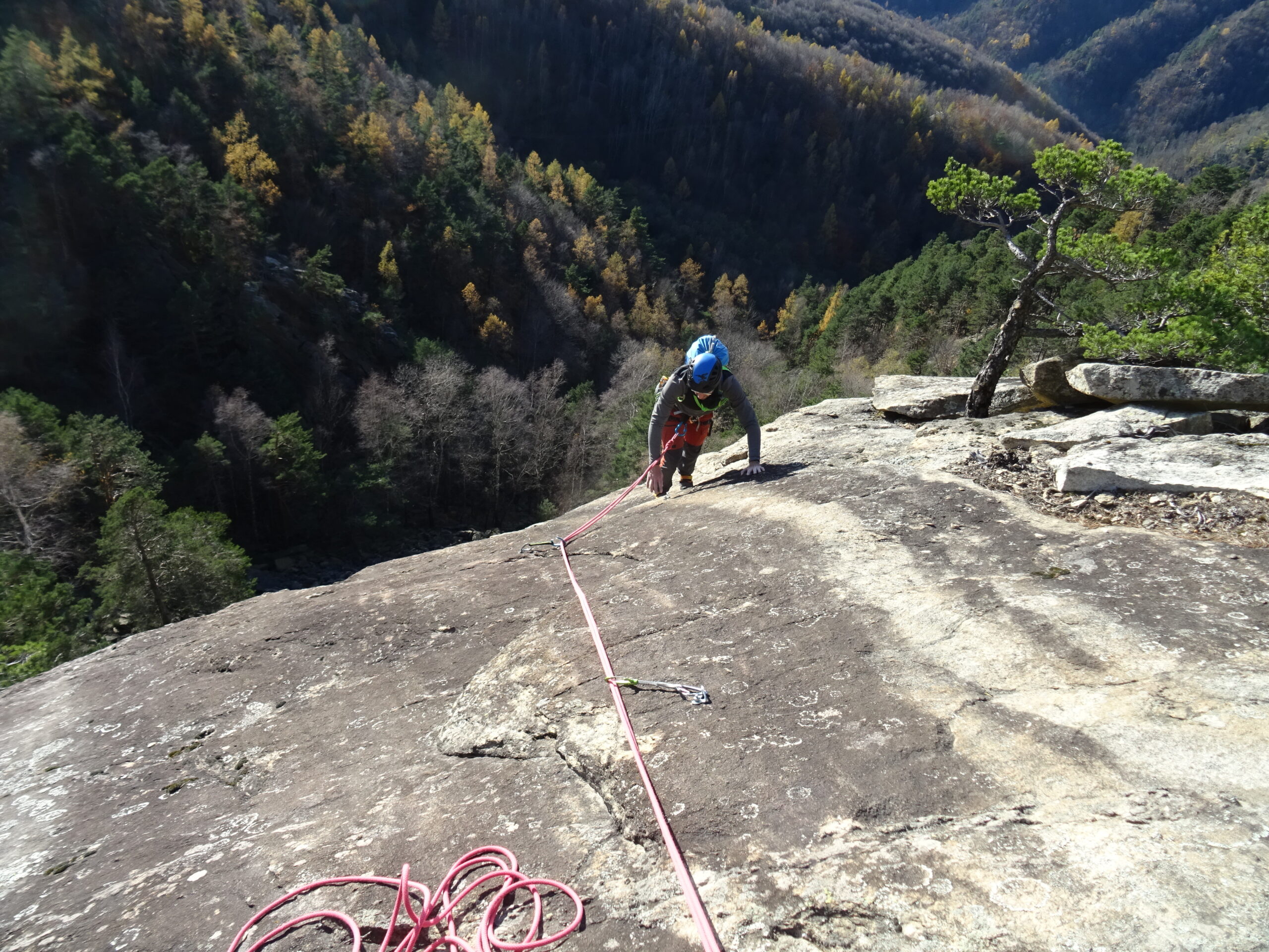 Mes e Mes: L1 20m, 6a diedro con passo aleatorio e breve strapiombo; L2 25m, 5c tetto e placca; L3 25m, 5a muretto verticale, traverso e placca appoggiata; L4 25m, 5c placche lisce e ripide