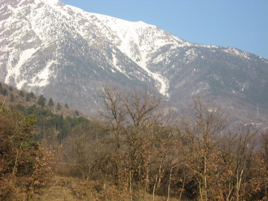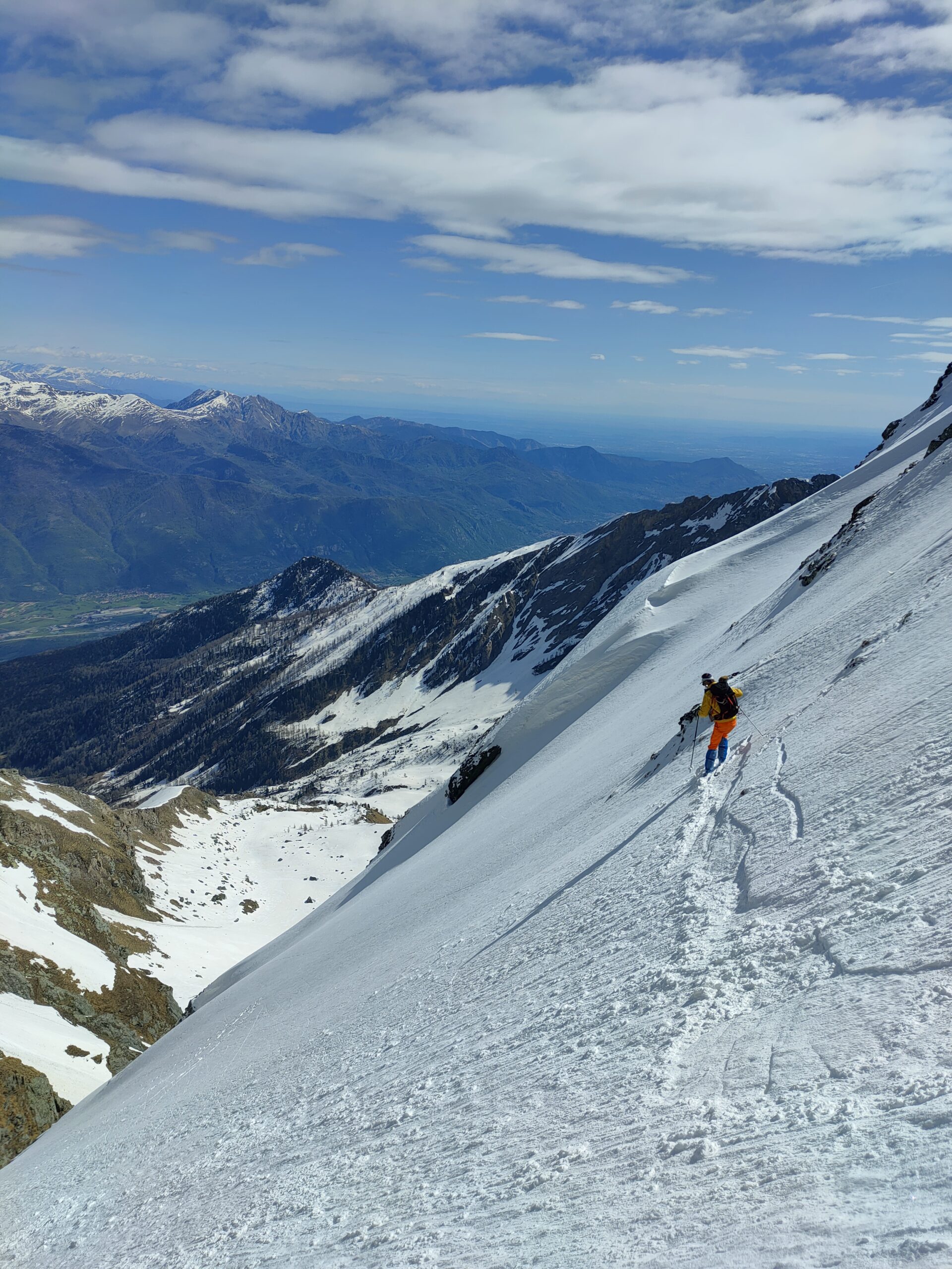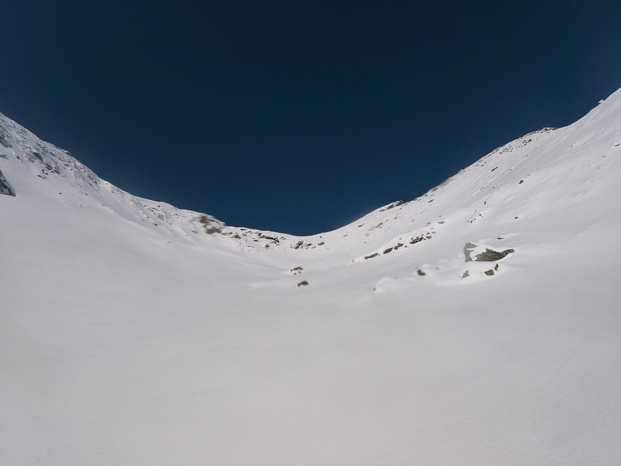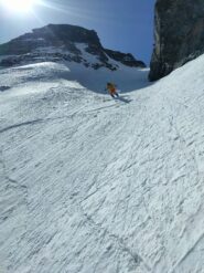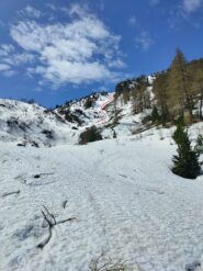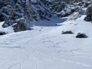 Palas dla Cesa da dove si vede il canale quello piu’ a destra lungo circa 500 mt di disl. con pendenze sui 40 gradi con gli ultimi 100 mt a 45 fino all’uscita in punta alla Rocca Nera.Come via di fuga