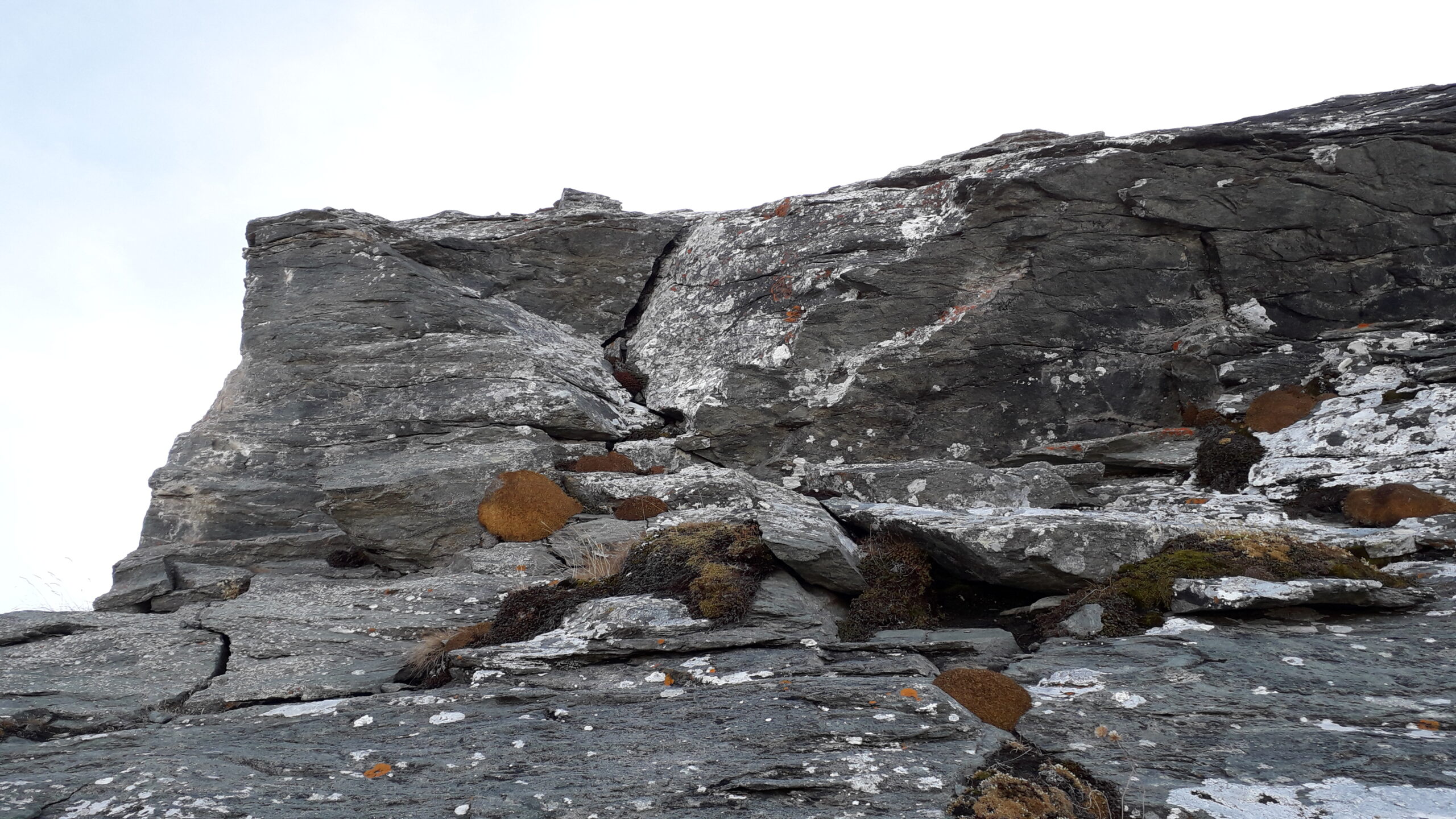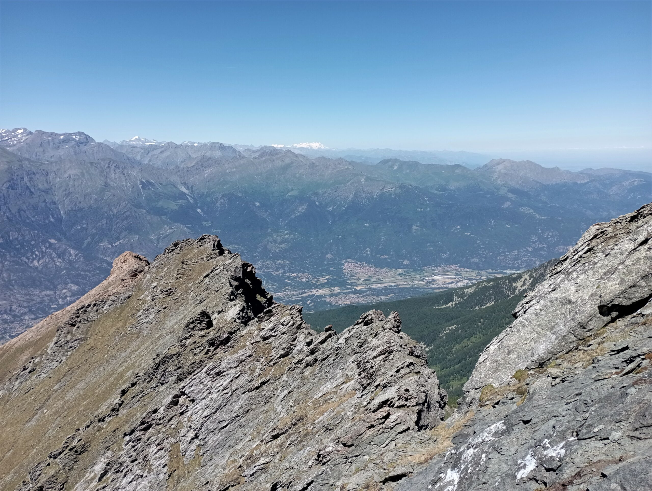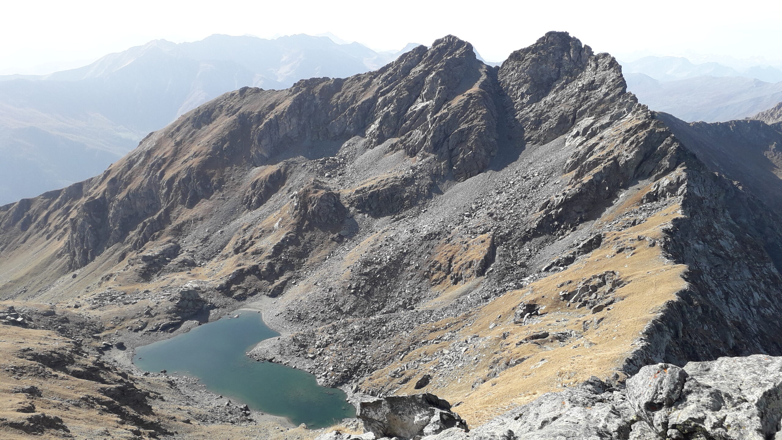 Altrimenti dal colle scendere fino alla bergeria Balmerotto, dove sulla sx è presente una traccia (ometti) che conduce al passo del Qiot, alla base della punta di mezzodì. Seguire la cresta inizialmente erbosa, tenendosi a dx del filo, quindi risalire placche scistose sempre più ripide che conducono inevitabilmente verso sx e sul filo. L’ultimo tratto è piuttosto affilato e più delicato, per la pessima qualità della roccia.