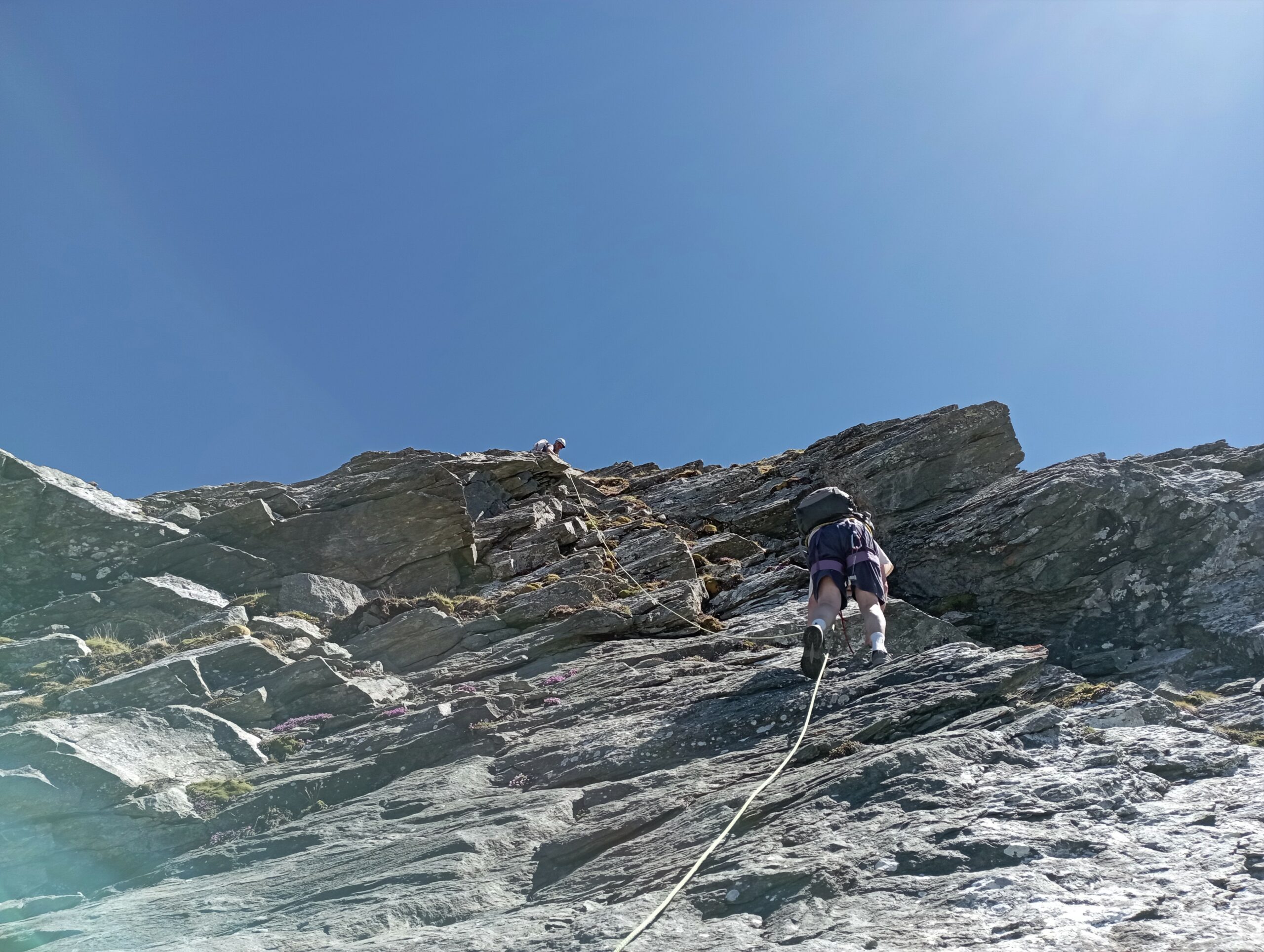 Le ripide placche finali sotto la vetta della Rocca Nera si superano piegando leggermente sulla dx e imboccando un vago canale più gradinato che verso sx porta direttamente alla croce di vetta, stando invece sul filo di sx si incontrano divertenti pasaggi sul III.