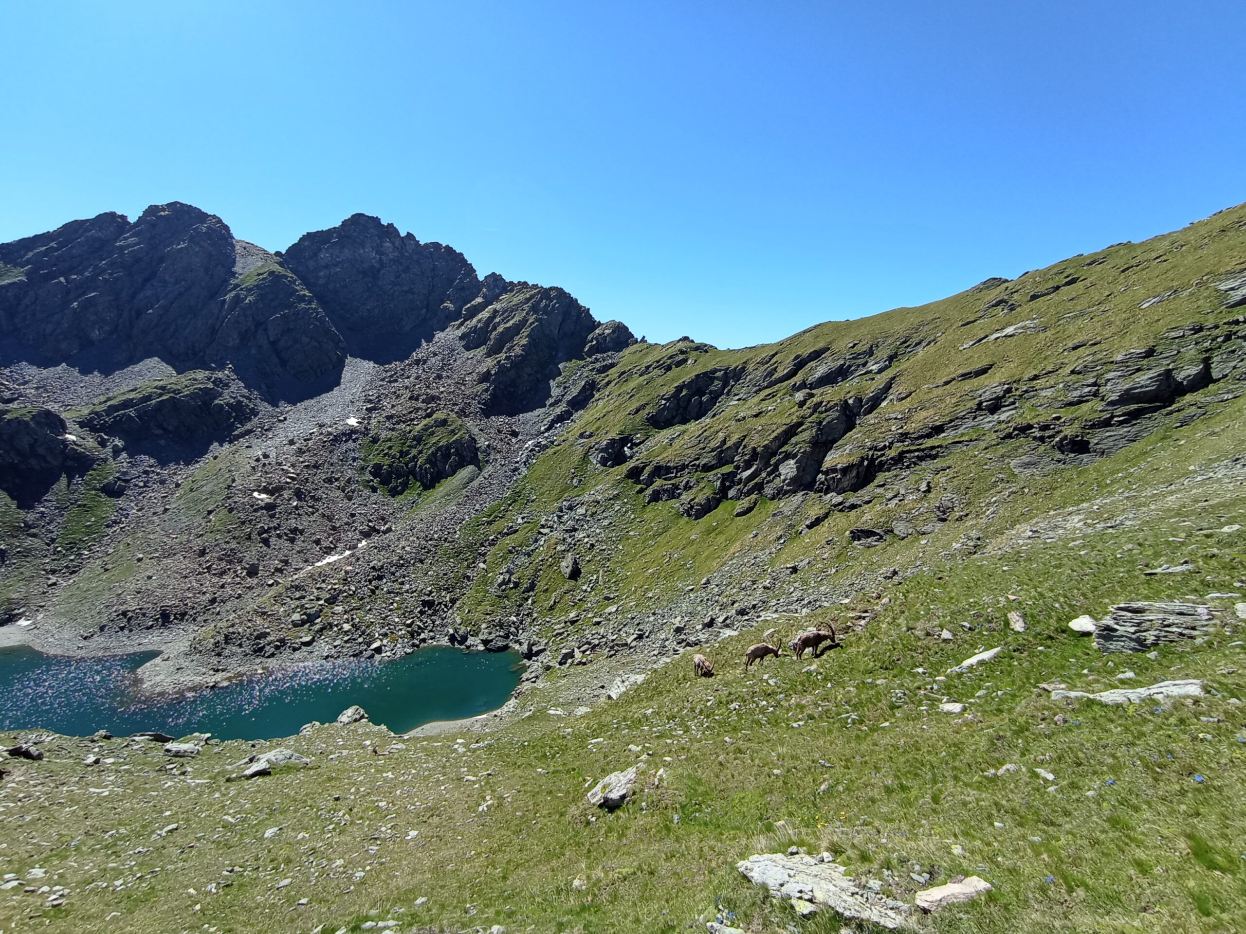 Scendere dalla parte opposta (N) per un ripido canalone per un centinaio di metri, quindi con un secondo traverso a mezzacosta verso sx (N), sotto le pareti rocciose della Rocca Nera, puntare alla cresta NE della Punta di Mezzodì (tracce di animali sui pendii erbosi aiutano a raggiungere la dorsale).