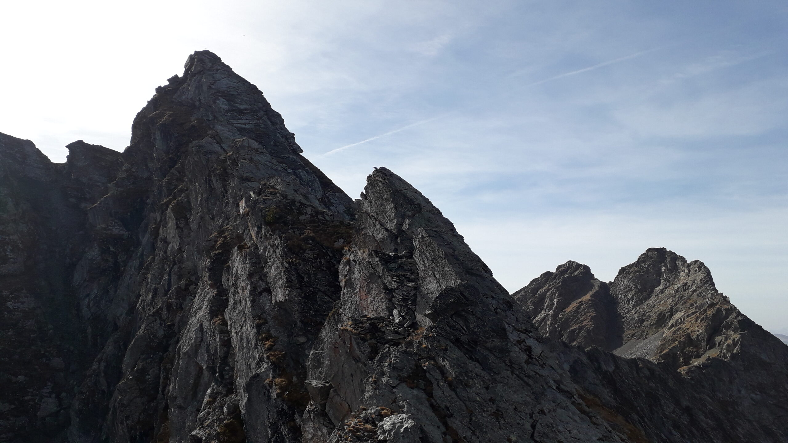 Dalla vetta scendere al colletto poco a sud, quindi attaccare la cresta N della Rocca Nera, di roccia migliore (prasinite) ma non sempre solida. Tenendo il filo superare i vari torrioni.