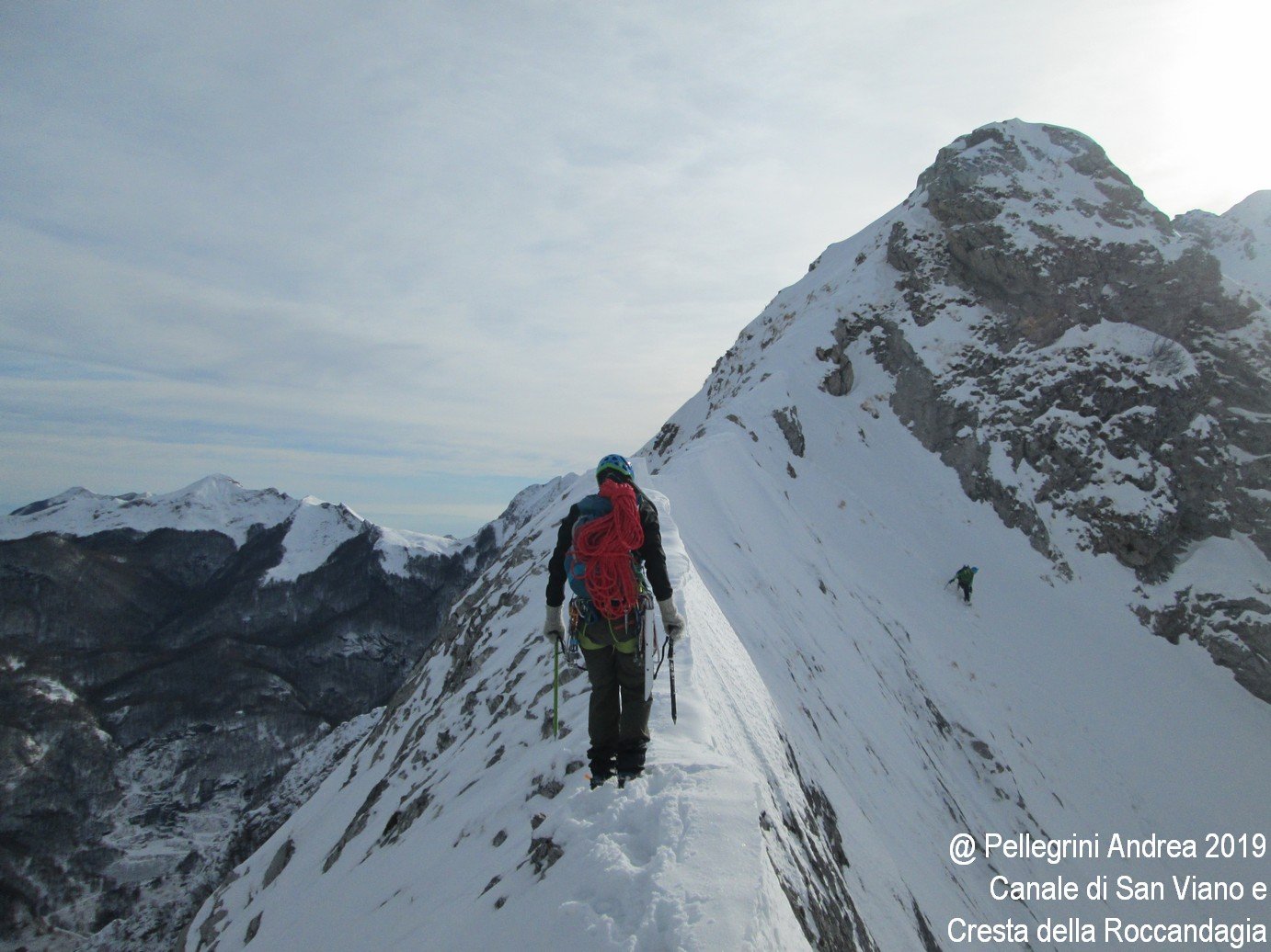 Per il canale di San Viano, primo tratto in piolet traction discendente fino ad una sosta. Da questa si scende tutta la corda e si sosta nel canale, possibile un’altra doppia su sosta da rinforzare oppure scendere al meglio fino al limitare del bosco. Entrare in questo e traversare verso sinistra senza perdere quota passando sotto l’attacco della cresta Sud Est e di qui fino ad incontrare il sentiero e poi la strada che riconducono a Campocatino.