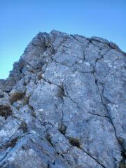 Il punto delicato successivo è una specie di breve cengia rocciosa e liscia, da fare attenzione (presenti due fix e un chiodo per eventuale conserva protetta).