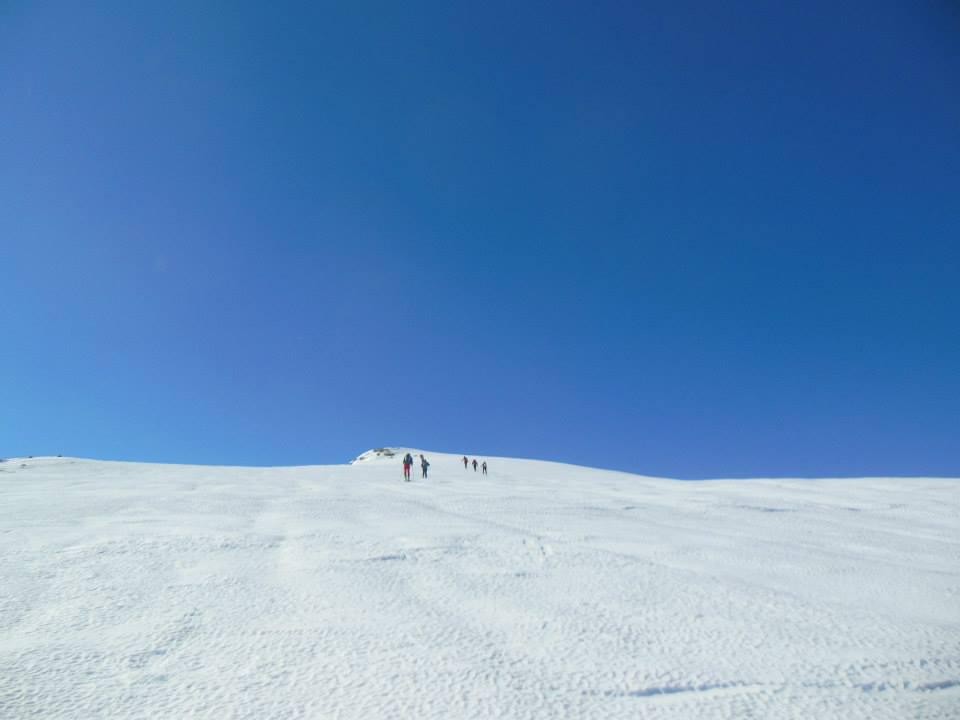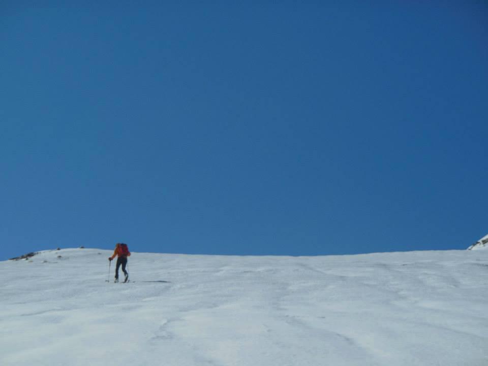 Dopo aver seguito la forestale per circa un’oretta, abbiamo deviato a sinistra per traccie, che ci hanno condotto dapprima nel bosco e poi in un’ampia valle (fantastica). Pendii finali su neve dura, ma ottimamente sciabile. Nel bosco farina.