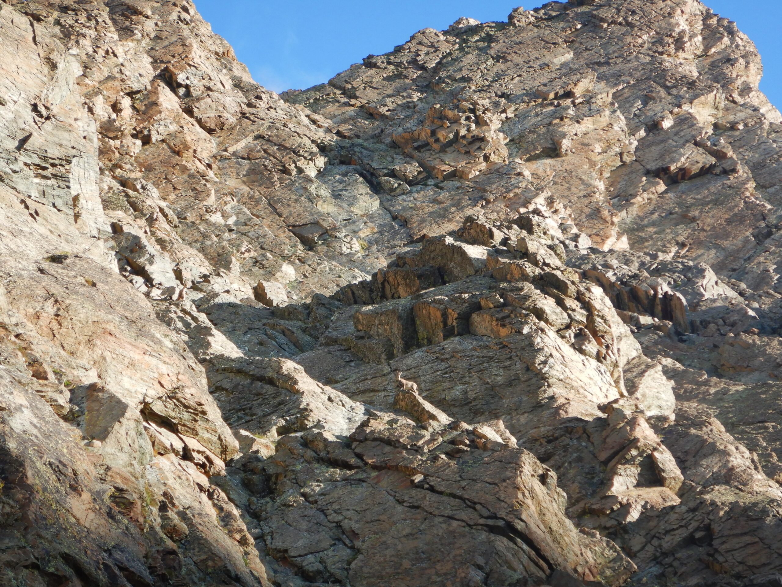 Si torna quindi al Colletto Fiume e su infidi sfasciumi si scende (attenzione: muove tutto) alla valletta sulla destra orografica della morena del Monviso, e, su pietraia, si seguono le tacche Gialle, che porteranno al Bivacco Boarelli.