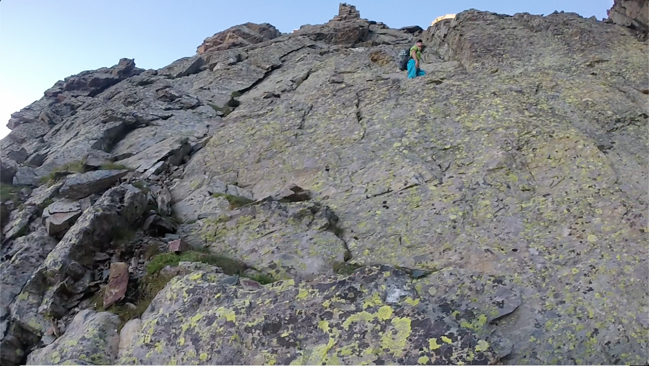 Dal Colletto Guillemin, si devia verso W per una decina di metri, ma poi si sale su belle placche coricate con appigli cercando di stare più verso la cresta SW, onde evitare di andare troppo a W dove le placche sono lisce ed esposte. Con facile arrampicata (I/II) si arriva alla dorsale di cresta per sfasciumi fino alla cima. Dalla cima si scende sul versate opposto dove occorre calarsi in doppia. Ci sono 2 opzioni: 1) sosta su un terrazzino, corda da 60 m e calarsi (terreno sfasciumoso col rischio di tirare giù pietre) 2) consigliata: scendere di qualche metro in un camino in cassato, spit per assicurarsi e doppio anello per calarsi (15 m: è sufficiente corda da 30).